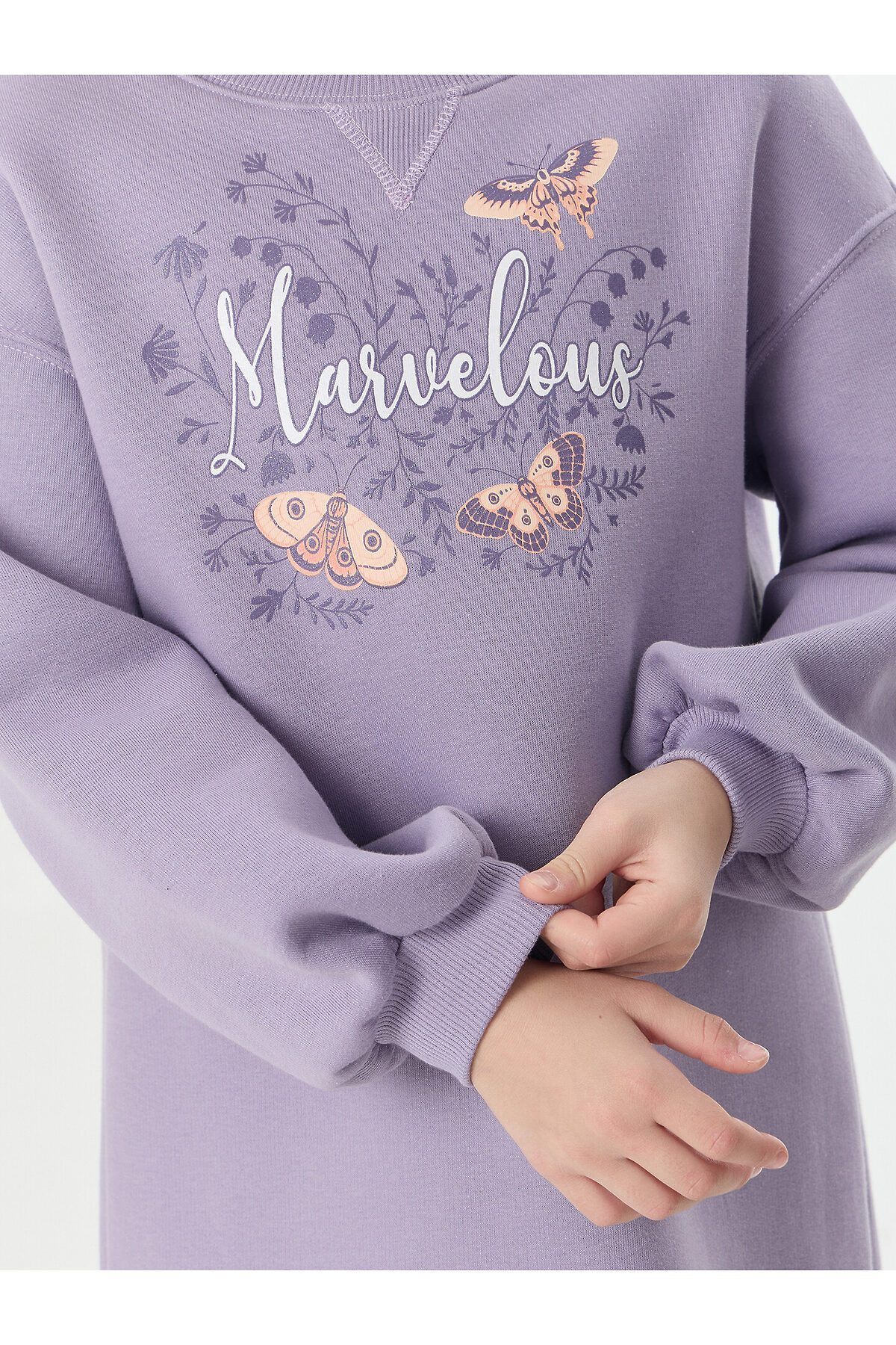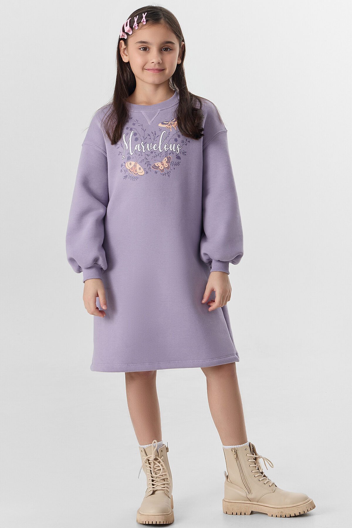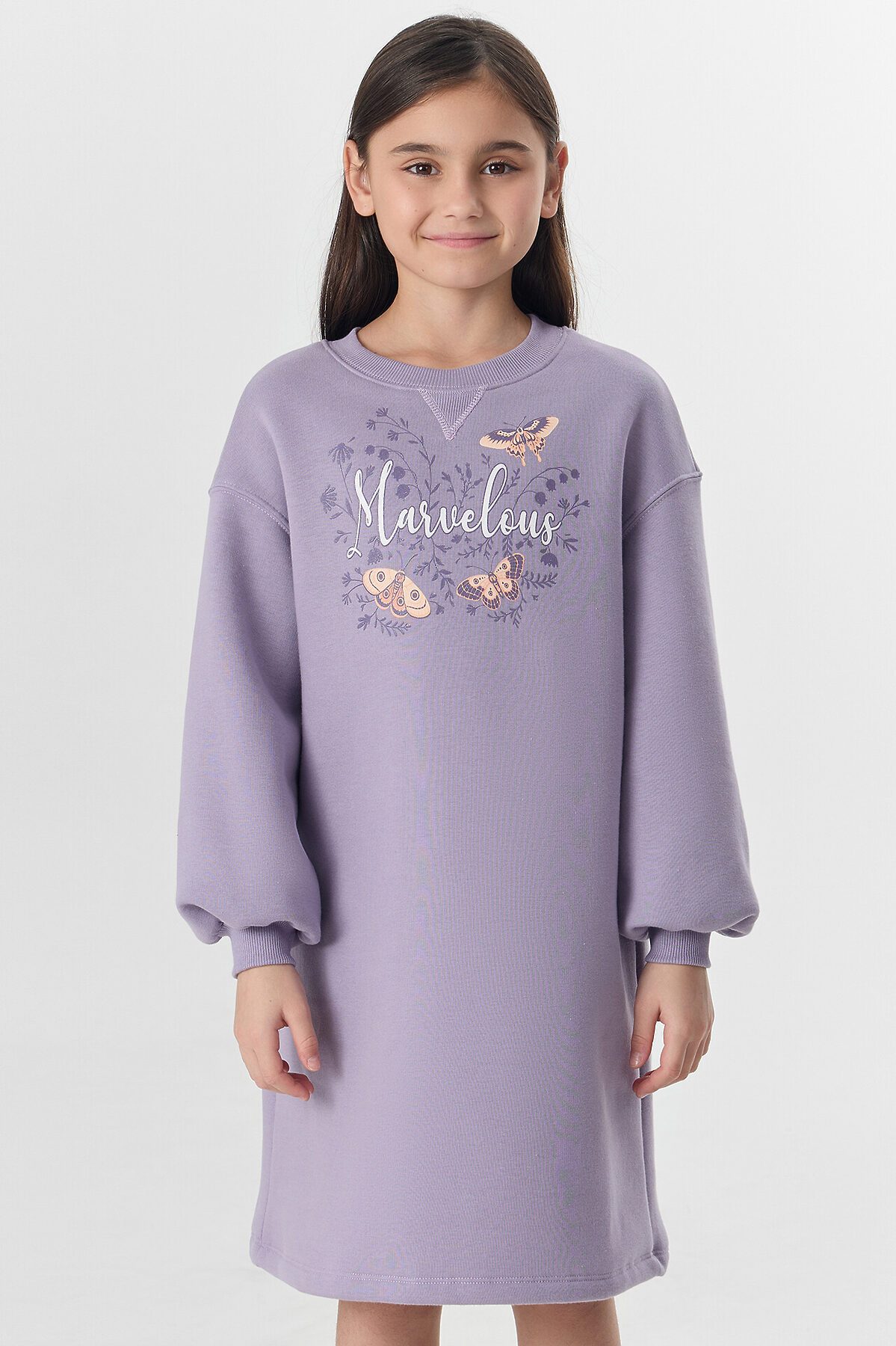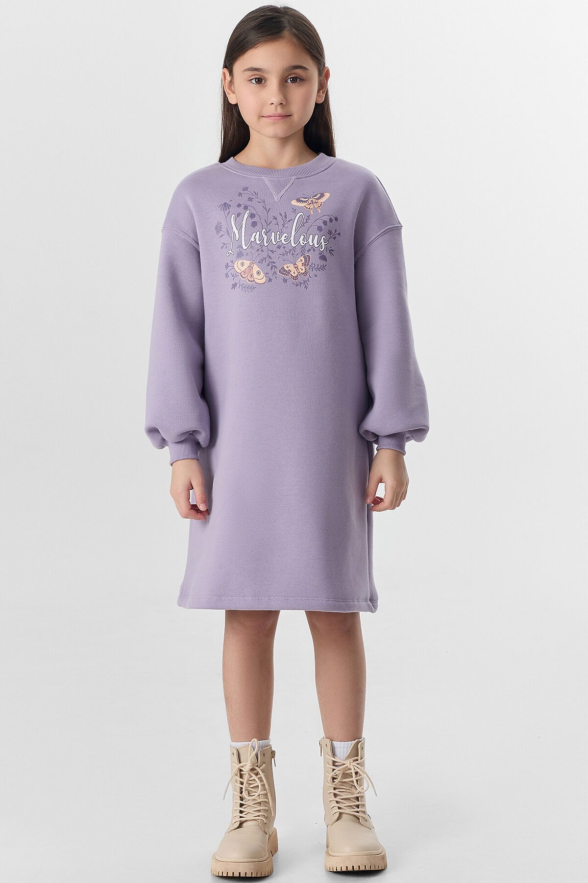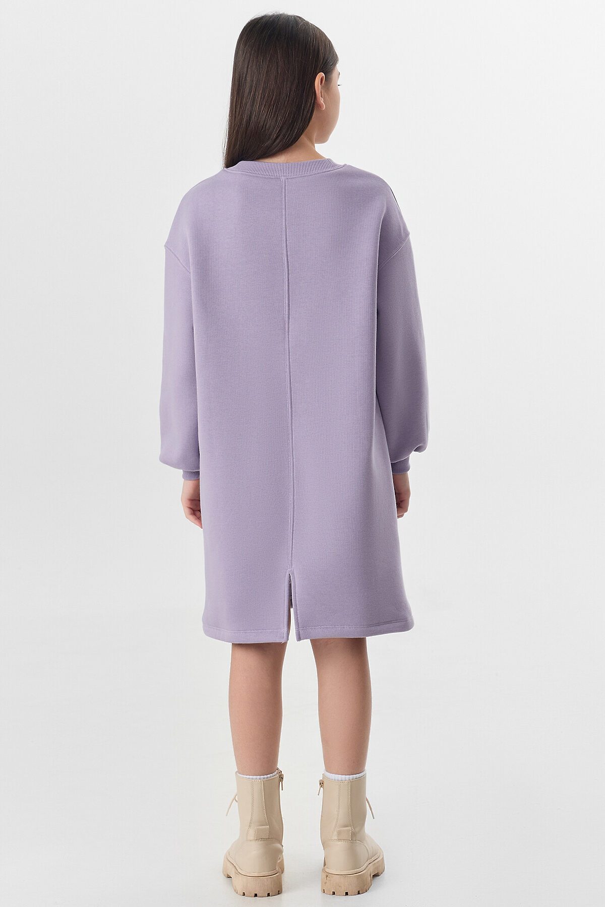 Платье свободного силуэта. Горловина круглой формы обработана обтачкой из рибаны. Шов притачивания рибаны распошит. Рукава длинные, втачные, внизу на сборке. Линия плеча спущена. По низу рукавов притачные манжеты из рибаны. Центральный шов по спинке с разрезом снизу. Низ изделия обработан на 2-х игольной плоскошовной машине швом в подгибку. Длина платья выше колена.