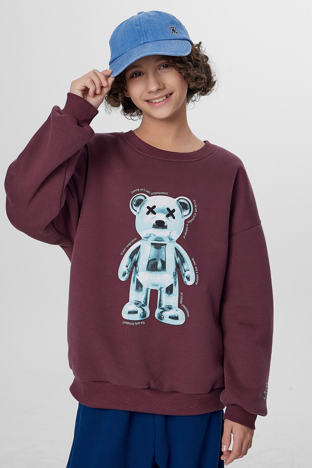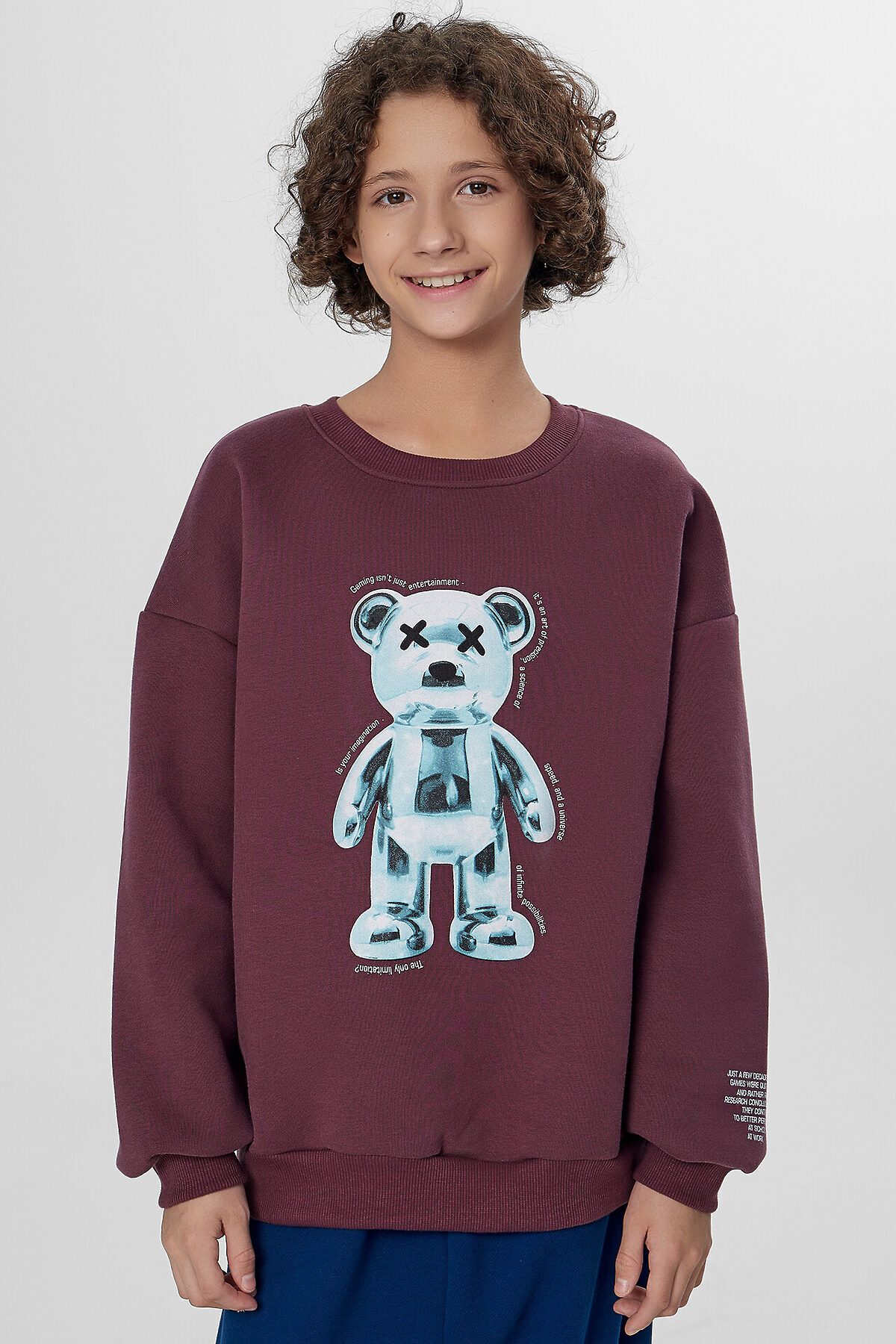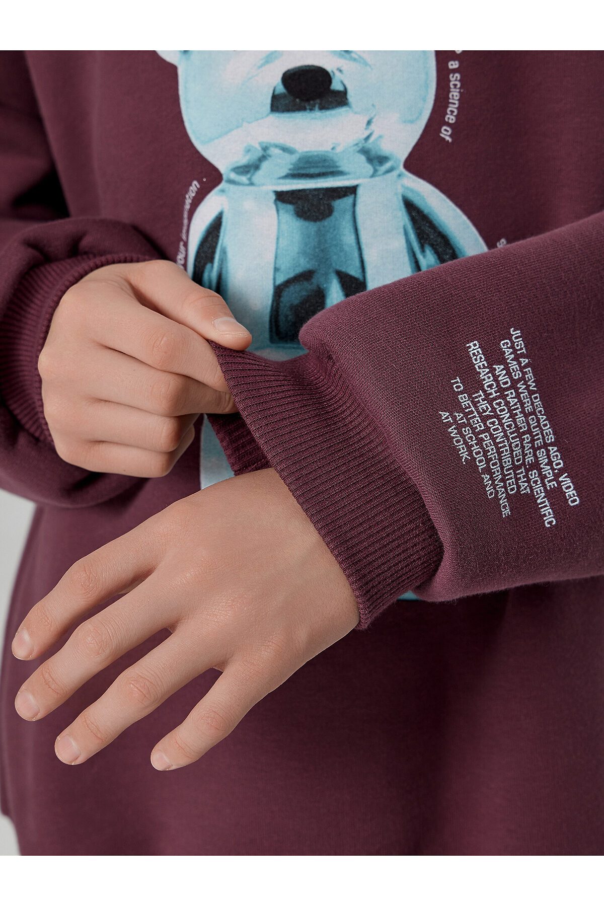 Свитшот свободного силуэта. Рукава длинные, втачные. Линия плеча спущена. Перед и спинка цельнокроенные. Горловина круглой формы обработана обтачкой из рибаны. По низу рукавов и джемпера притачены манжеты и пояс из рибаны.