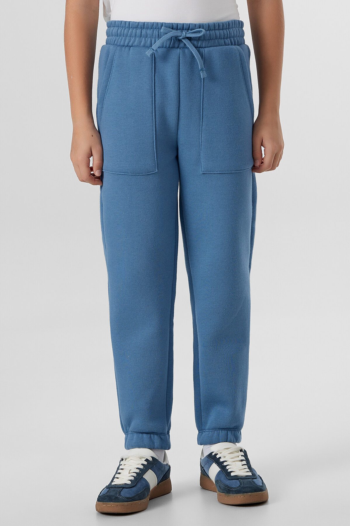 Посадка средняя. Пояс отрезной, внутрь пояса застрочена эластичная тесьма и шнур. По поясу идут две декоративные строчки. Боковые швы перенесены вперед. На передних деталях накладные карманы с наклонным входом от боковых швов. По низу изделия внутрь застрочена эластичная тесьма.
