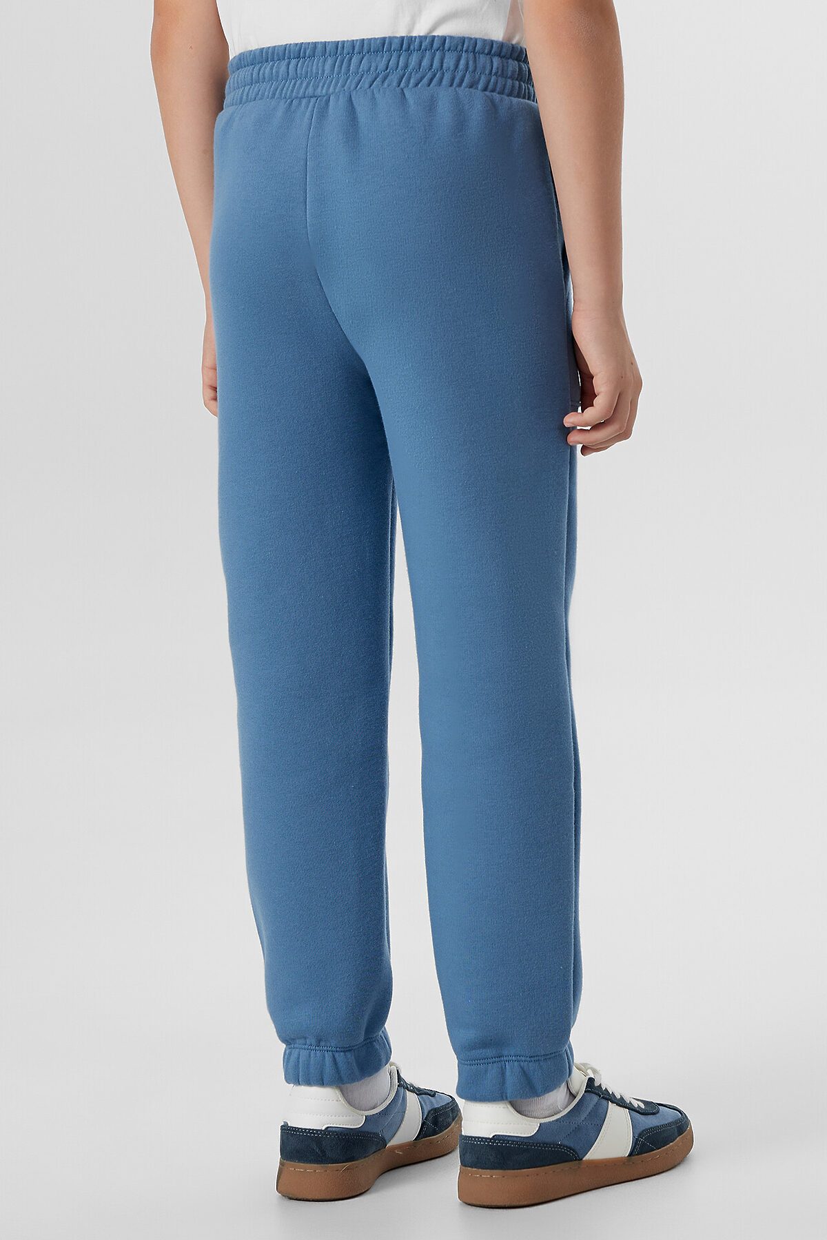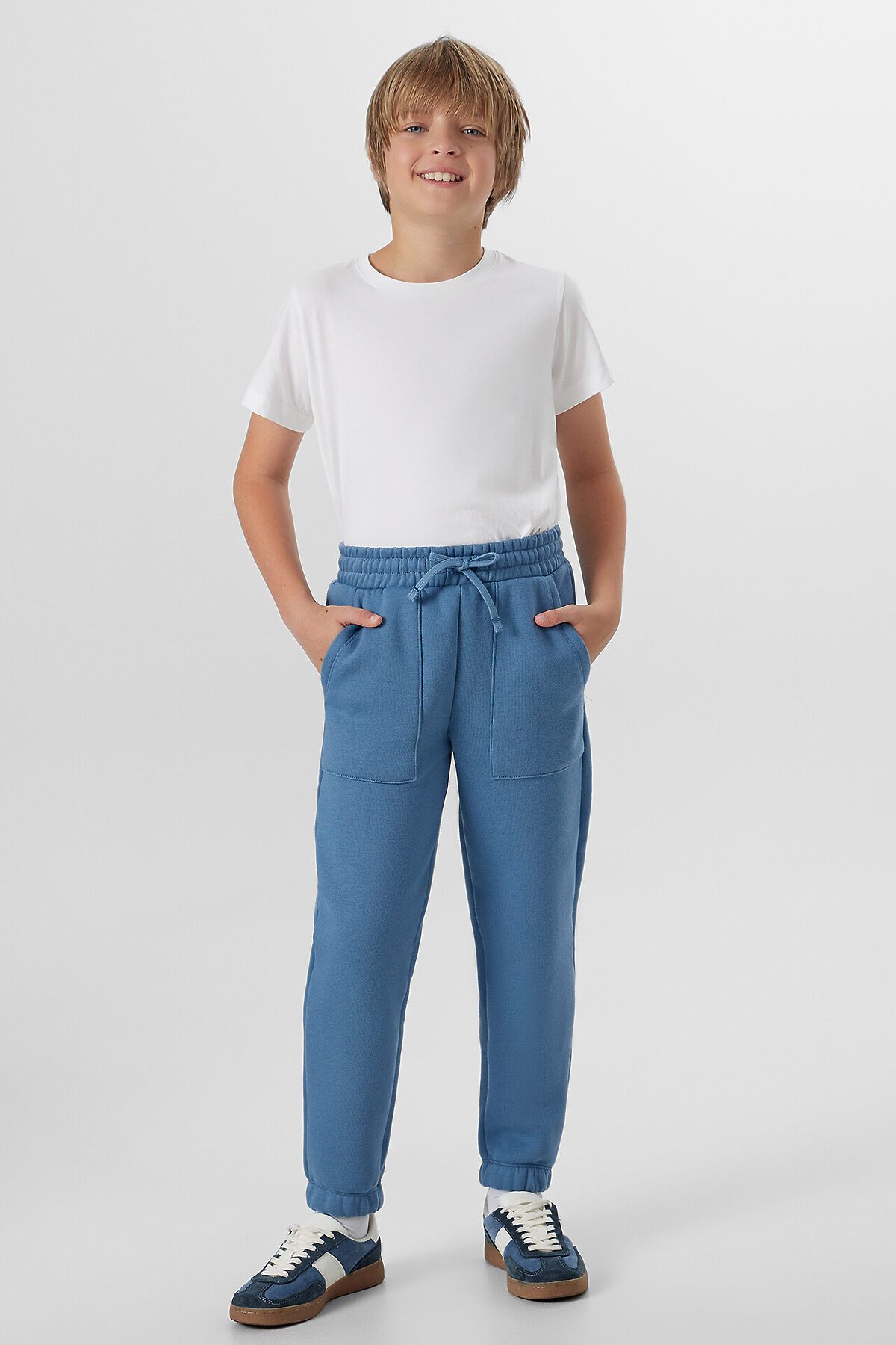 Посадка средняя. Пояс отрезной, внутрь пояса застрочена эластичная тесьма и шнур. По поясу идут две декоративные строчки. Боковые швы перенесены вперед. На передних деталях накладные карманы с наклонным входом от боковых швов. По низу изделия внутрь застрочена эластичная тесьма.