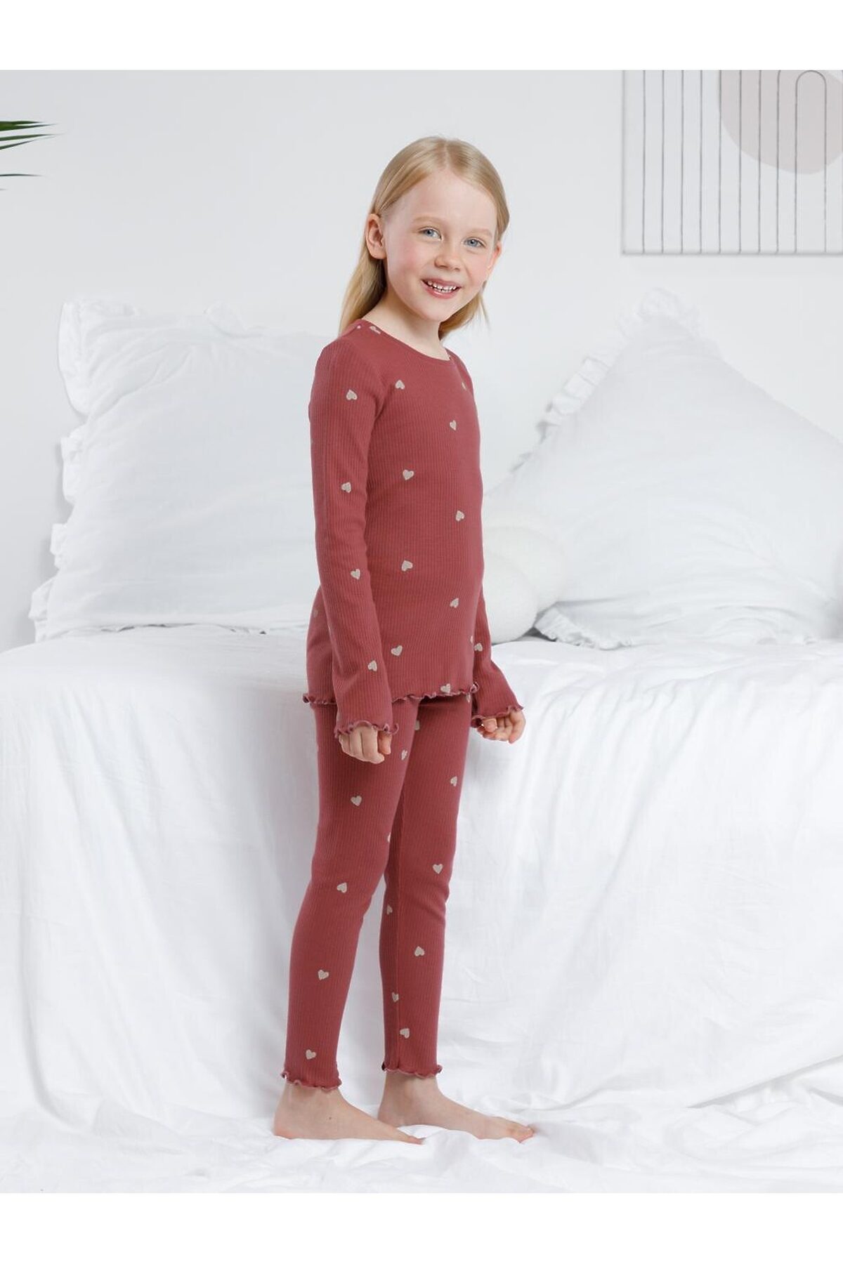 Трикотажная пижама в рубчик из натурального хлопка. Джемпер с длинными втачными рукавами и лосины с эластичной резинкой в поясе. Оригинальная набивка выполнена из стойких текстильных гипоаллергенных красителей. Изделие сохраняет цвет и форму после многократных стирок. Все трикотажные полотна производятся в соответствии с нормами швейцарского сертификата ЭкоТекс.