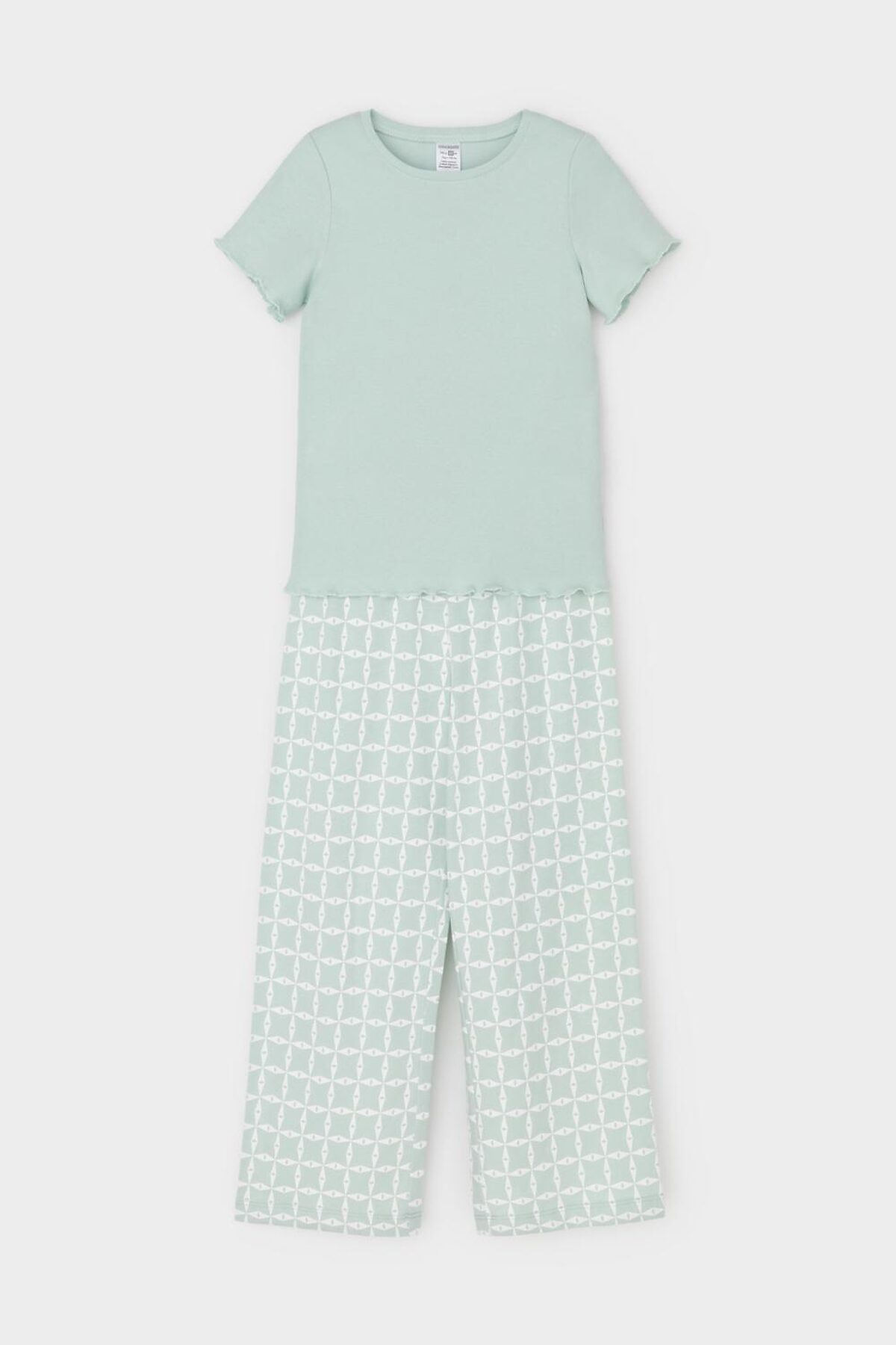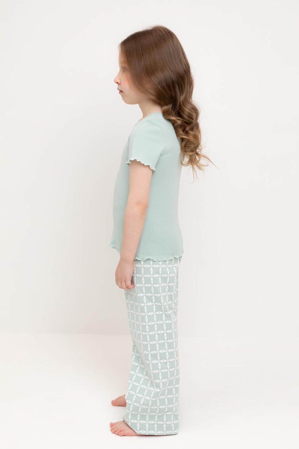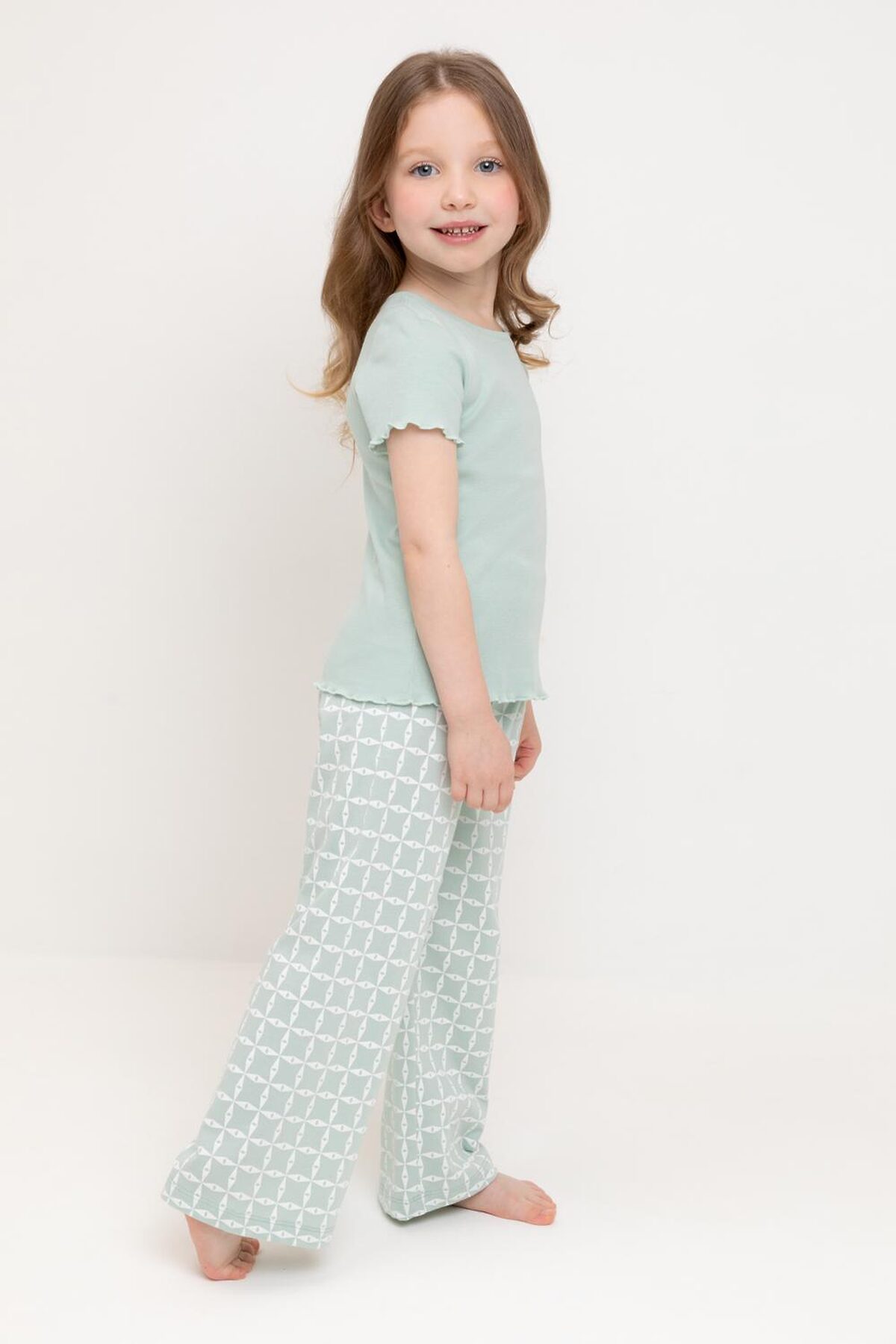 Трикотажная пижама из натурального хлопка. Футболка с короткими втачными рукавами изготовлена из эластичного трикотажа в рубчик. Брюки с эластичной резинкой в поясе выполнены из гладкого трикотажа супрем. Оригинальная набивка выполнена из стойких текстильных гипоаллергенных красителей. Изделие сохраняет цвет и форму после многократных стирок. Все трикотажные полотна производятся в соответсвии с нормами швейцарского сертификата ЭкоТекс.