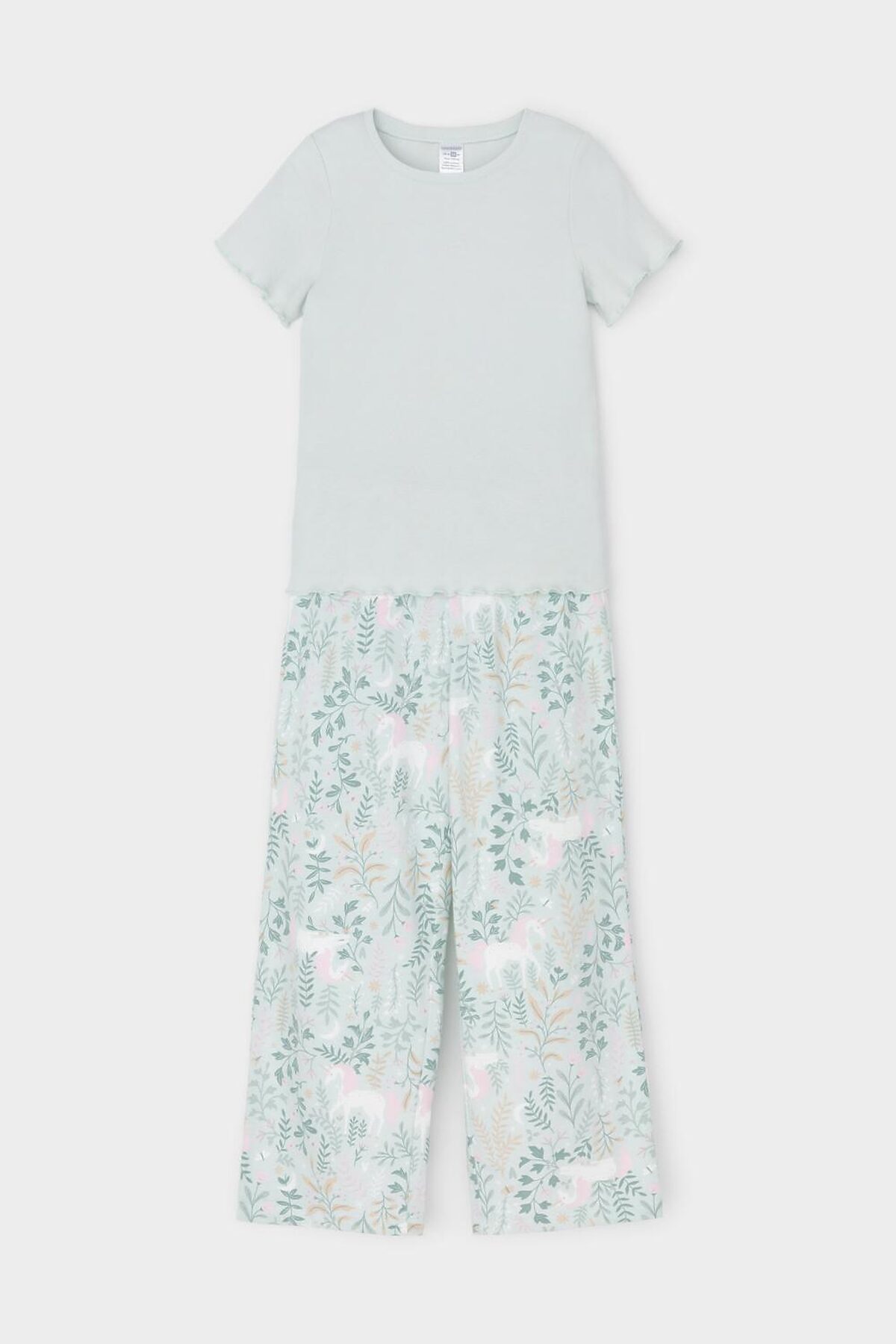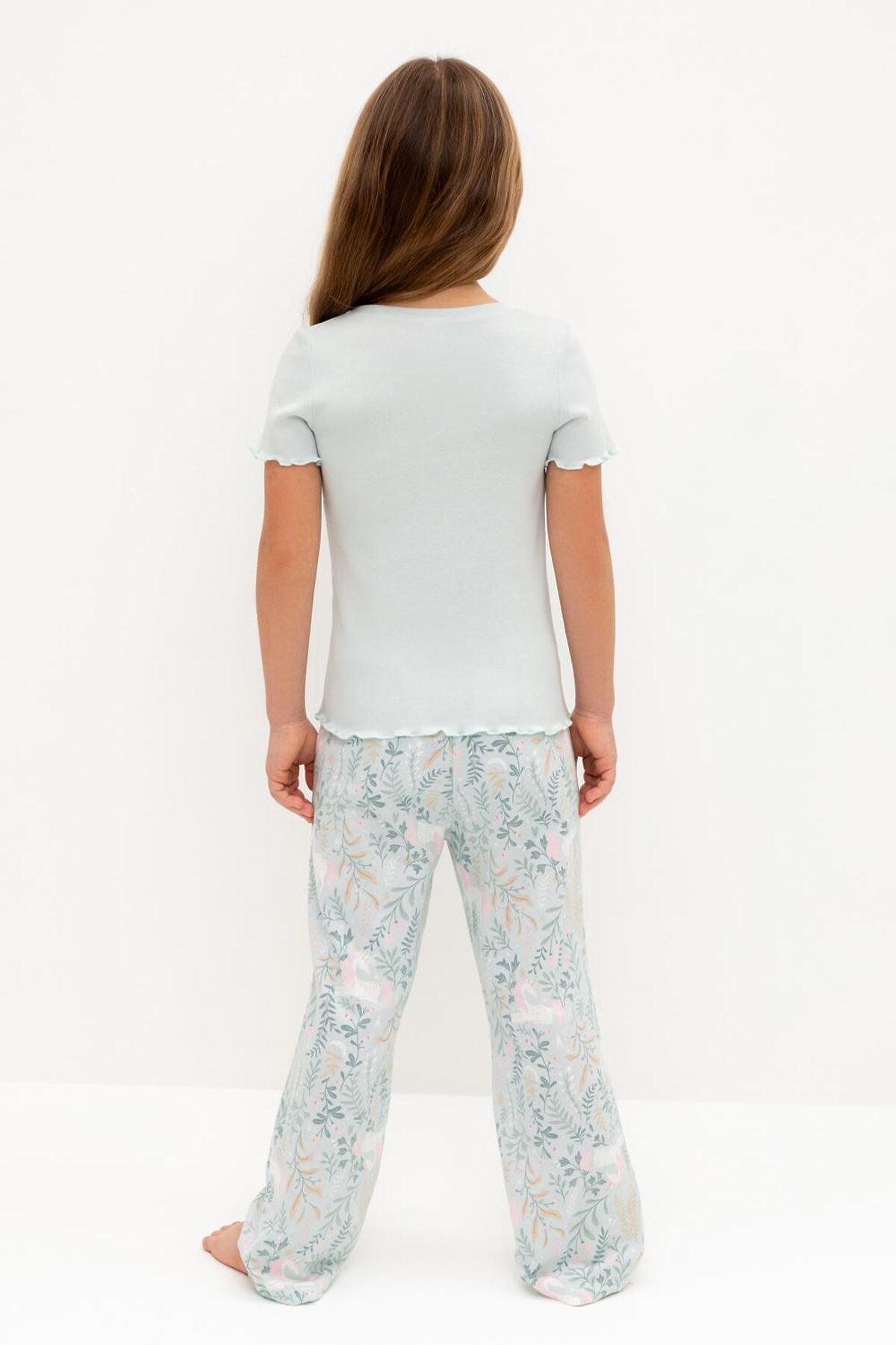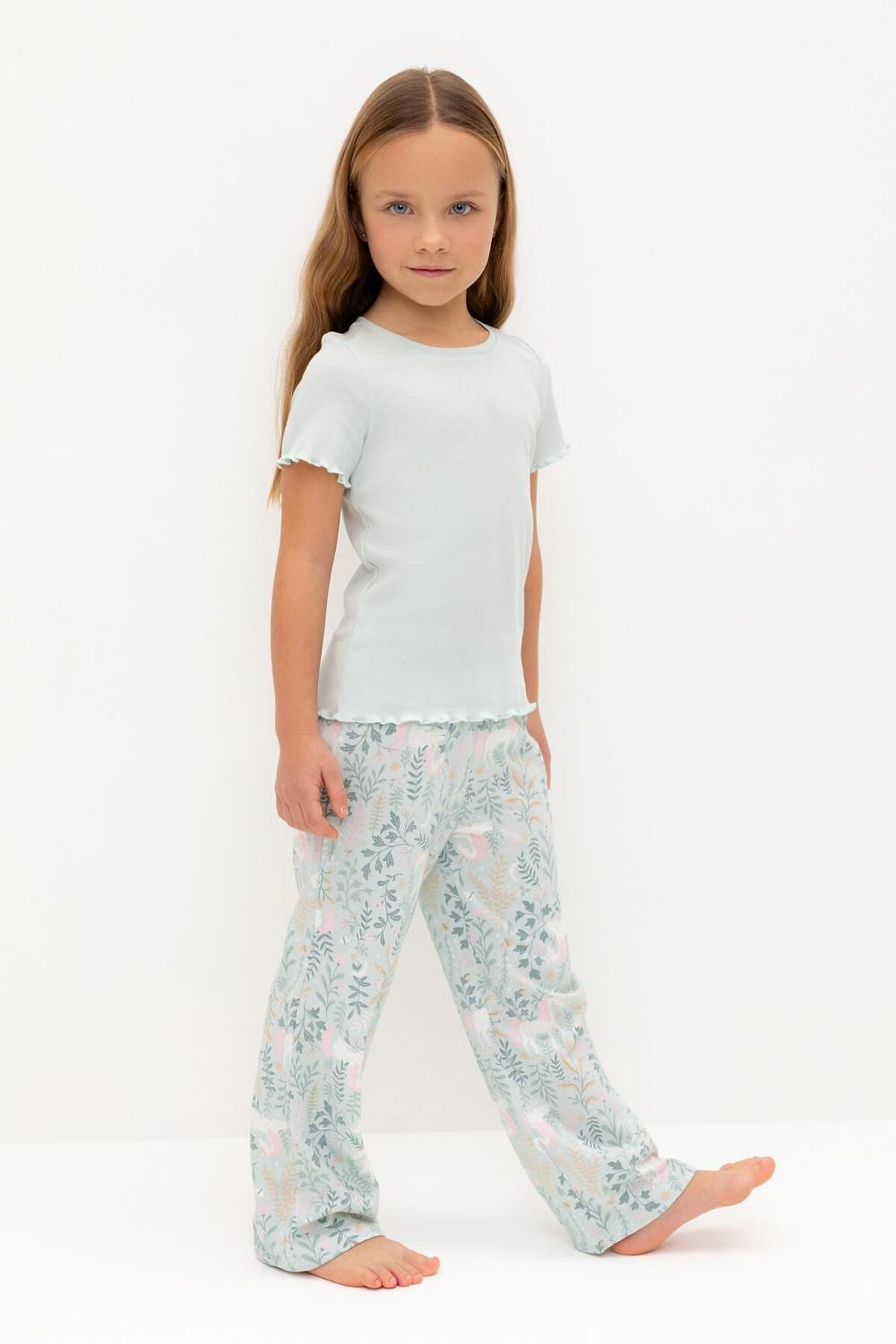 Трикотажная пижама из натурального хлопка. Футболка с короткими втачными рукавами изготовлена из эластичного трикотажа в рубчик. Брюки с эластичной резинкой в поясе выполнены из гладкого трикотажа супрем. Оригинальная набивка выполнена из стойких текстильных гипоаллергенных красителей. Изделие сохраняет цвет и форму после многократных стирок. Все трикотажные полотна производятся в соответсвии с нормами швейцарского сертификата ЭкоТекс.
