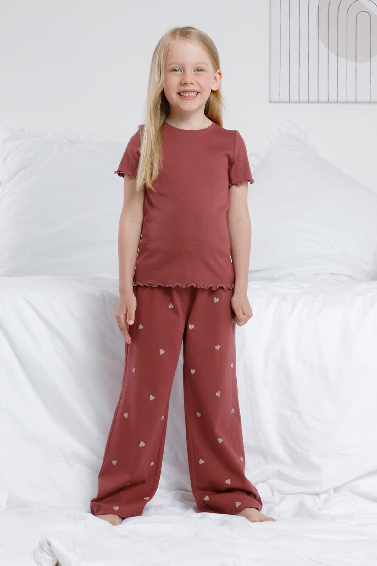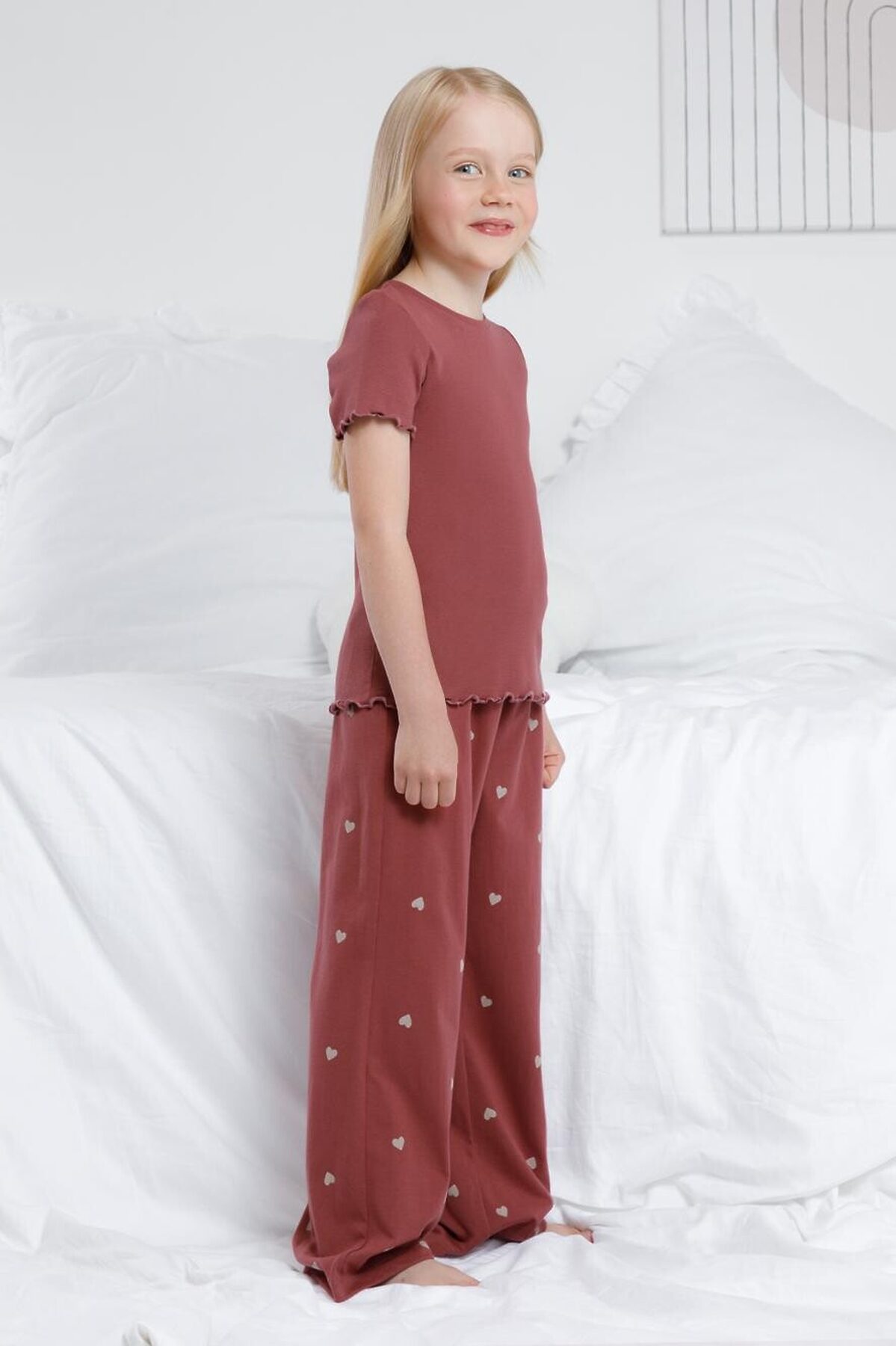 Трикотажная пижама из натурального хлопка. Футболка с короткими втачными рукавами изготовлена из эластичного трикотажа в рубчик. Брюки с эластичной резинкой в поясе выполнены из гладкого трикотажа супрем. Оригинальная набивка выполнена из стойких текстильных гипоаллергенных красителей. Изделие сохраняет цвет и форму после многократных стирок. Все трикотажные полотна производятся в соответствии с нормами швейцарского сертификата ЭкоТекс.