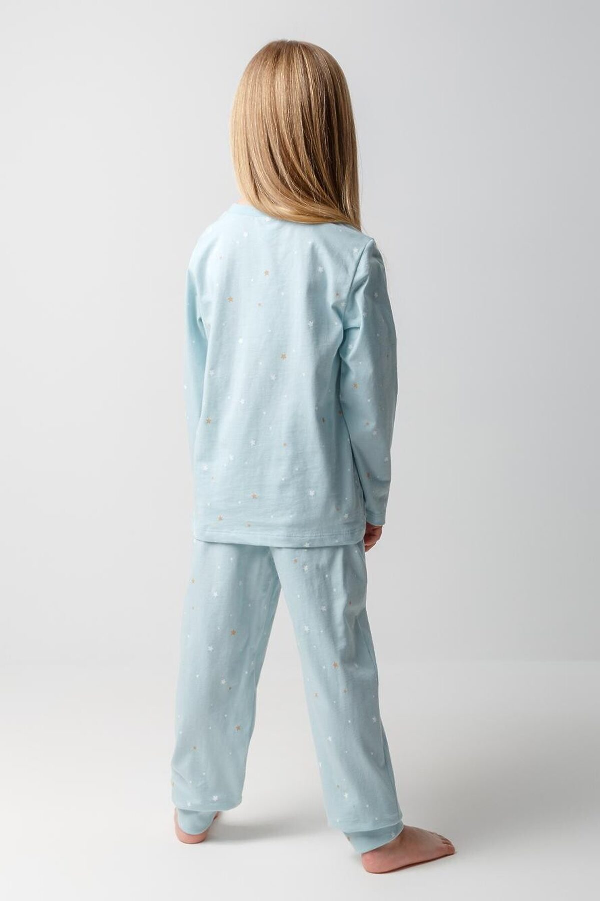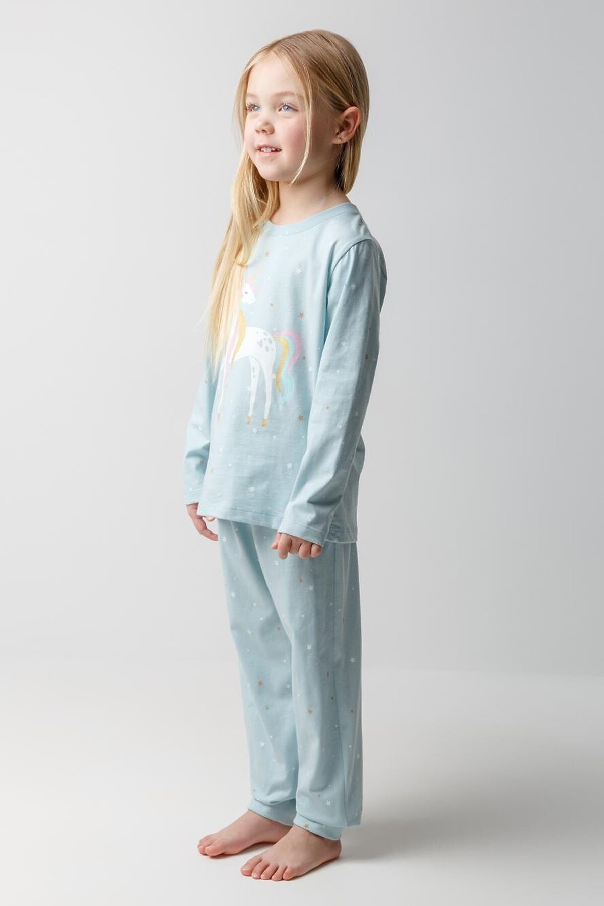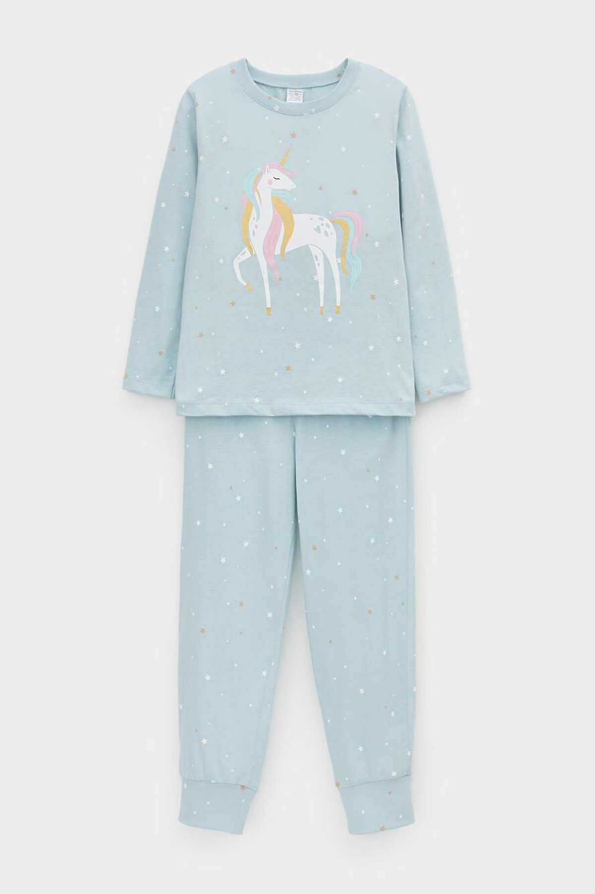 Пижама для девочки из натурального хлопка. Джемпер с длинными втачными рукавами и брюки с эластичной резинкой в поясе. Мягкие манжеты по низу брюк сделаны из материала в рубчик. Оригинальная набивка и принт выполнены из стойких текстильных гипоаллергенных красителей. Изделие сохраняет цвет и форму после многократных стирок. Все трикотажные полотна производятся в соответствии с нормами швейцарского сертификата ЭкоТекс.