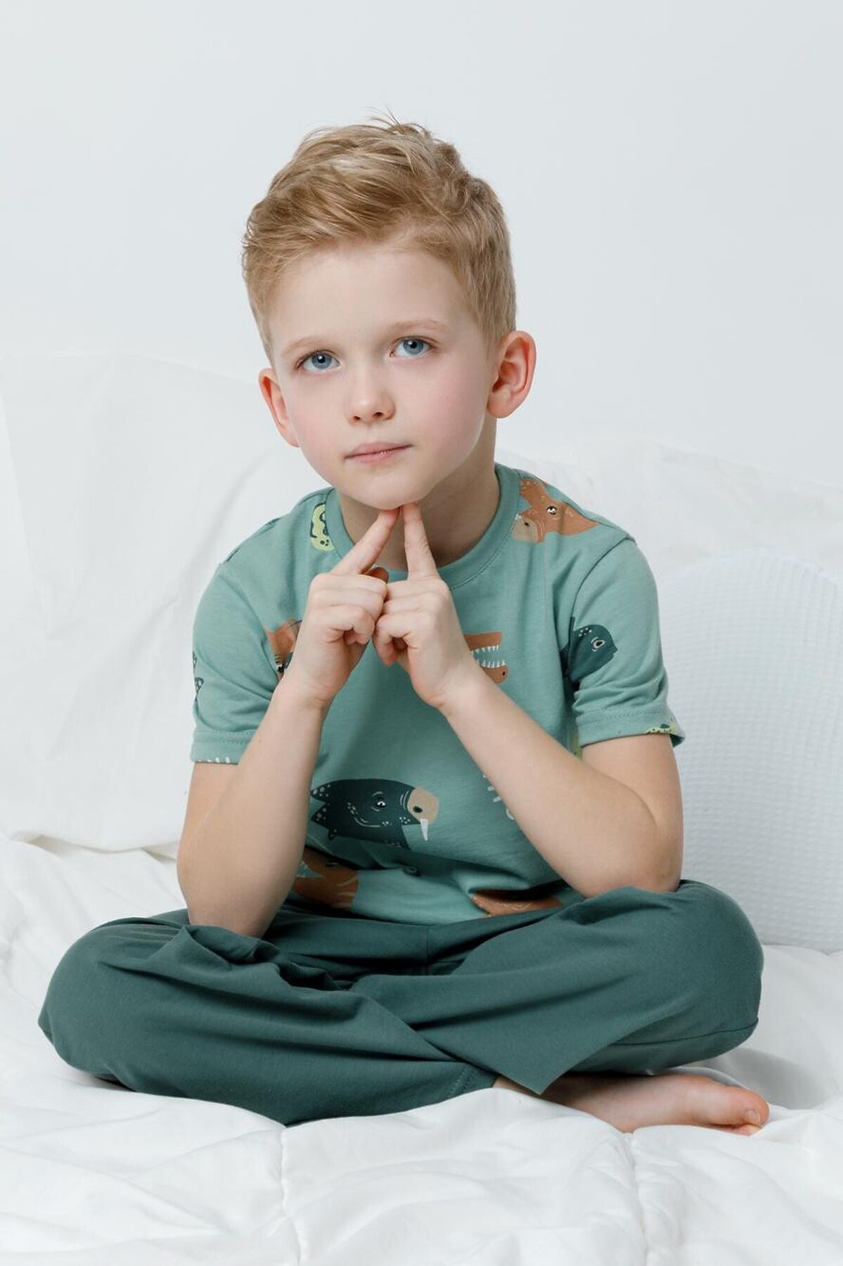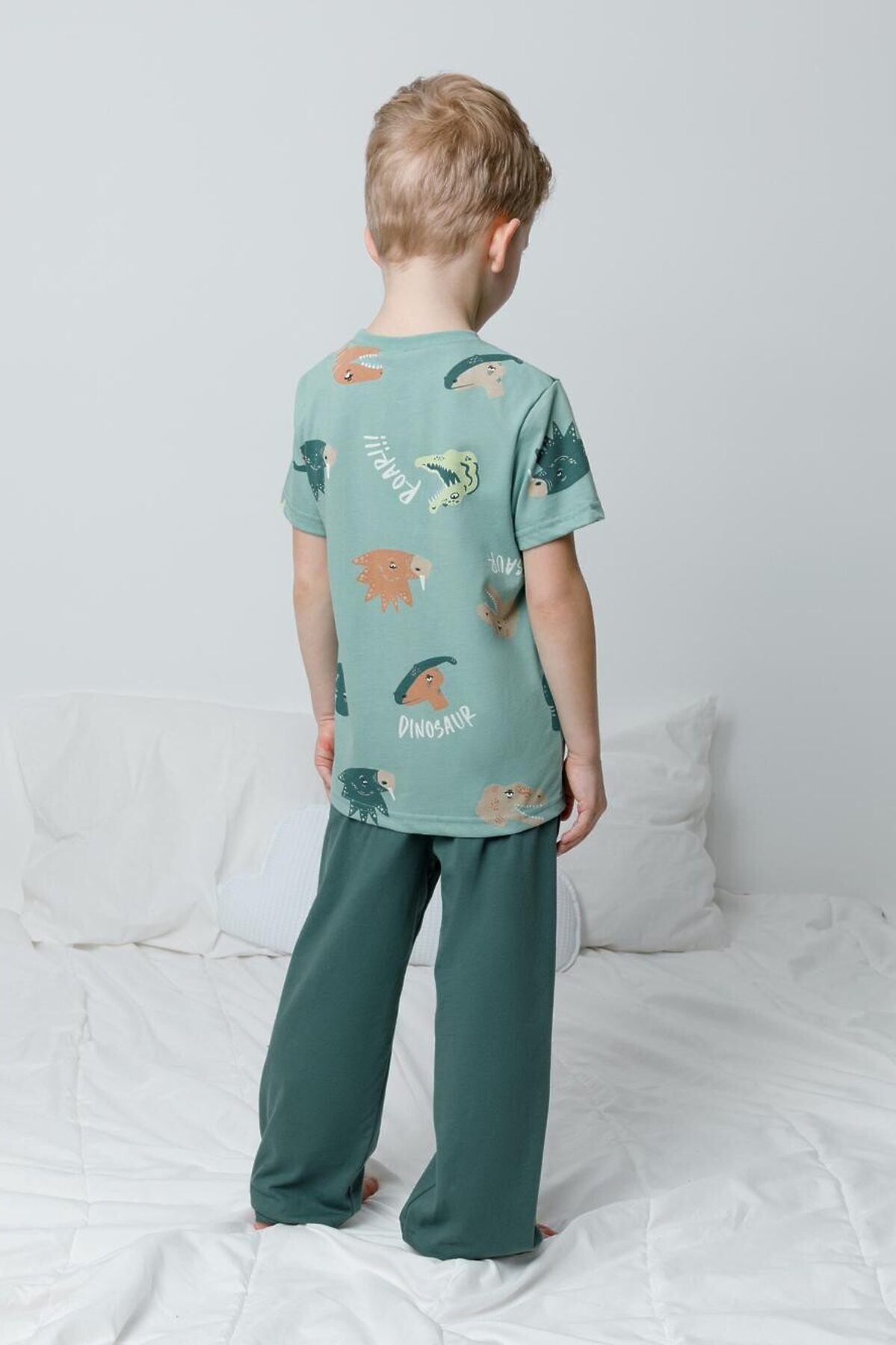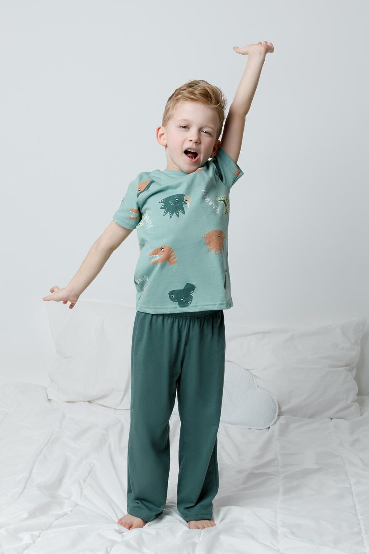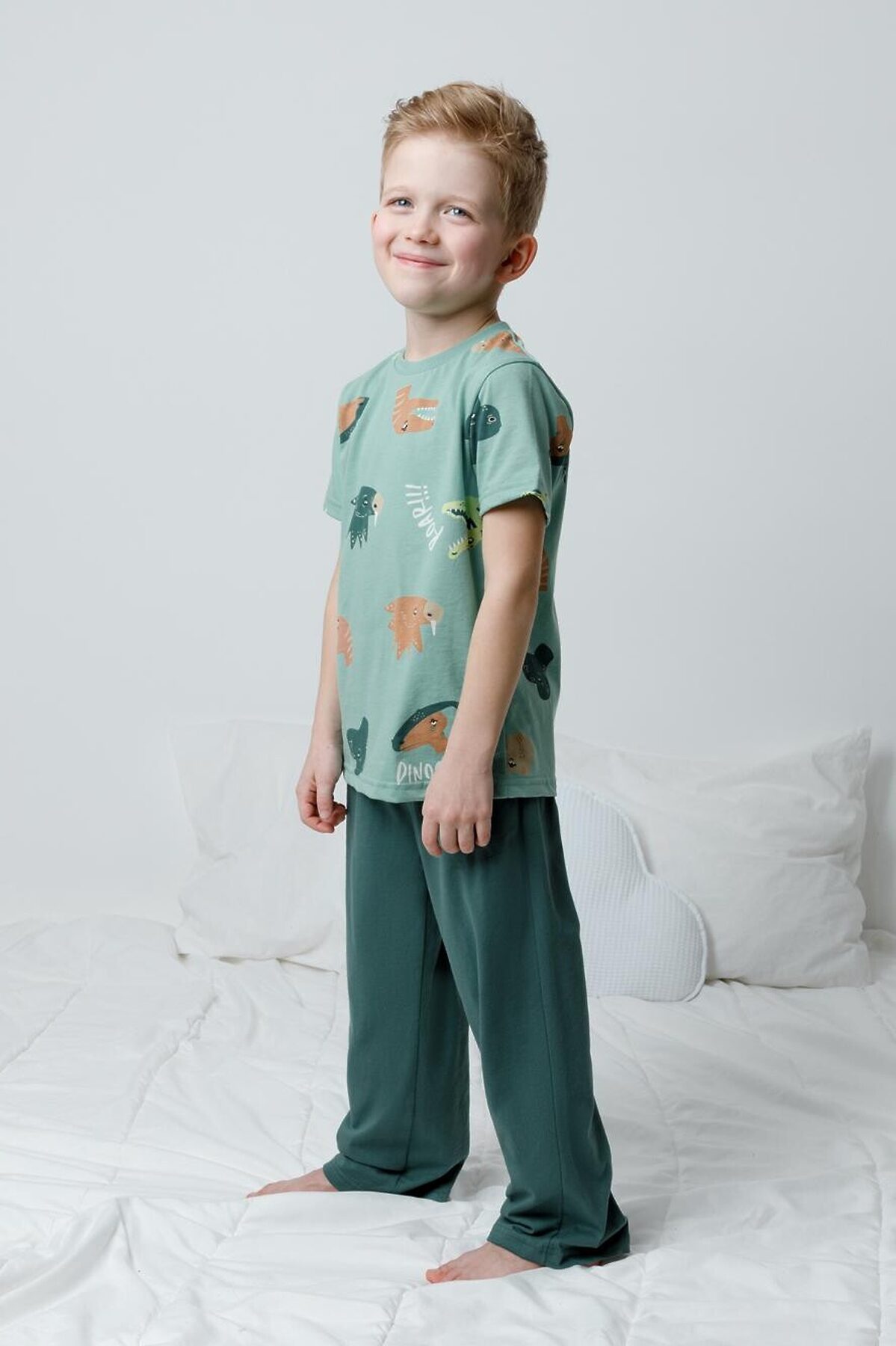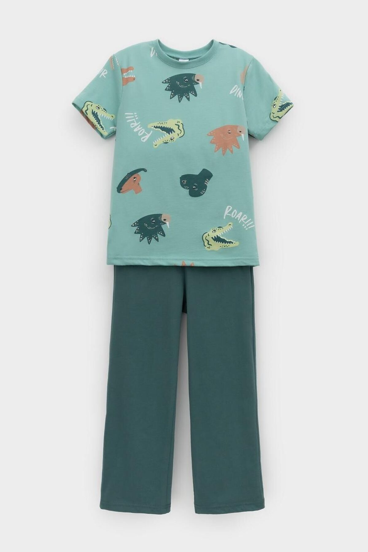Трикотажная пижама из натурального хлопка. Футболка с короткими втачными рукавами и прямые брюки с эластичной резинкой в поясе. Оригинальная набивка выполнена из стойких гипоаллергенных текстильных гипоаллергенных красителей. Изделие сохраняет цвет и форму после многократных стирок. Все трикотажные полотна производятся в соответсвии с нормами швейцарского сертификата ЭкоТекс.