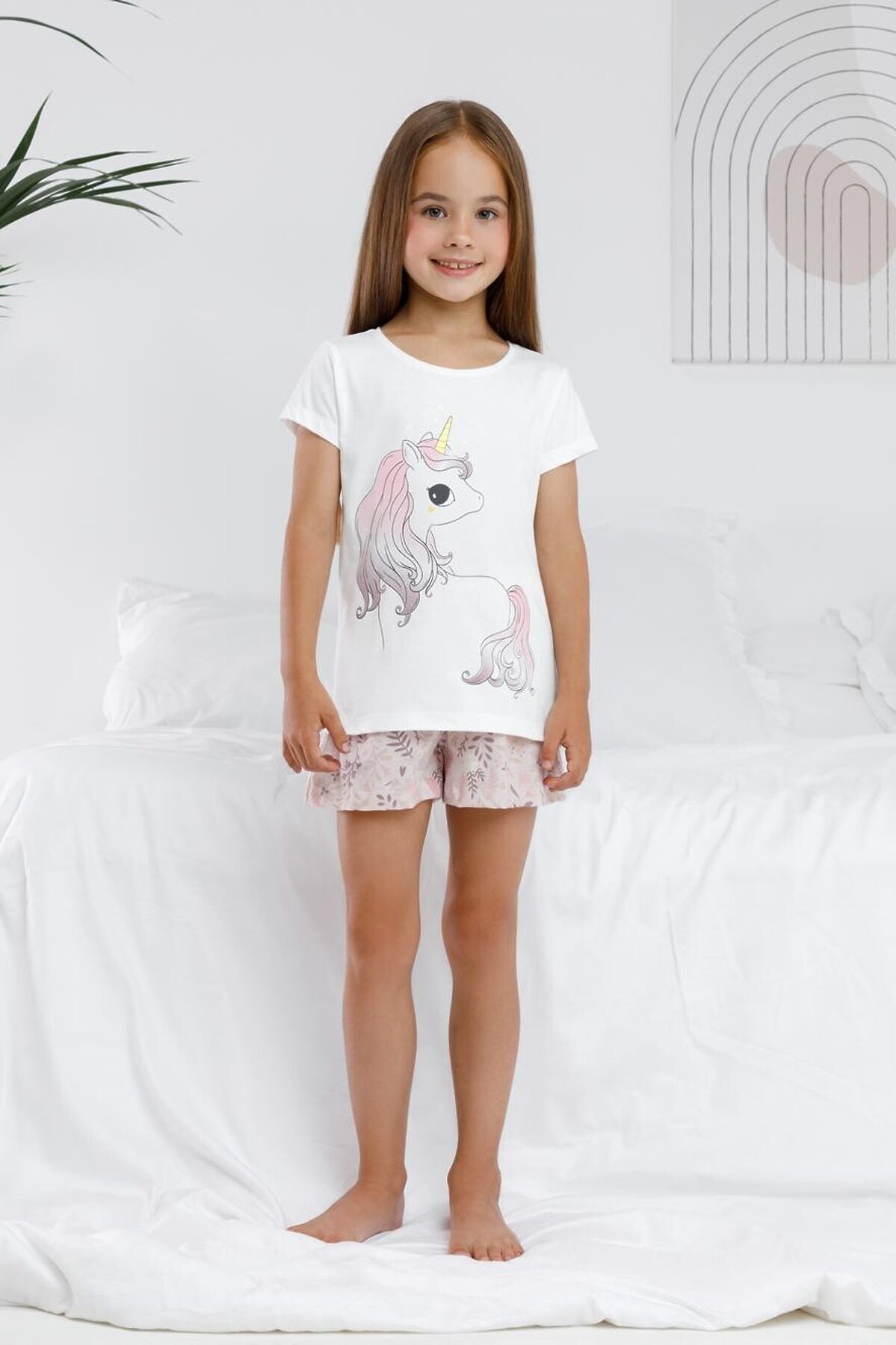 Трикотажная пижама из натурального хлопка. Футболка с принтом и короткими спущенными рукавами. У шорт в комплекте мягкий, эластичный пояс на резинке. Оригинальная набивка выполнена из стойких, гипоаллергенных текстильных красителей. Комплект сохраняет цвет и форму после многократных стирок. Все трикотажные полотна производятся в соответсвии с нормами Швейцарского сертификата ЭкоТекс.