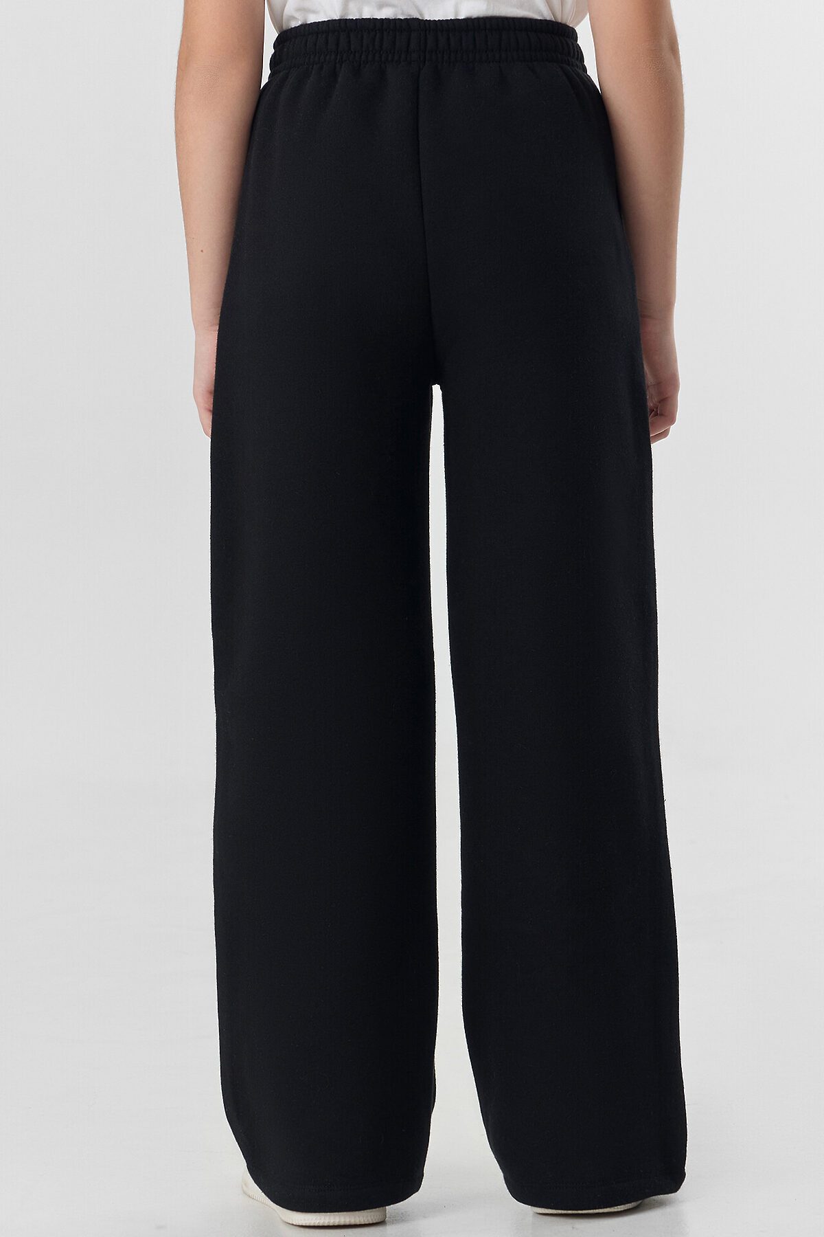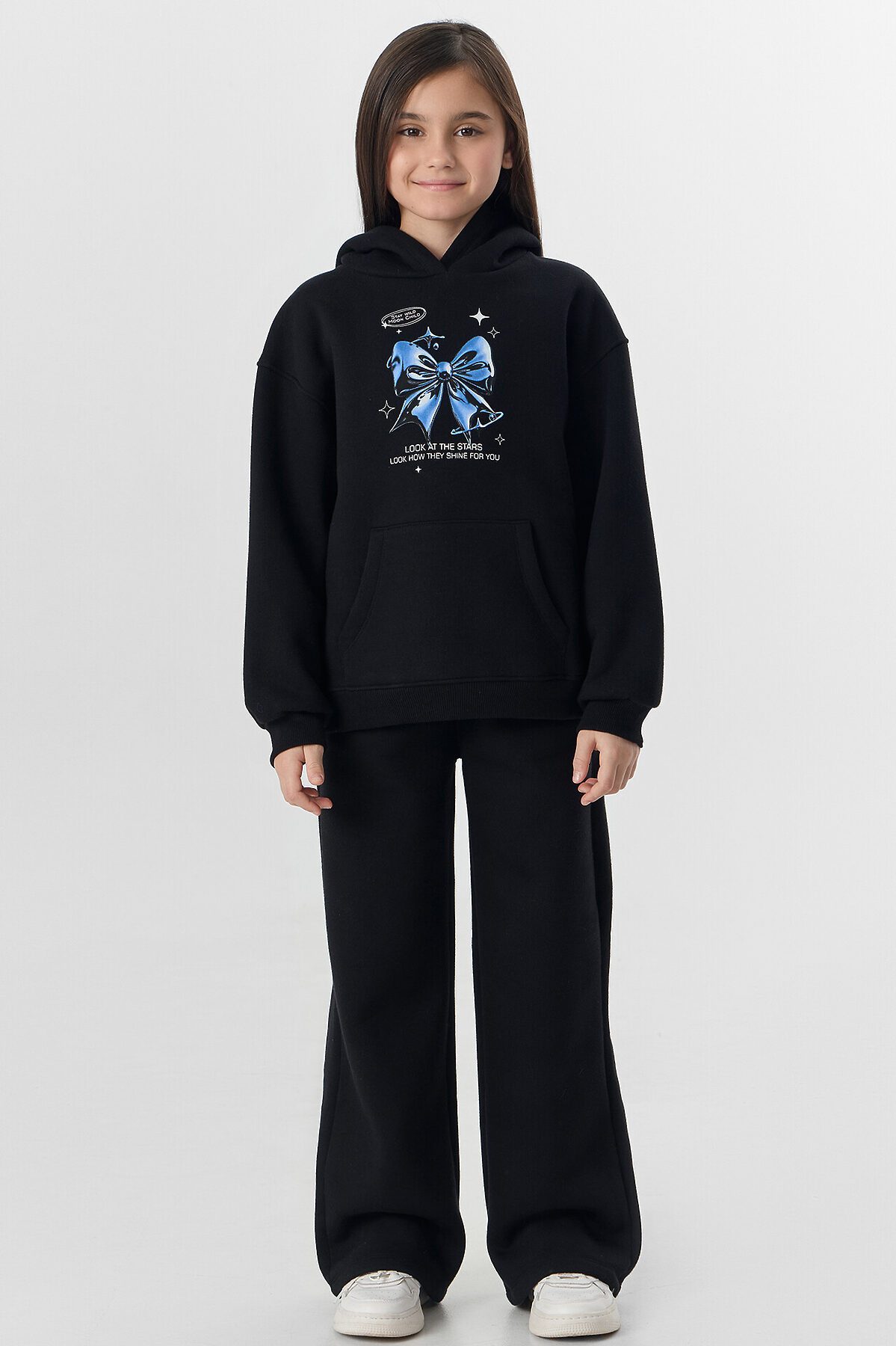 Худи для девочек, свободного силуэта (оверсайз), с капюшоном. Горловина округлой формы. Капюшон со средним швом, на подкладке из основного полотна. Шов втачивания капюшона закрыт хб тесьмой. Плечо спущено, рукав втачной длинный. По низу рукава отрезная манжета из рибаны. Пояс отрезной из рибаны, отстрочен. По переду карман кенгуру. Брюки для девочек, прямого силуэта. Пояс цельнокроеный с втачной эластичной тесьмой RV40. Пояс прострочен двумя отделочными строчками. По переду обработаны карманы в швах. Низ брюк обработан швом в подгибку на двухигольной плоскошовной машине.