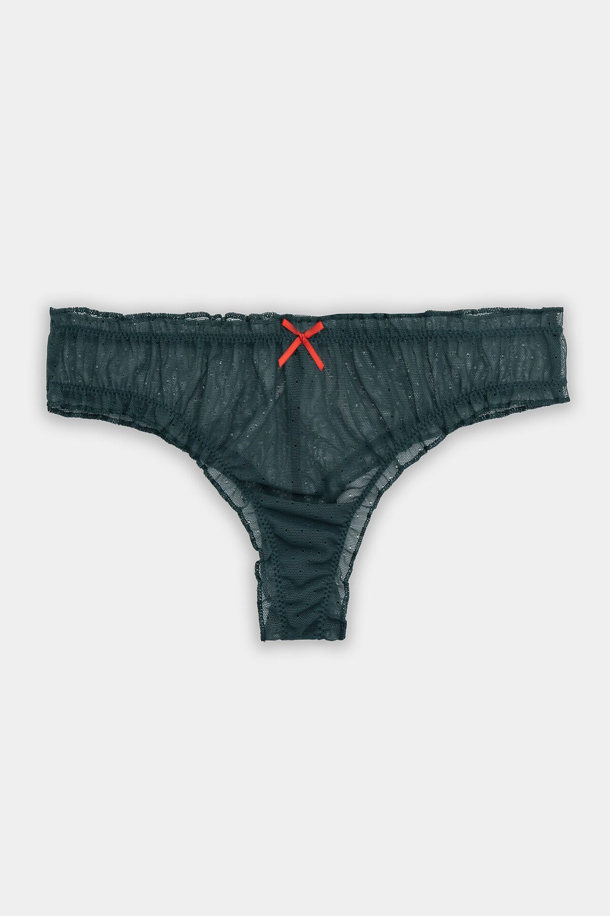 Трусы женские, средняя линия талии, силуэт - бразилиано. Передняя и задние детали выполнены из сетки. Подкладка ластовицы из хлопка, верхний срез подкладки ластовицы отлетной. По верхнему срезу трусов и по ножкам рюша из сборки, под низом жилка.