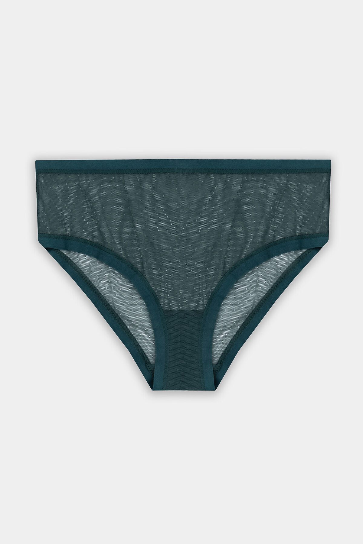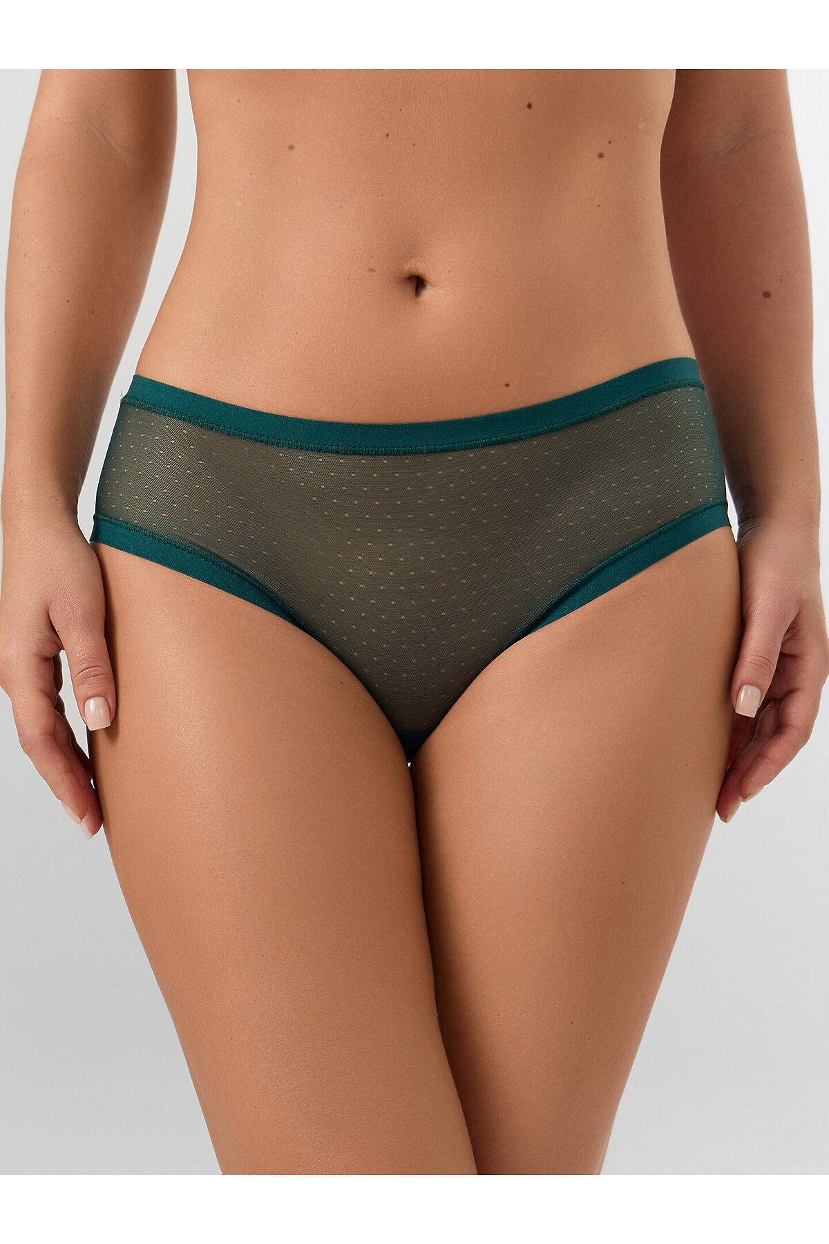 Трусы женские, силуэт - слипы, выполнены из триктажного полотна сетка с флоком. Верхние и нижние срезы обработы эл тесьмой 15мм (жилкой WT4-15, Девсел арт 13195W) на плоскошовной машине с верхним застилом. Задняя и передняя деталь цельнокроеные. Подкладка ластовицы отлетная по переду из кулирного полотна.
