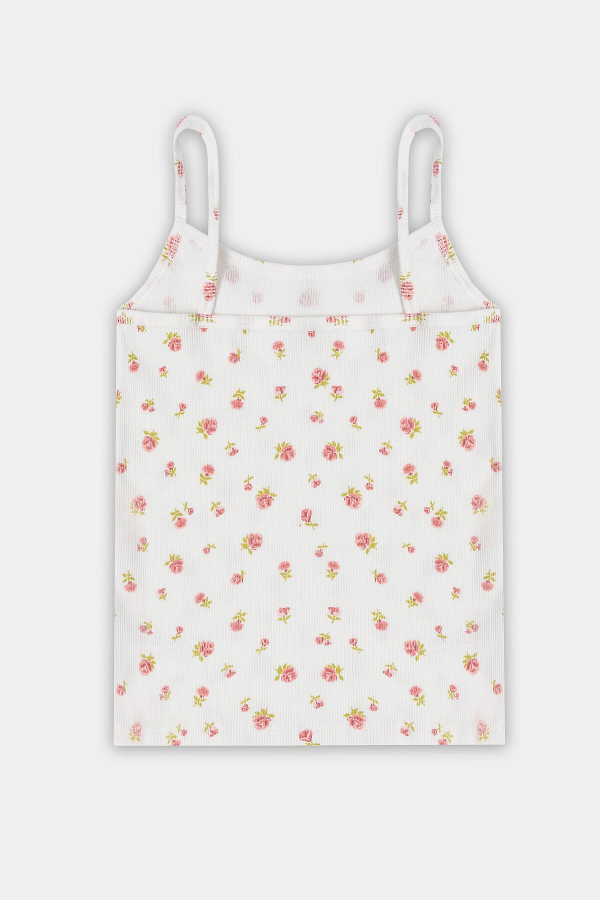 Топ прилигающего силуэта длиной чуть выше середины бедер. Верхний край спинки, бретели, срезы пройм окантовы бейкой. Перед и спинка цельнокроеные. Низ застрочен на 2-хигольной плоскошовной машине швом вподгибку с открытм срезом
