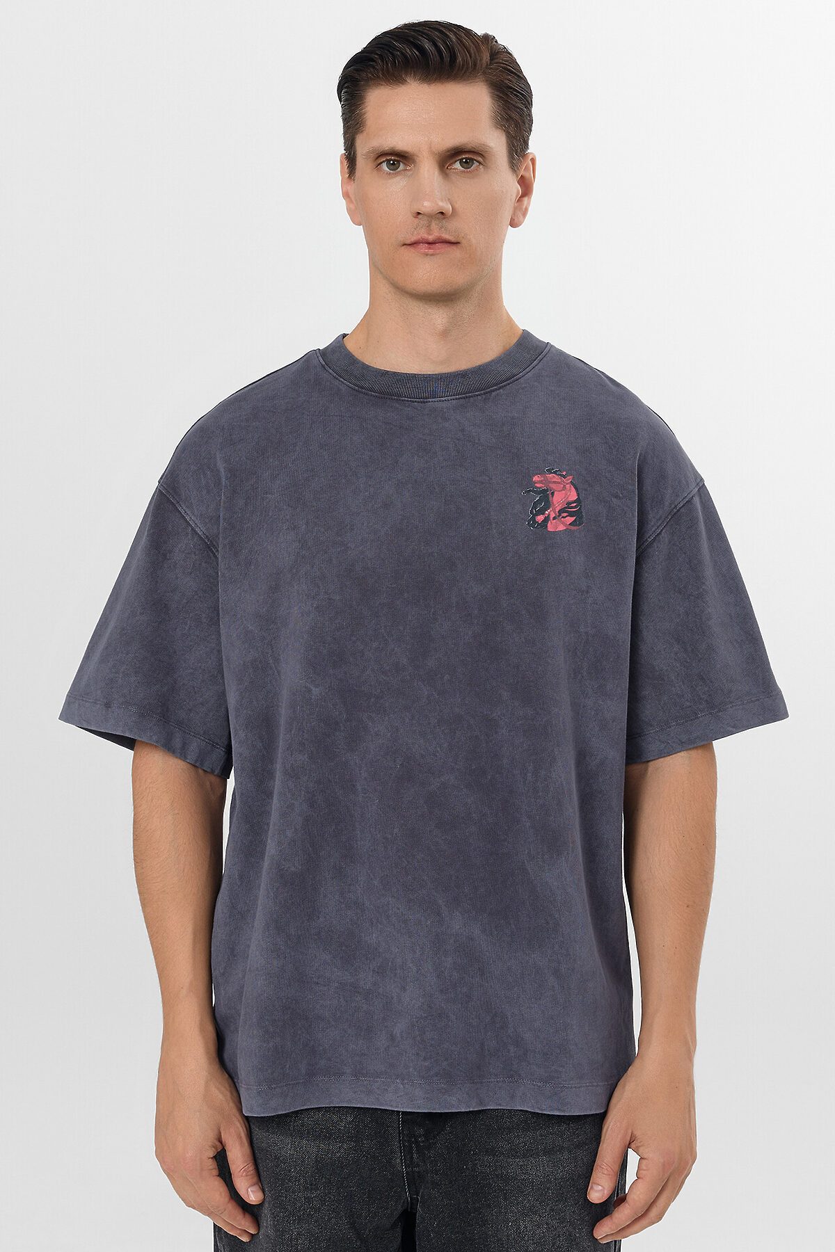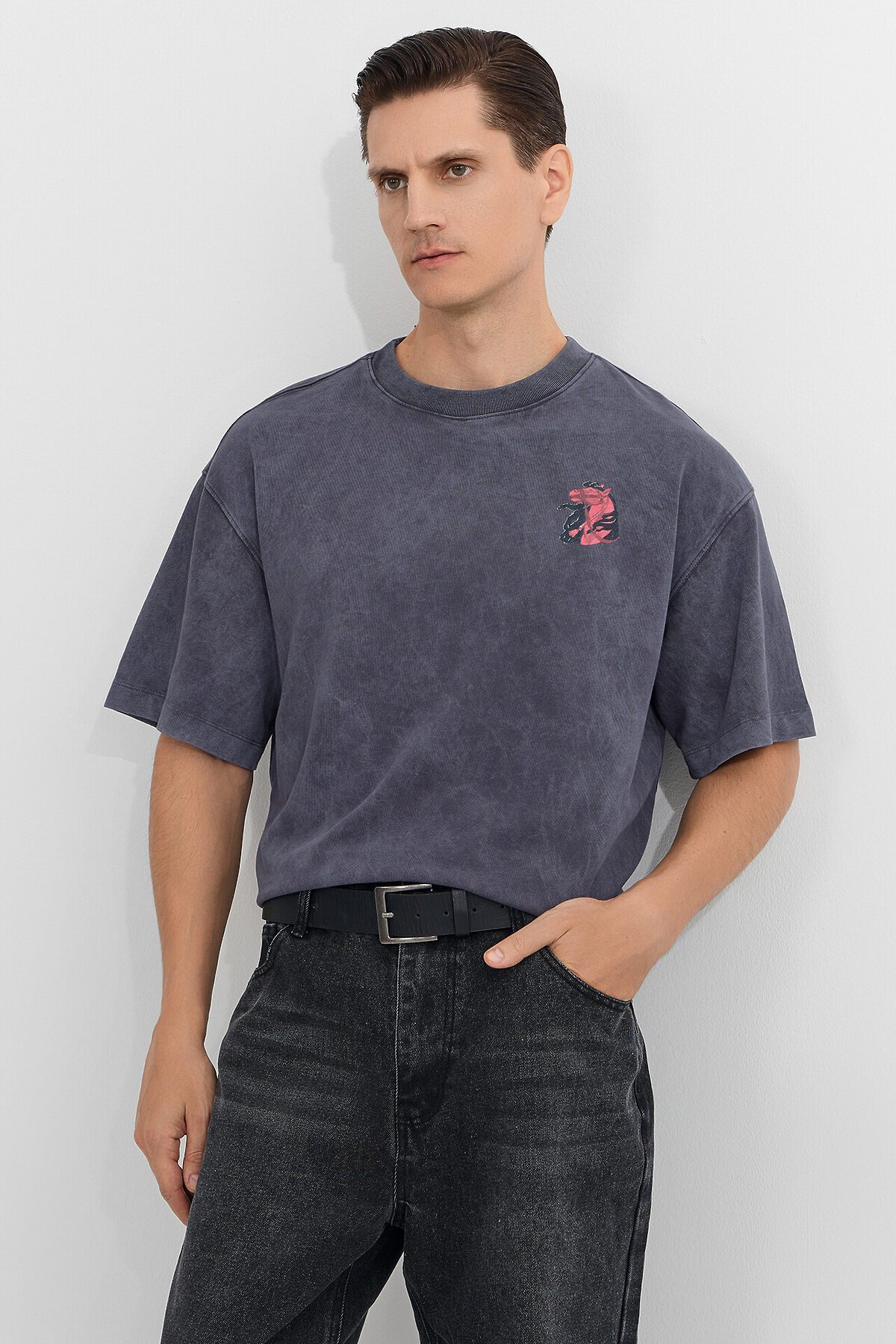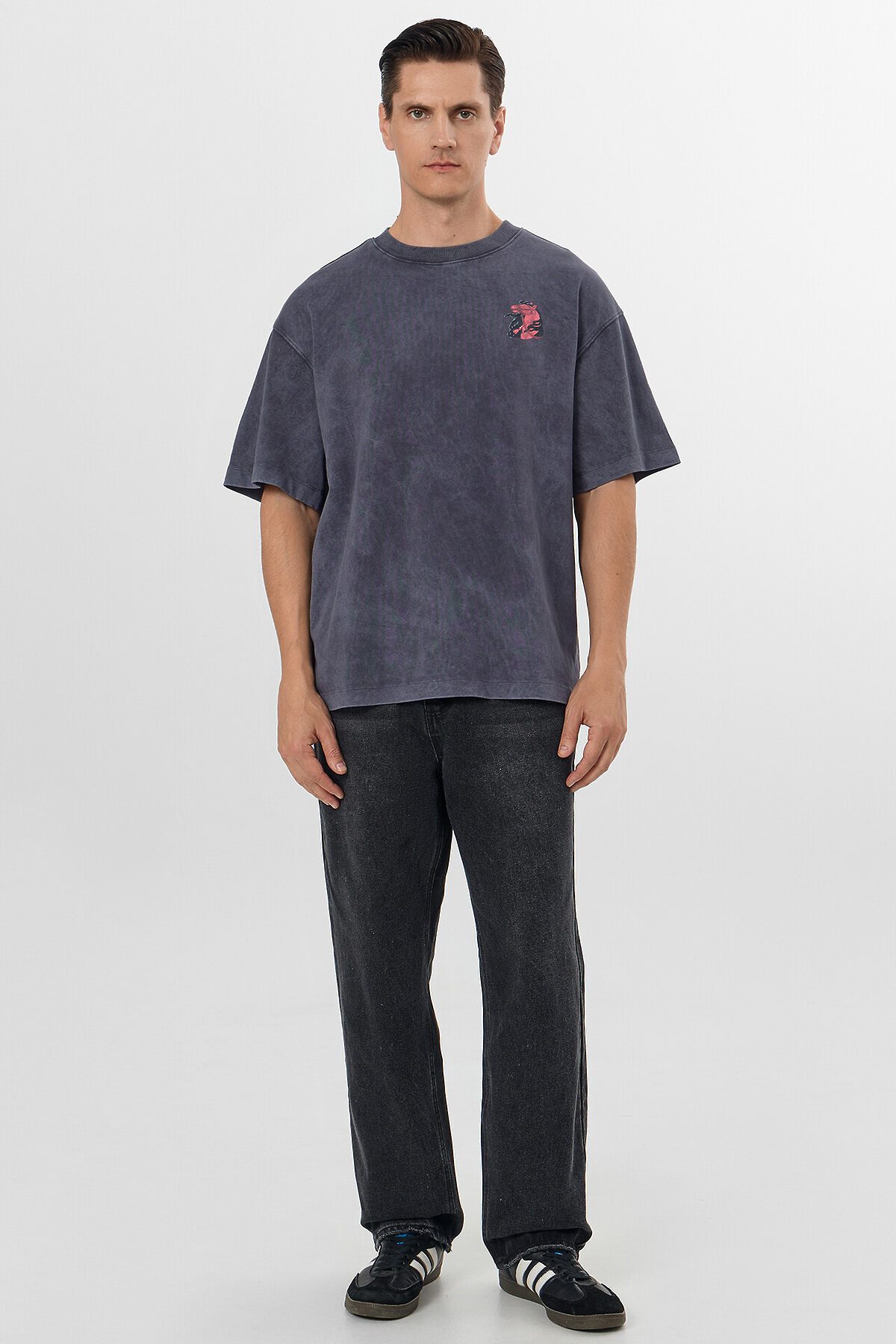 Футболка прямая свободная. Горловина округлой формы обработана обтачкой из рибаны. Шов втачивания обтачки по спинке закрыт бейкой из основного полотна. Линия плеча слегка спущена. Рукава втачные, корткие. Нижние срезы футболки и рукавов обработаны швом вподгибку на 2х шовной плоскошовной машине.