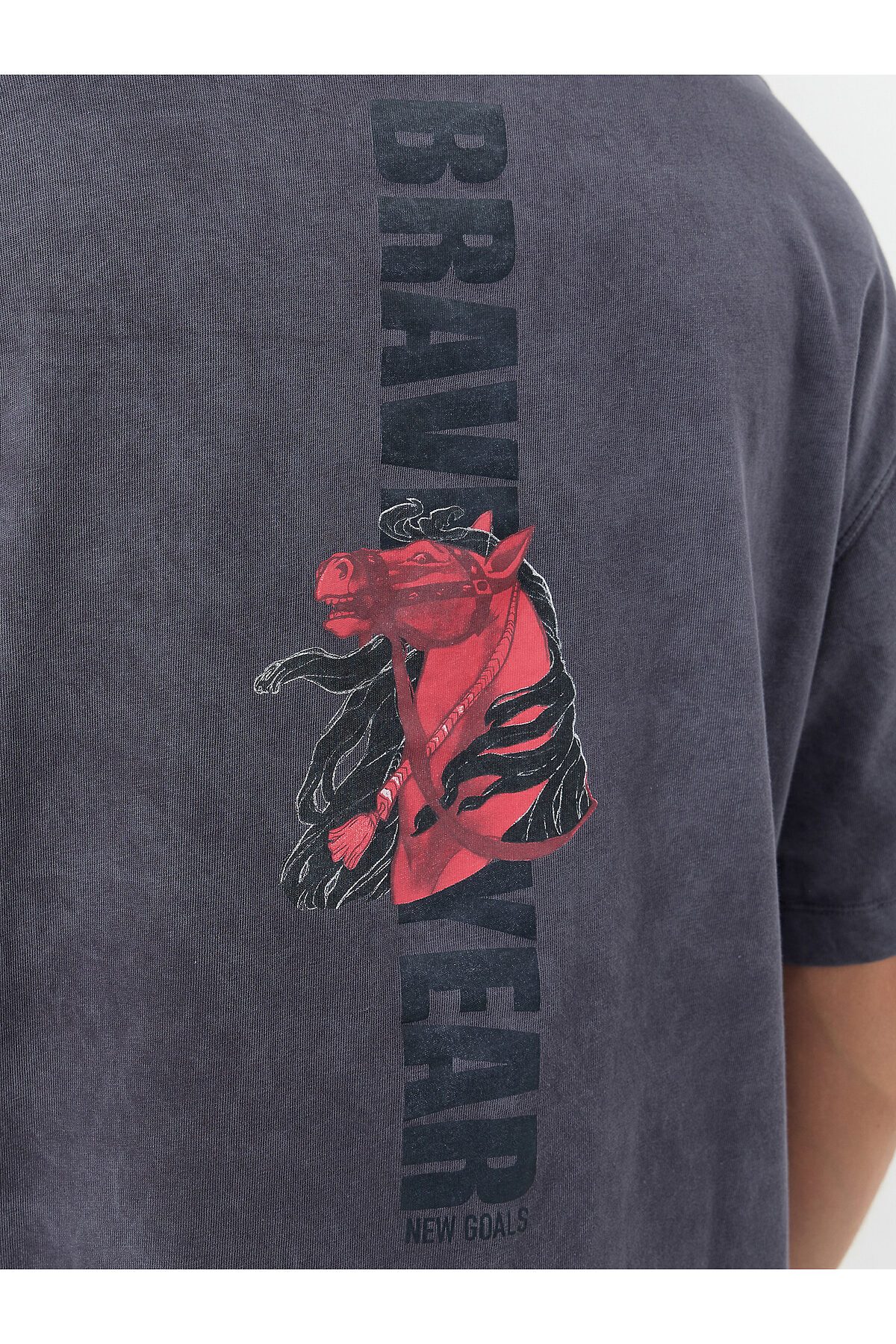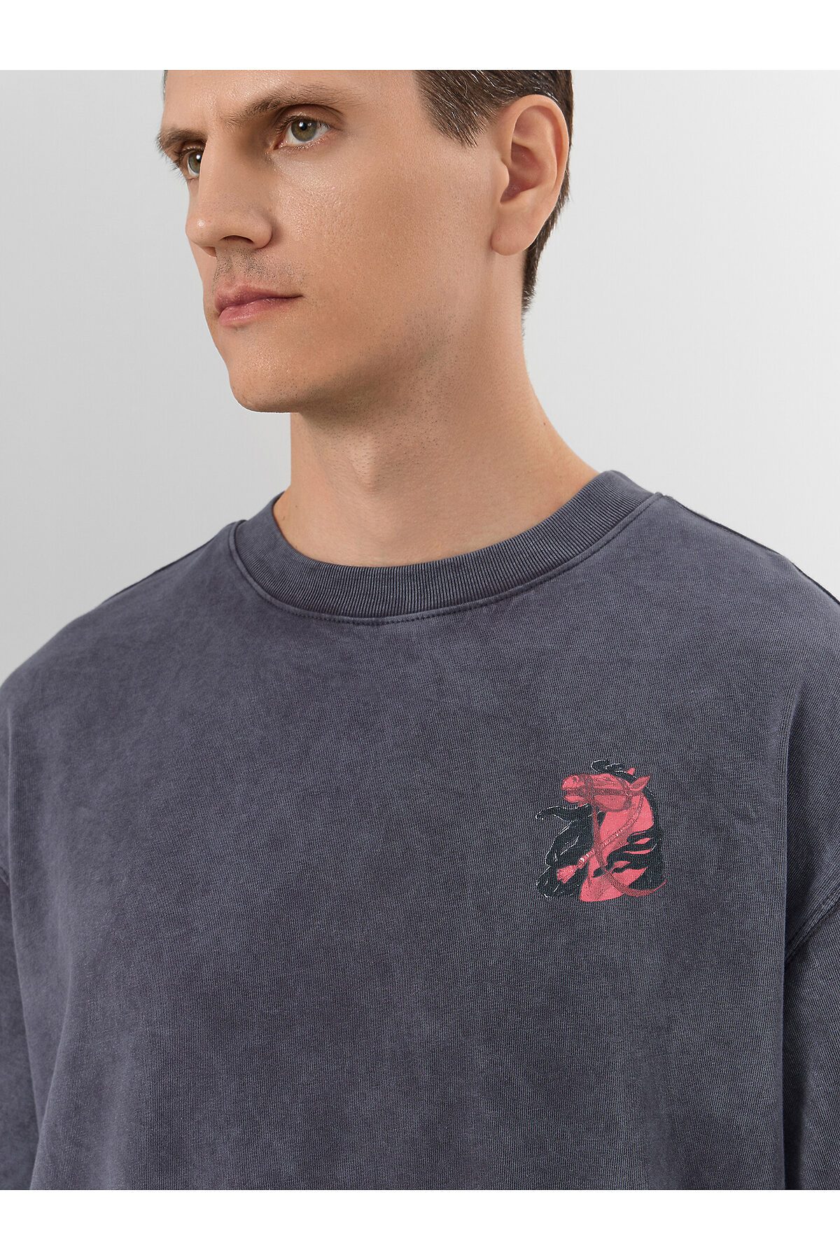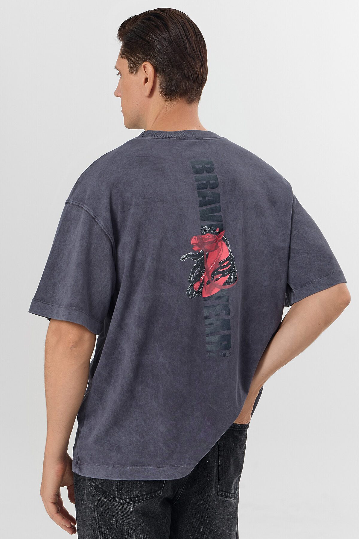Футболка прямая свободная. Горловина округлой формы обработана обтачкой из рибаны. Шов втачивания обтачки по спинке закрыт бейкой из основного полотна. Линия плеча слегка спущена. Рукава втачные, корткие. Нижние срезы футболки и рукавов обработаны швом вподгибку на 2х шовной плоскошовной машине.