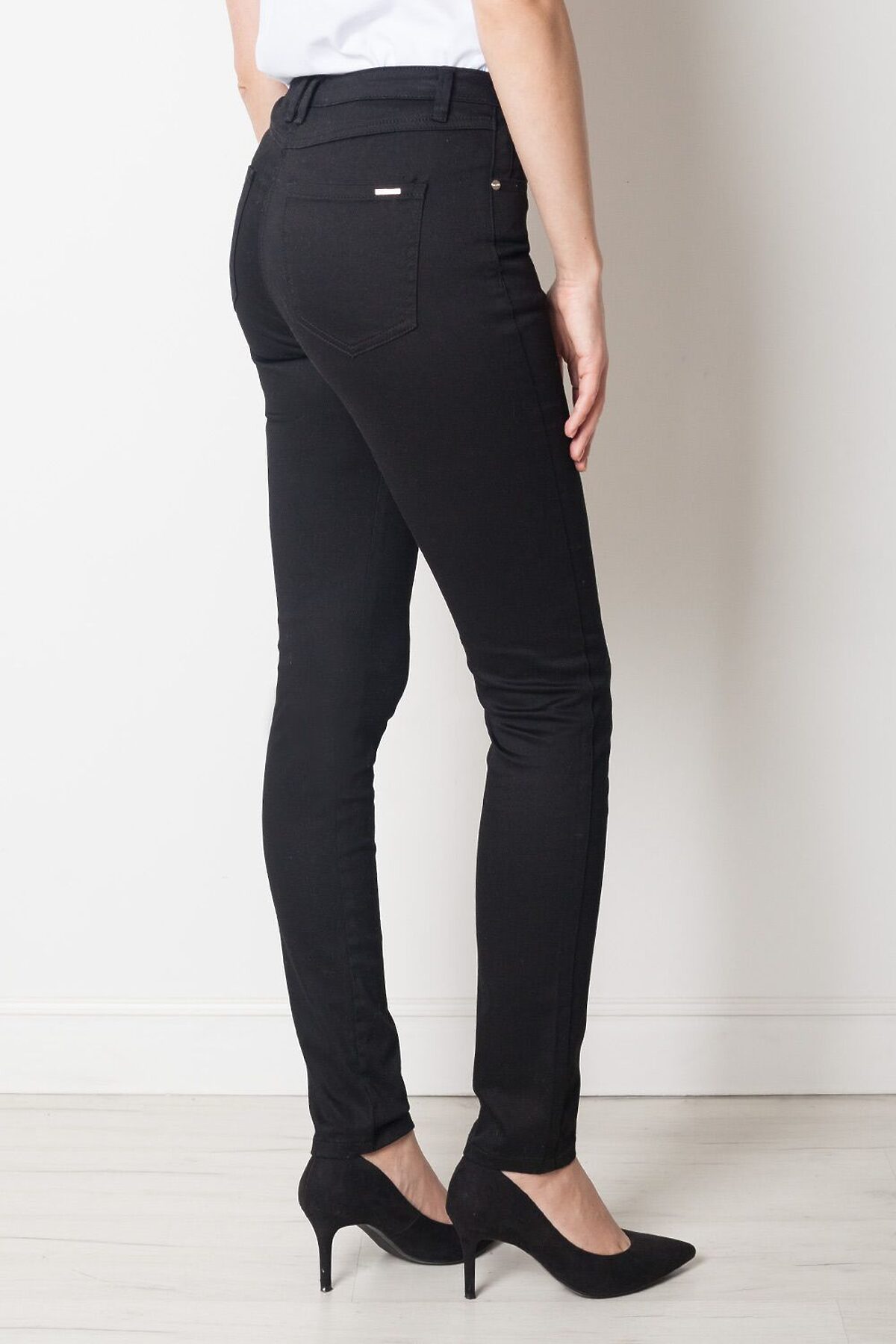 Брюки из хлопка с эластаном средней плотности. Базовый джинсовый силуэт. Акцентная металлическая фурнитура. Комфортная высота посадки подобрана с учетом осбенностей фигур разных размеров. Актуальный во всех сезонах - глубокий черный цвет.