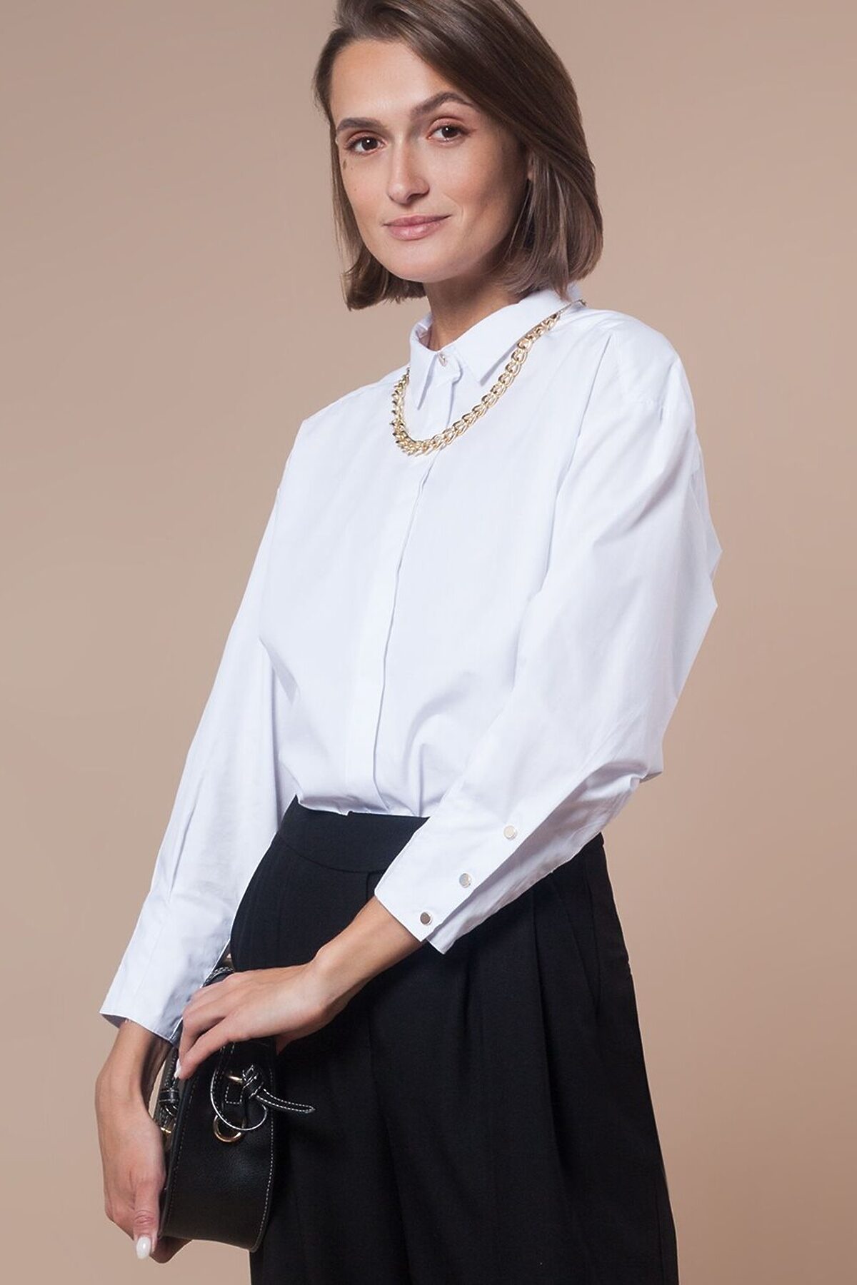 Блузка выполнена из хлопка с полиэстером, который обеспечивает формоустойчивость, долговесную белизну и комфорт в уходе. Немного укороченные широкие рукава эффектно собираются на защипы внизу и украшены золотистыми пуговицами.