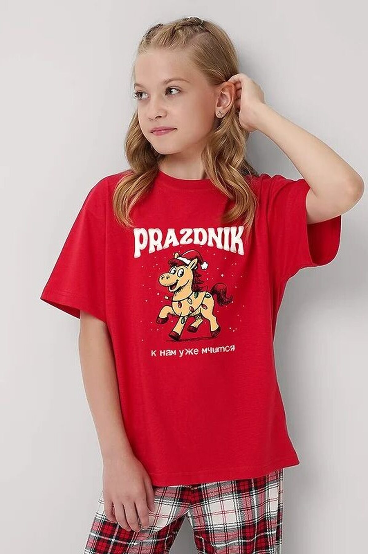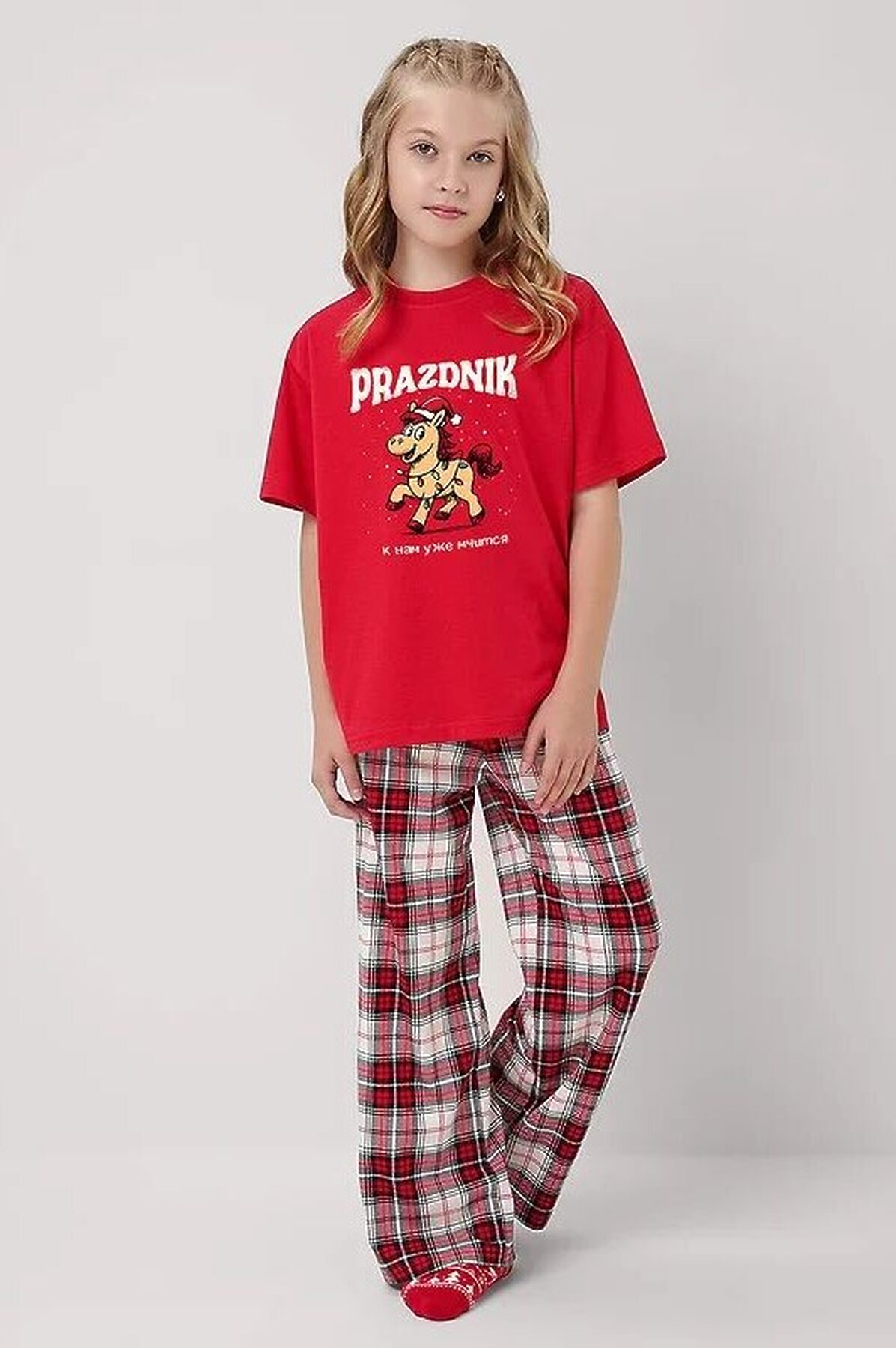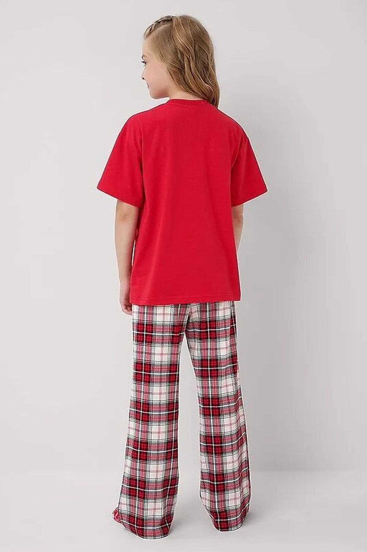 Новогодняя пижама для подростков,состоящая из футболки и брюк. Футболка свободного кроя спереди украшена милым тематическим принтом. Брюки прямые среднего объема с эластичным поясом.