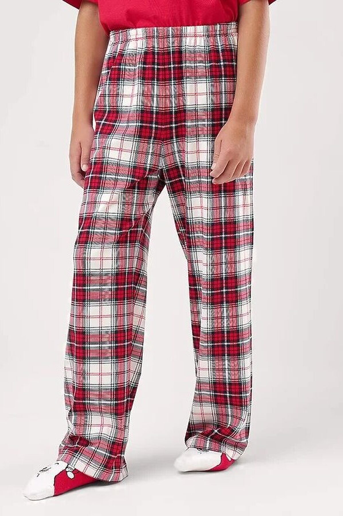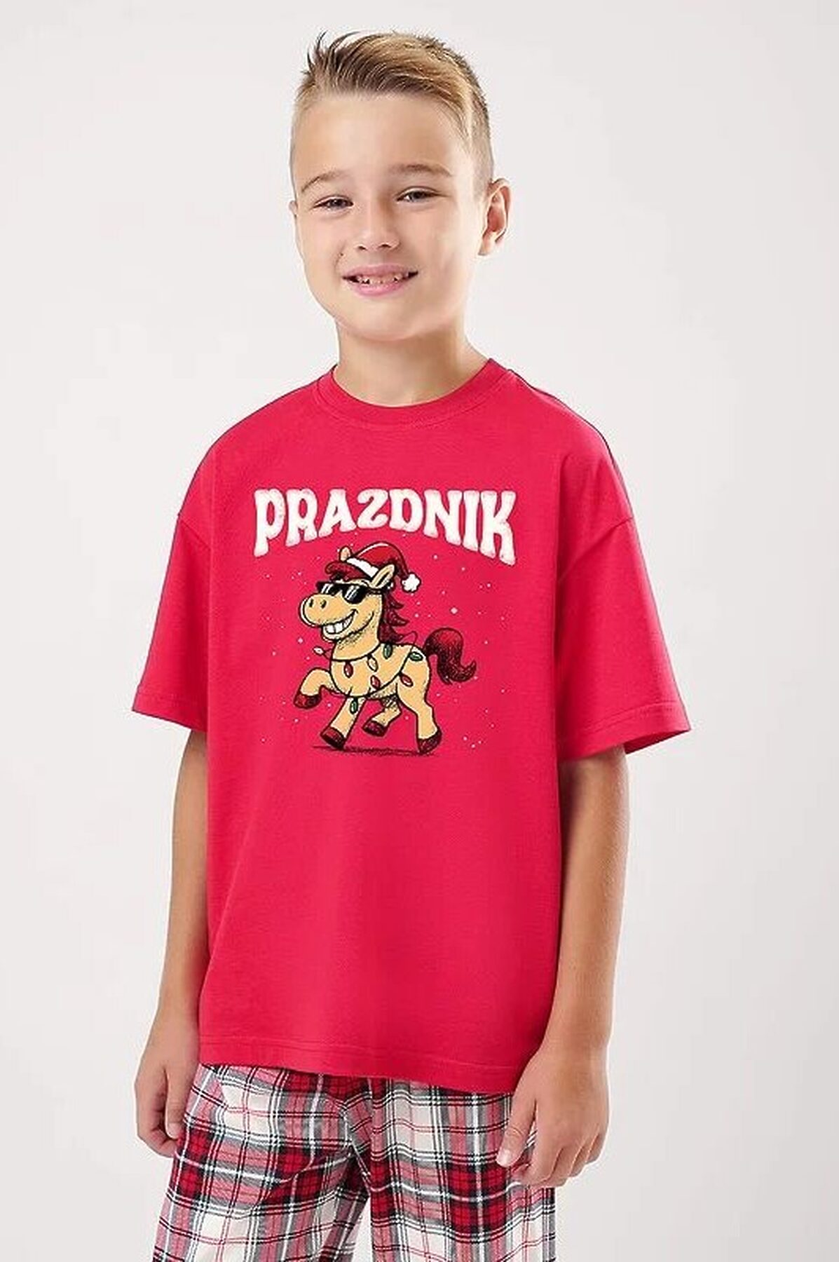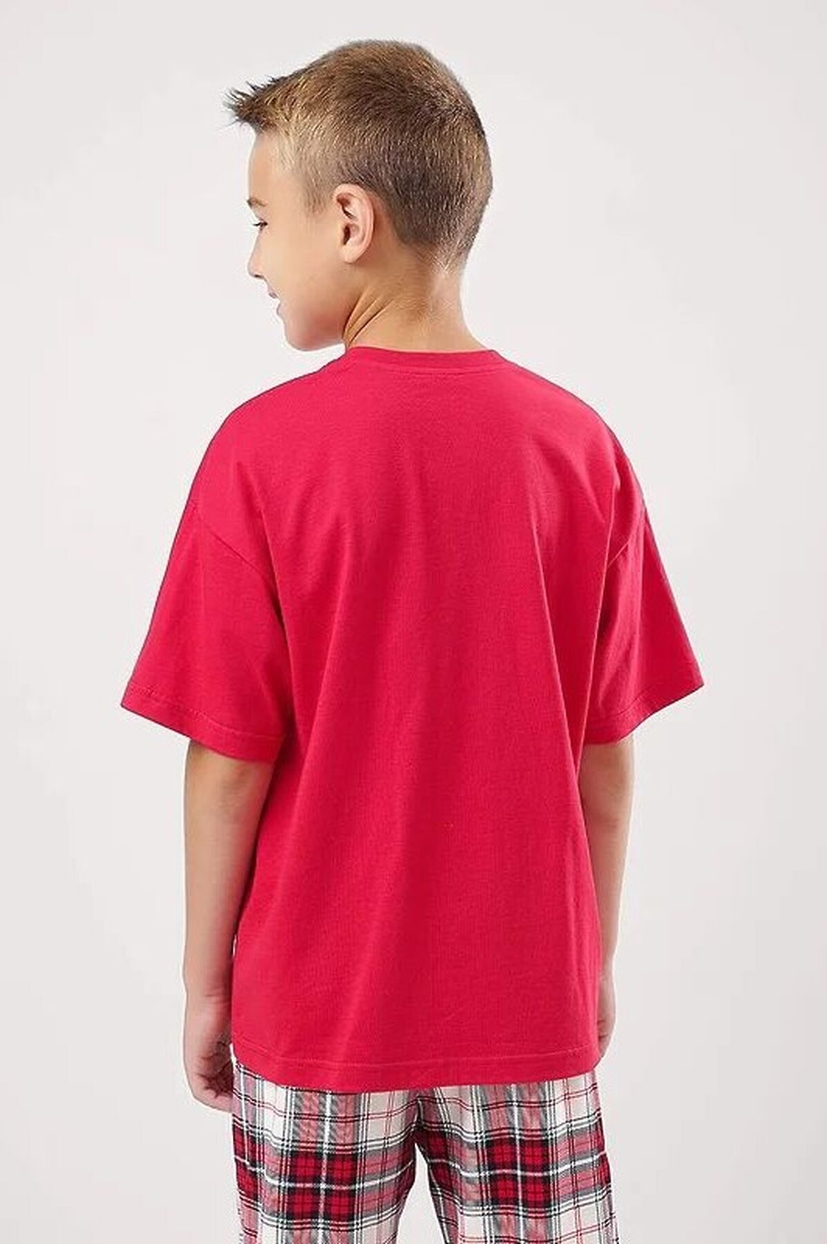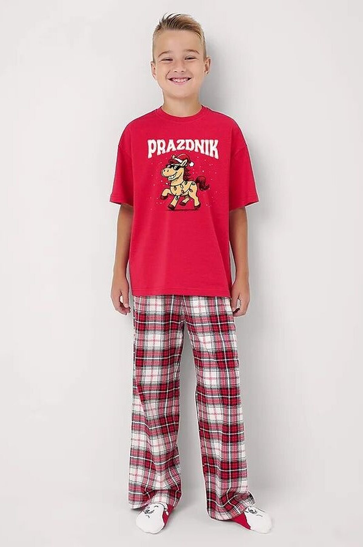 Новогодняя пижама для подростков,состоящая из футболки и брюк. Футболка свободного кроя спереди украшена тематическим принтом. Брюки прямые среднего объема с эластичным поясом.