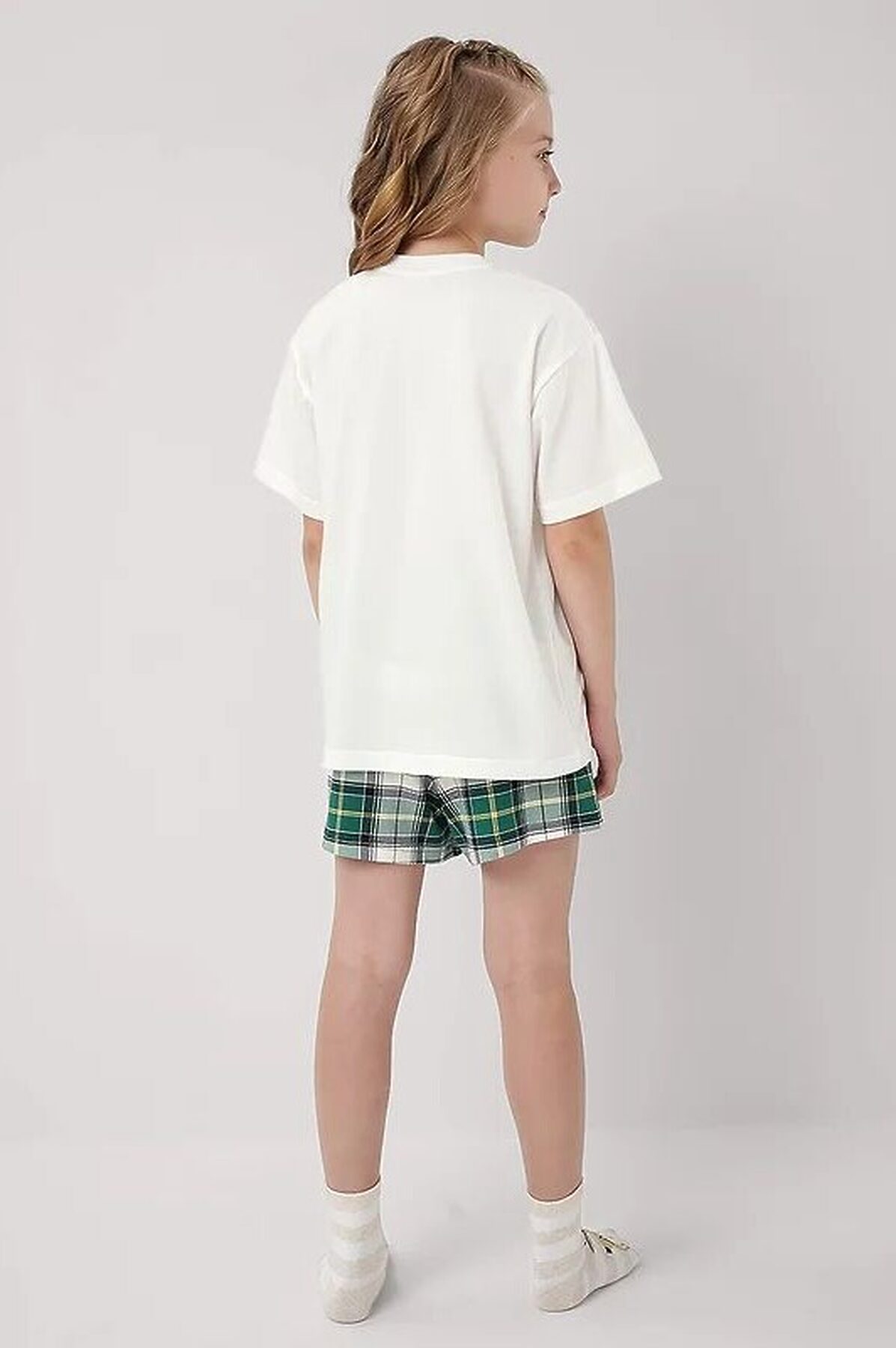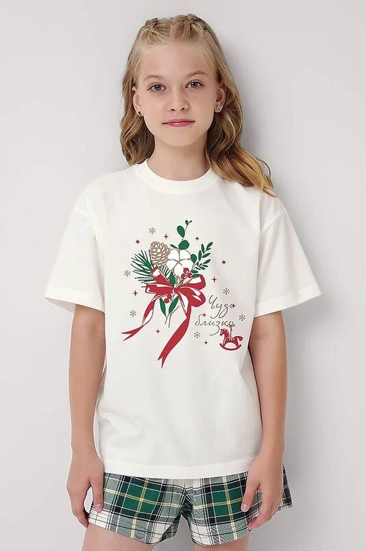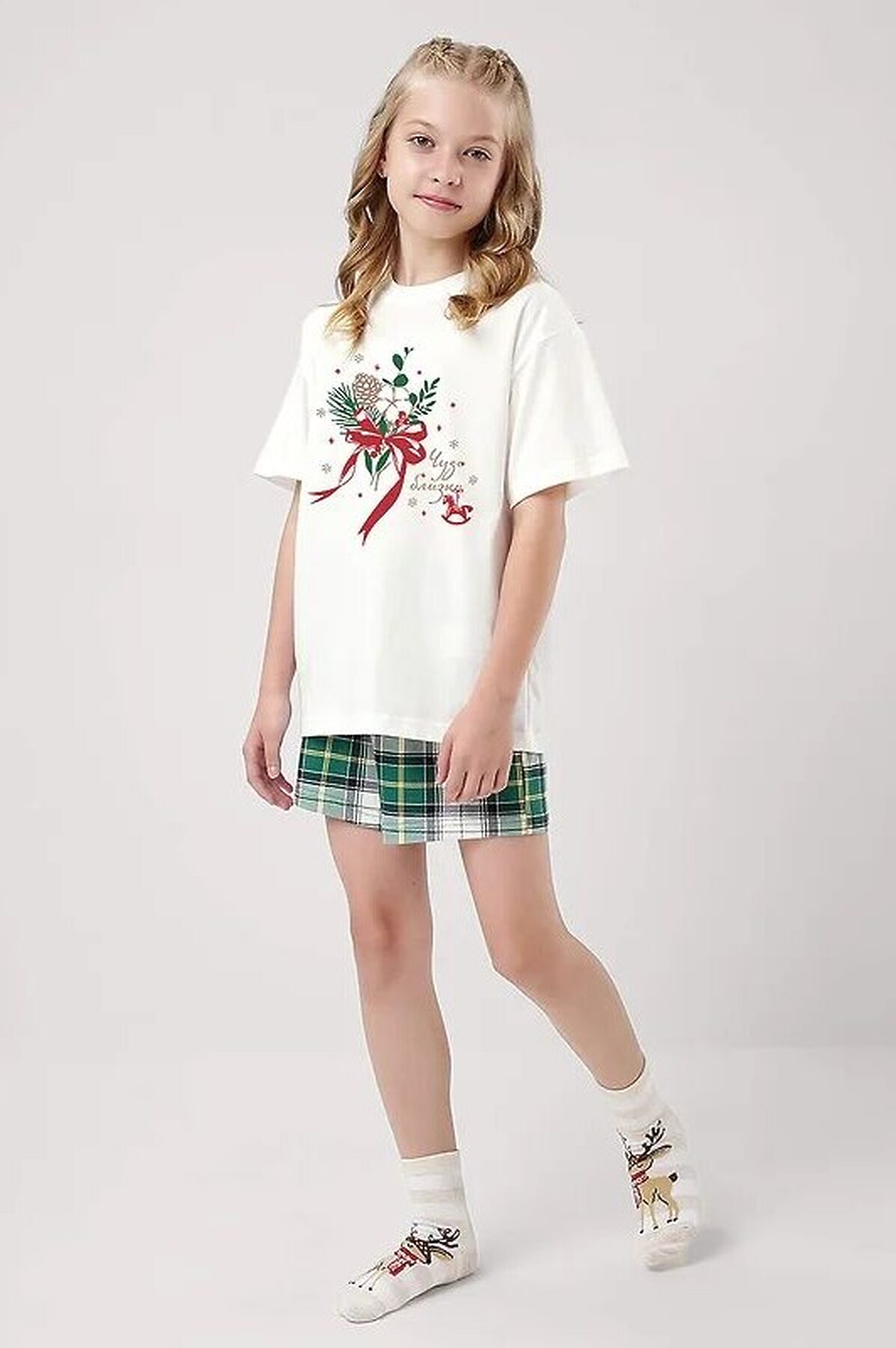 Новогодняя хлопковая пижама,состоящая из футболки и шорт. Футболка свободного кроя спереди украшена милым тематическим принтом. Шорты с высокой талией, эластичный пояс обеспечит комфорт и идеальную посадку.