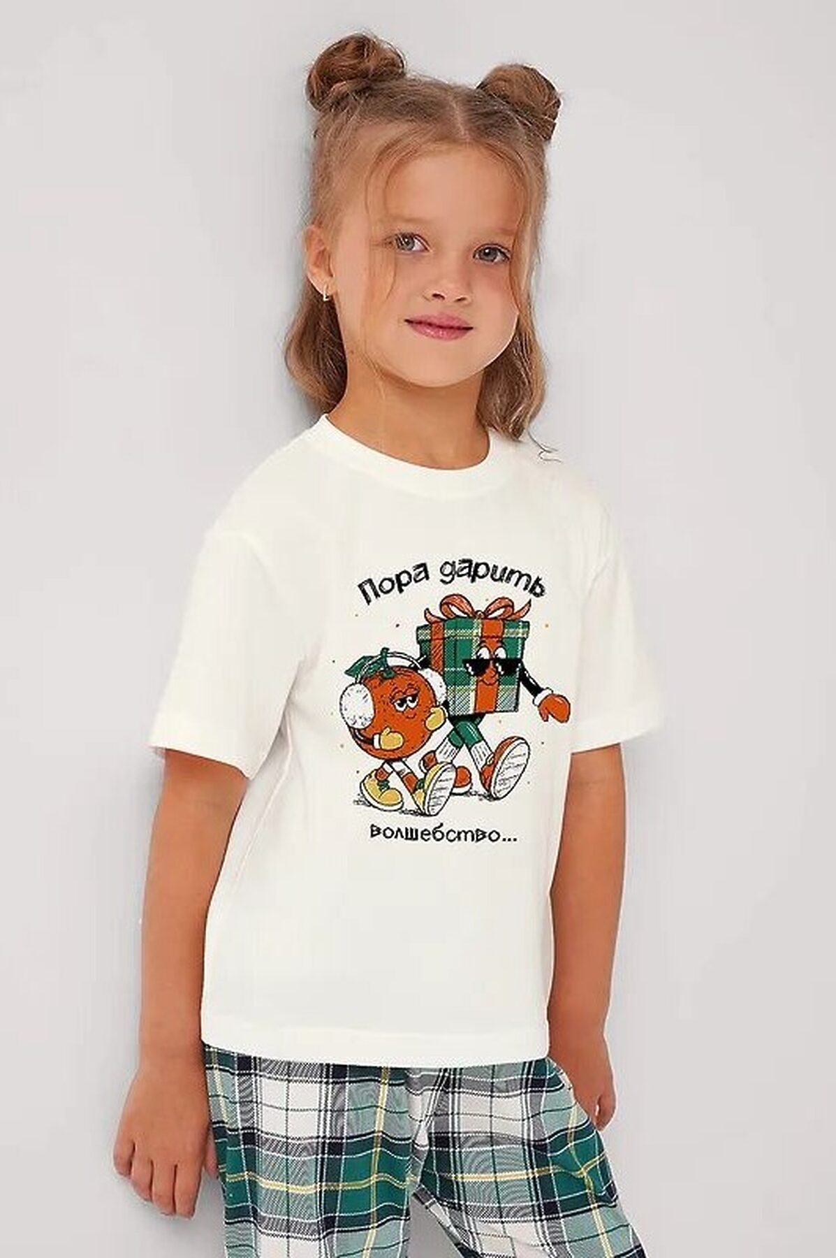 Новогодняя хлопковая пижама из футболки и брюк. Горловина , манжеты по низу брюк из эластичного полотна. Футболка свободного кроя, тематический принт по переду. Брюки среднего объема, эластичный пояс обеспечит комфорт и идеальную посадку.
