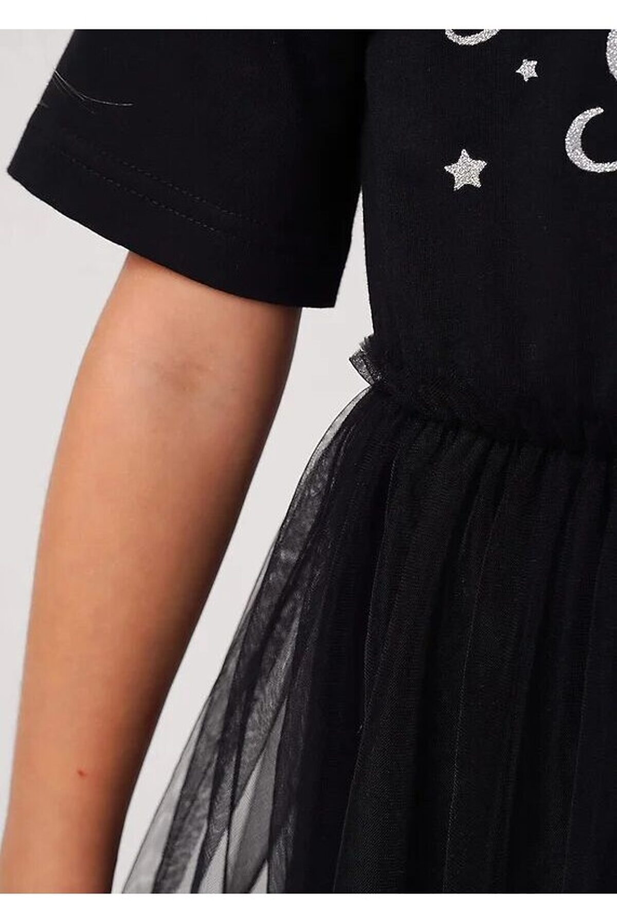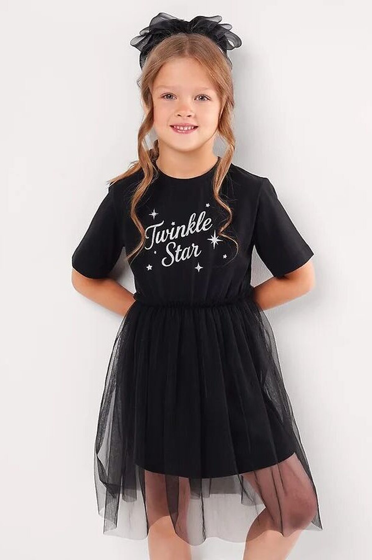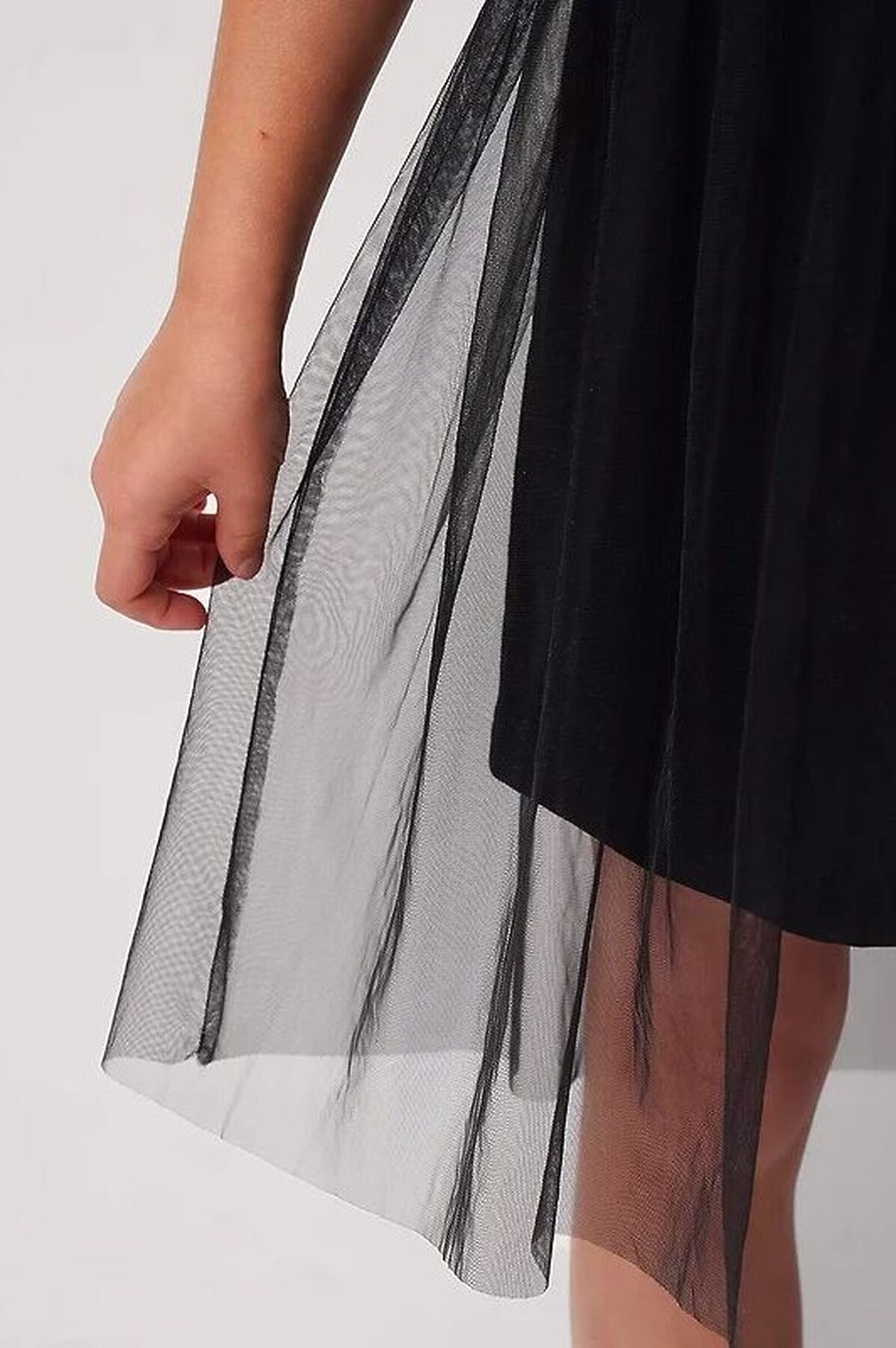 Нарядное платье с сеткой абсолютная находка для юных модниц! Пышная юбка из сетки,короткий летящий рукав,и подклад платья - из хлопка с эластаном. Платье дополнено мерцающим принтом спереди.