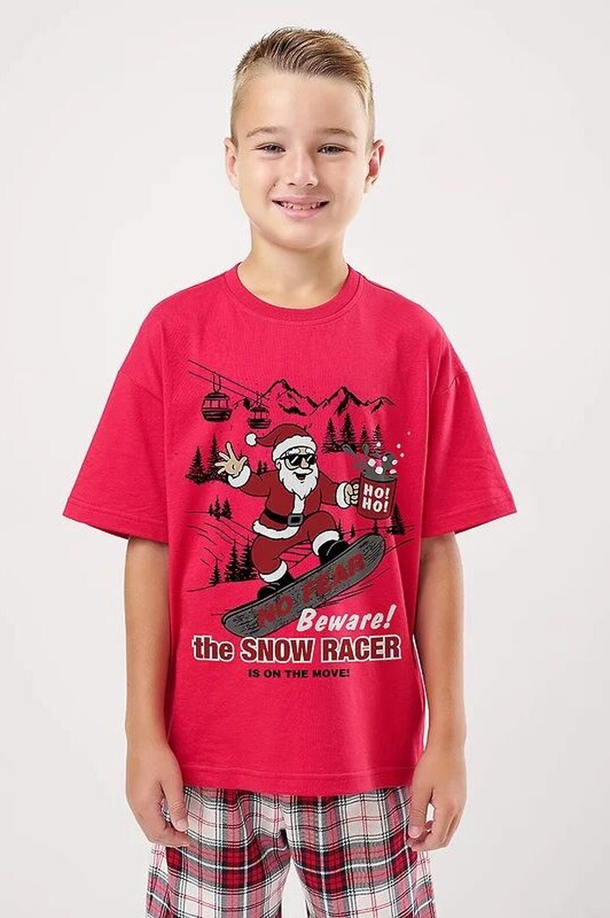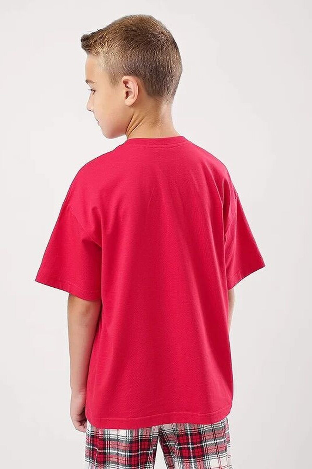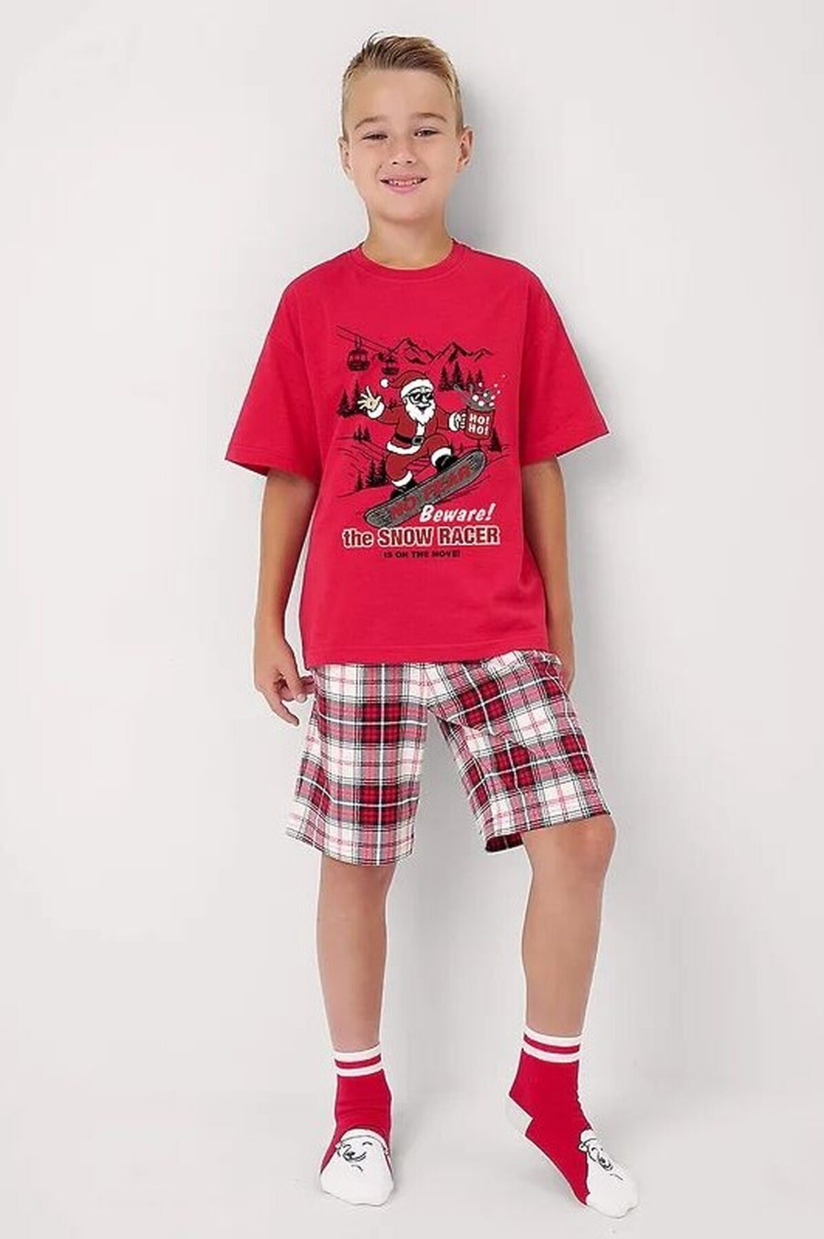 Новогодняя пижама для подростков, состоящая из футболки и шорт. Стильная футболка свободного кроя дополнена оригинальным принтом. Шорты прямые средней длины с эластичным удобным поясом, выполнены из хлопкового полотна в клетку.