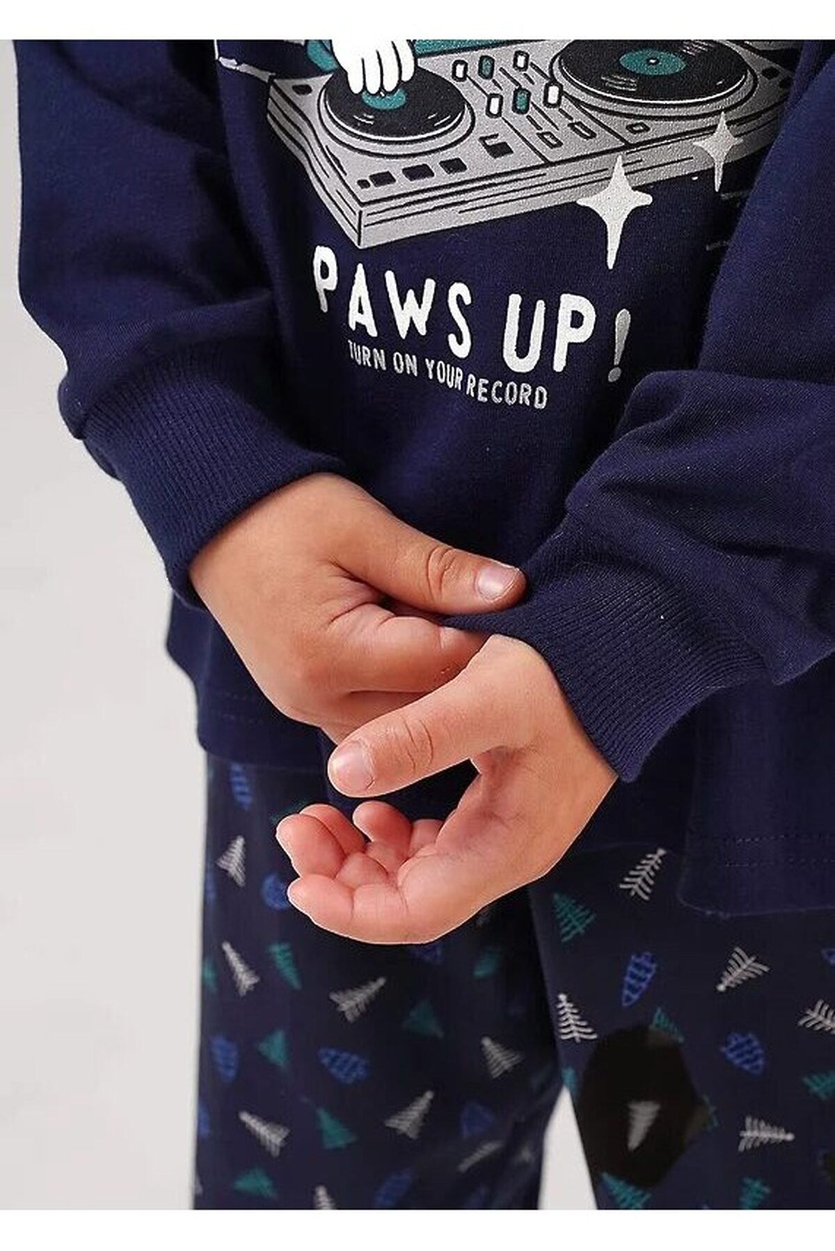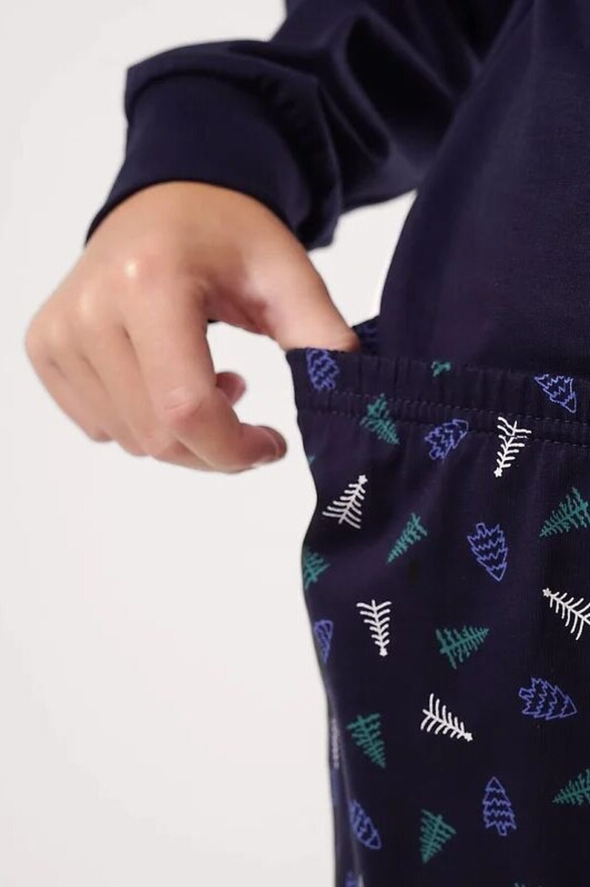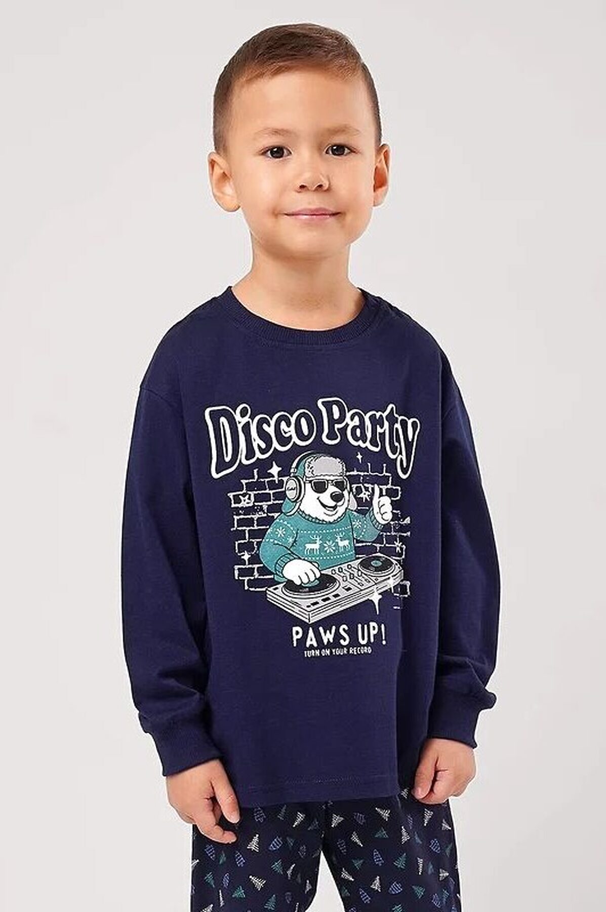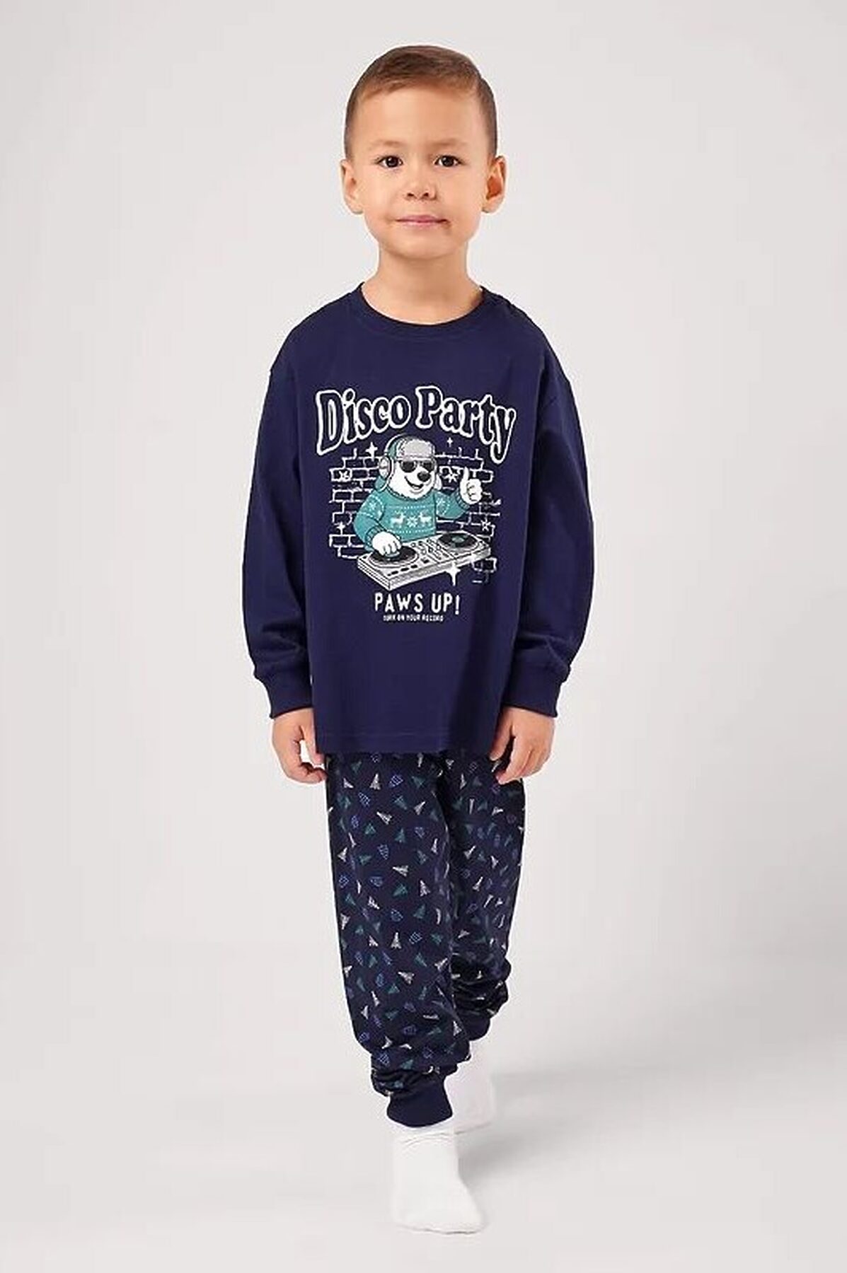 Новогодняя хлопковая пижама из джемпера и брюк. Горловина , манжеты по низу рукава и брюк из эластичного полотна. Лонгслив свободного кроя со спущенным плечом и крутым принтом.Брюки среднего объема, эластичный пояс обеспечит комфорт и идеальную посадку.