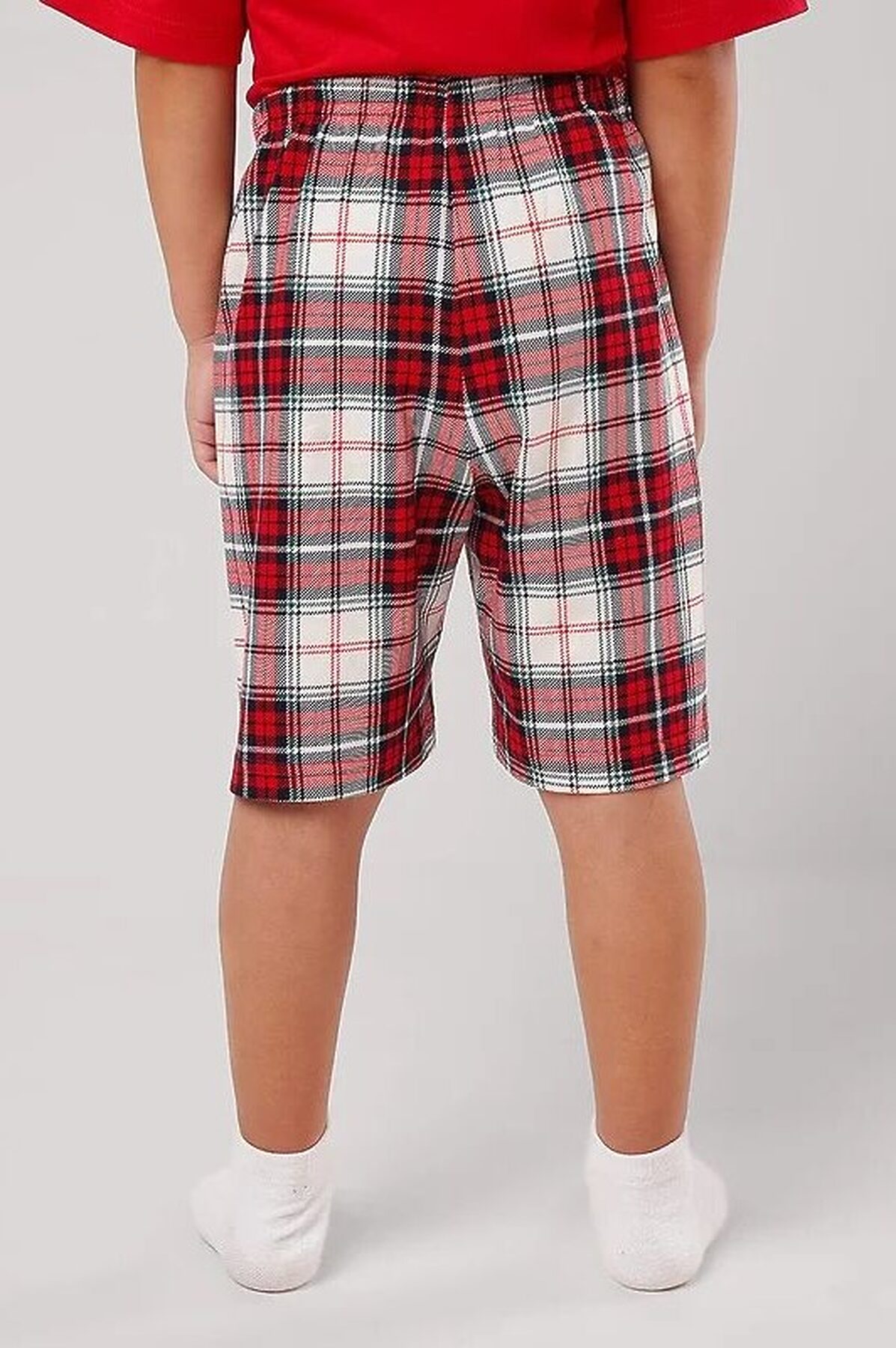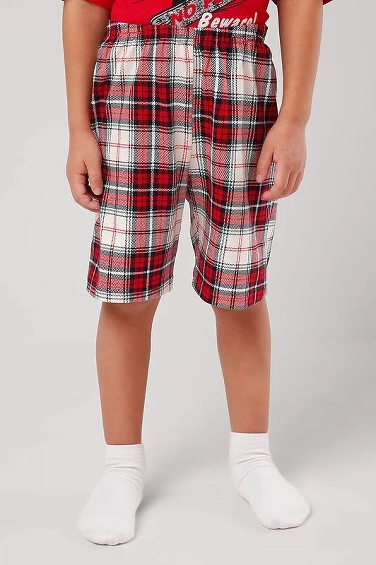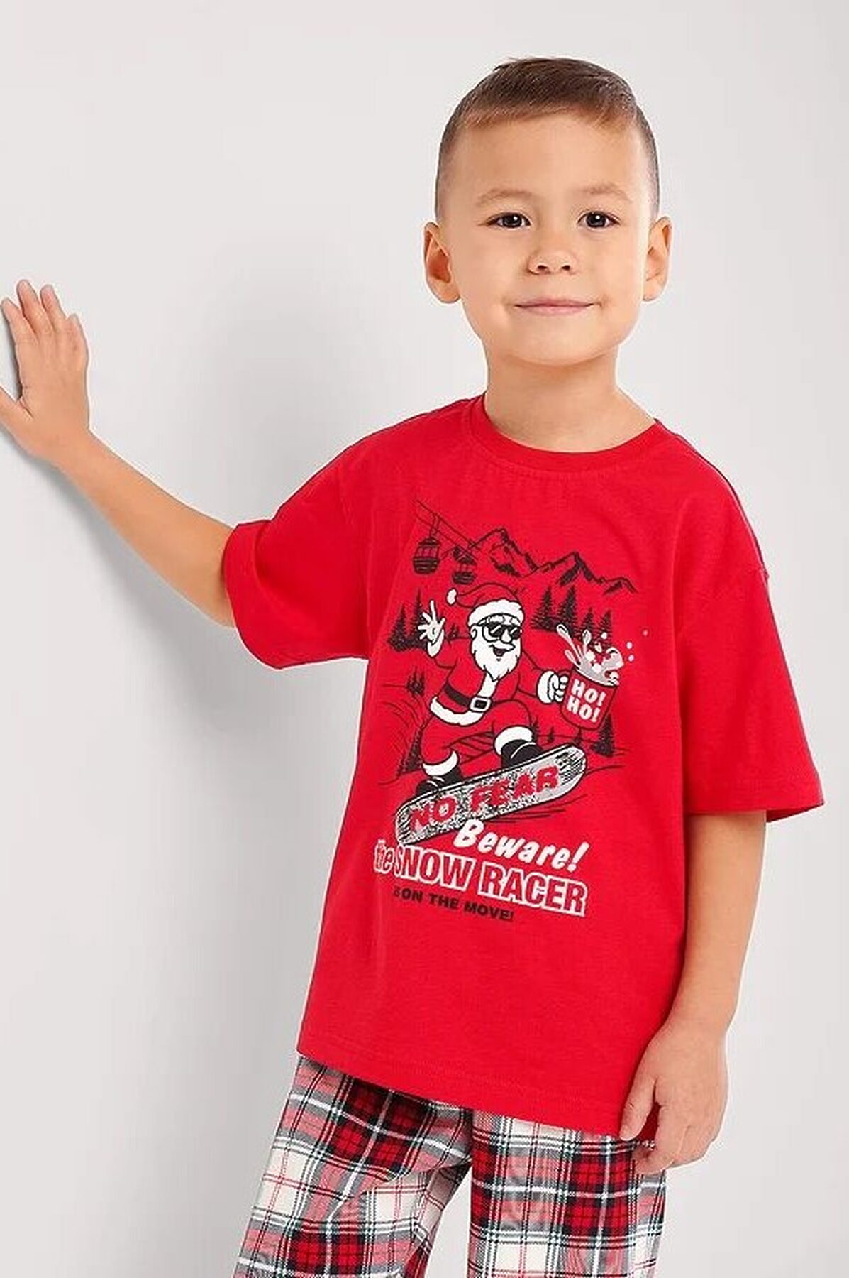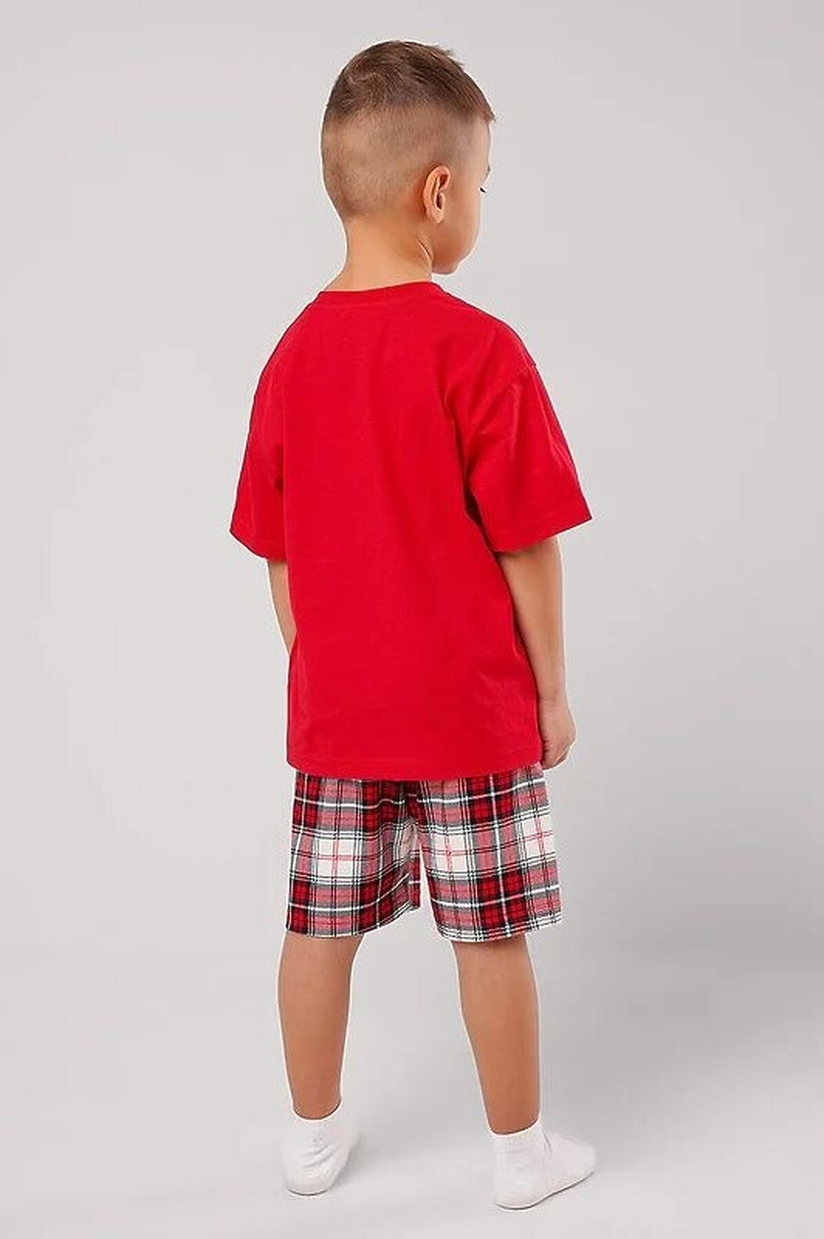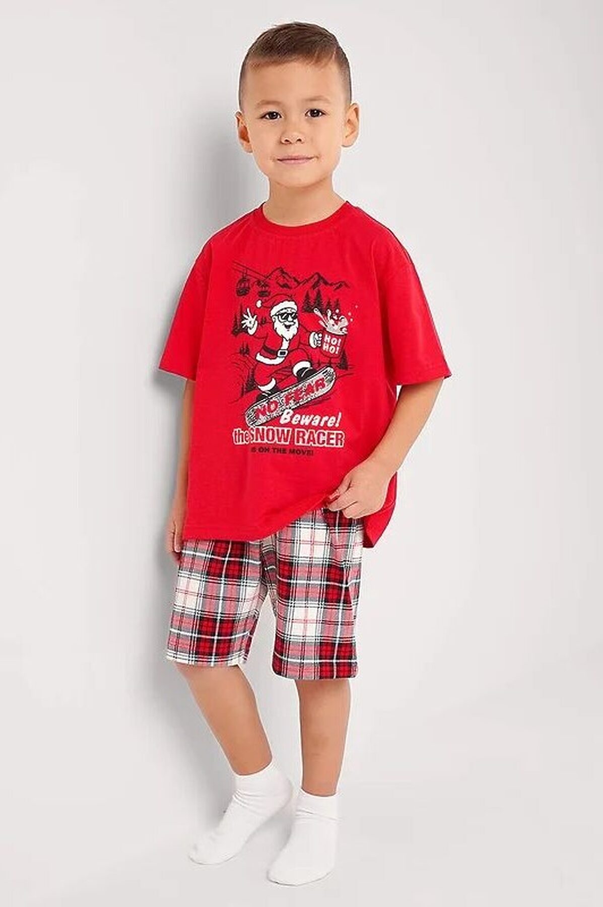 Новогодняя пижама для мальчика, состоящая из футболки и шорт. Стильная футболка свободного кроя дополнена оригинальным принтом. Шорты прямые средней длины с эластичным удобным поясом, выполнены из хлопкового полотна в клетку.