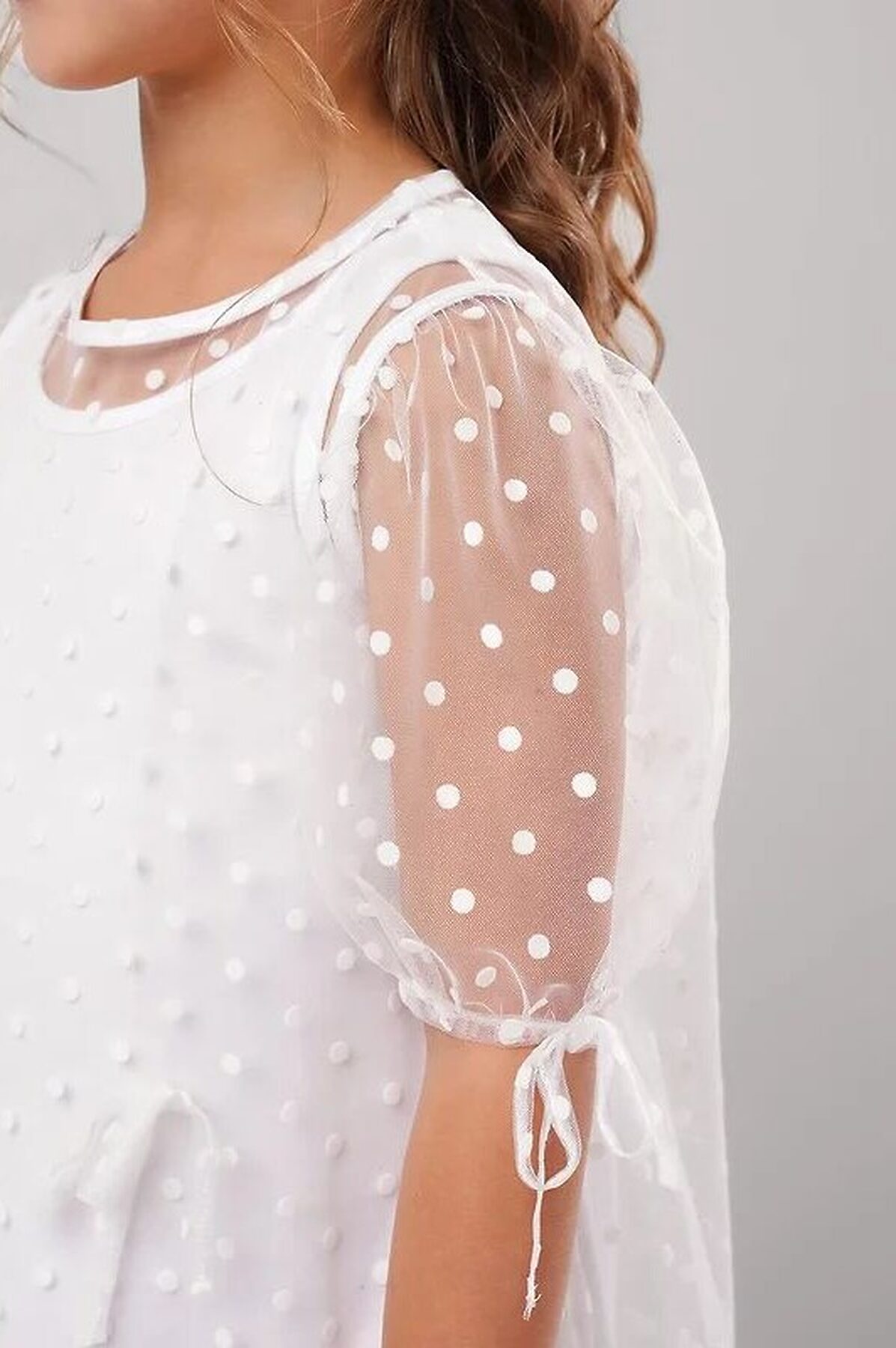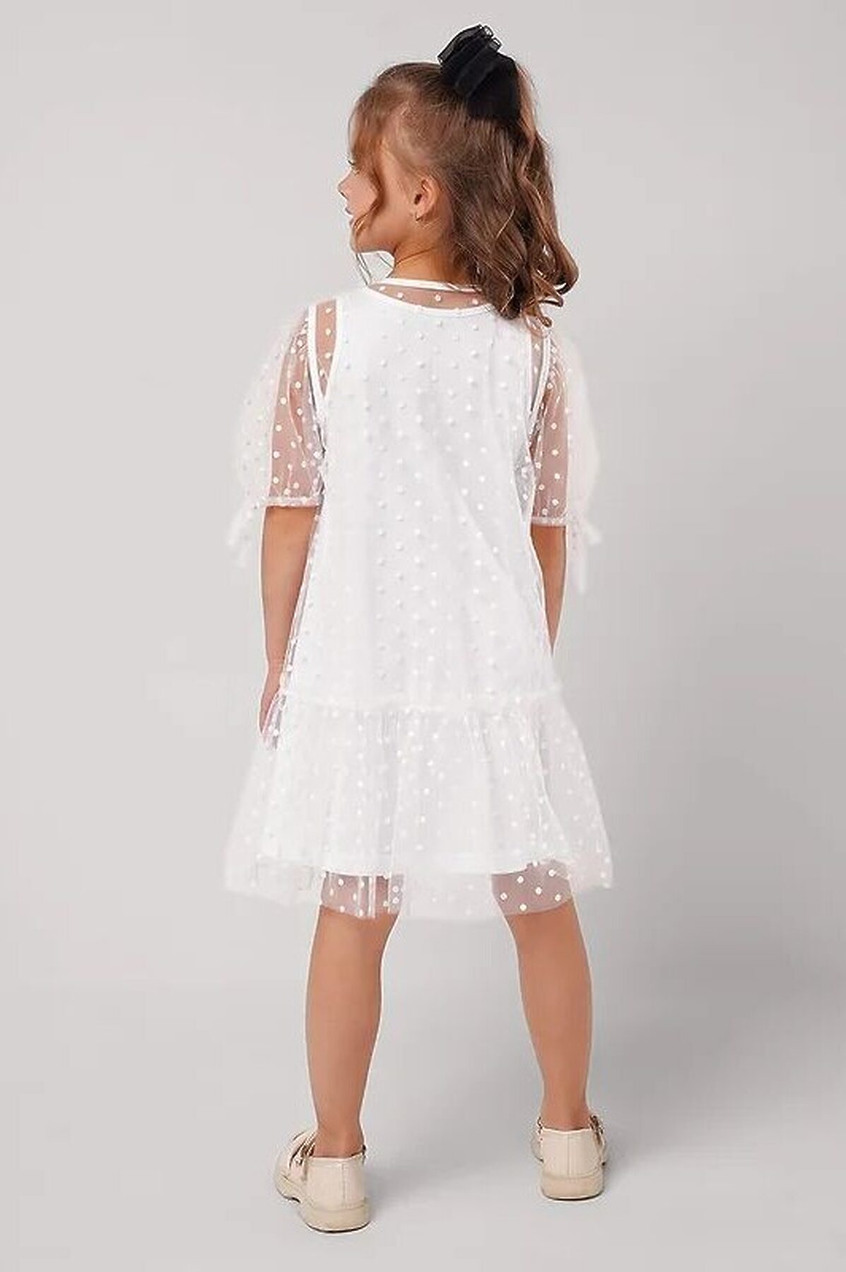 Двухслойнное платье для девочки. Верхний слой выполнены из сетки, нижний слой - из хлопкового трикотажа с эластаном. Объемные короткие рукава, пышный низ - создают невероятно красивый силуэт.