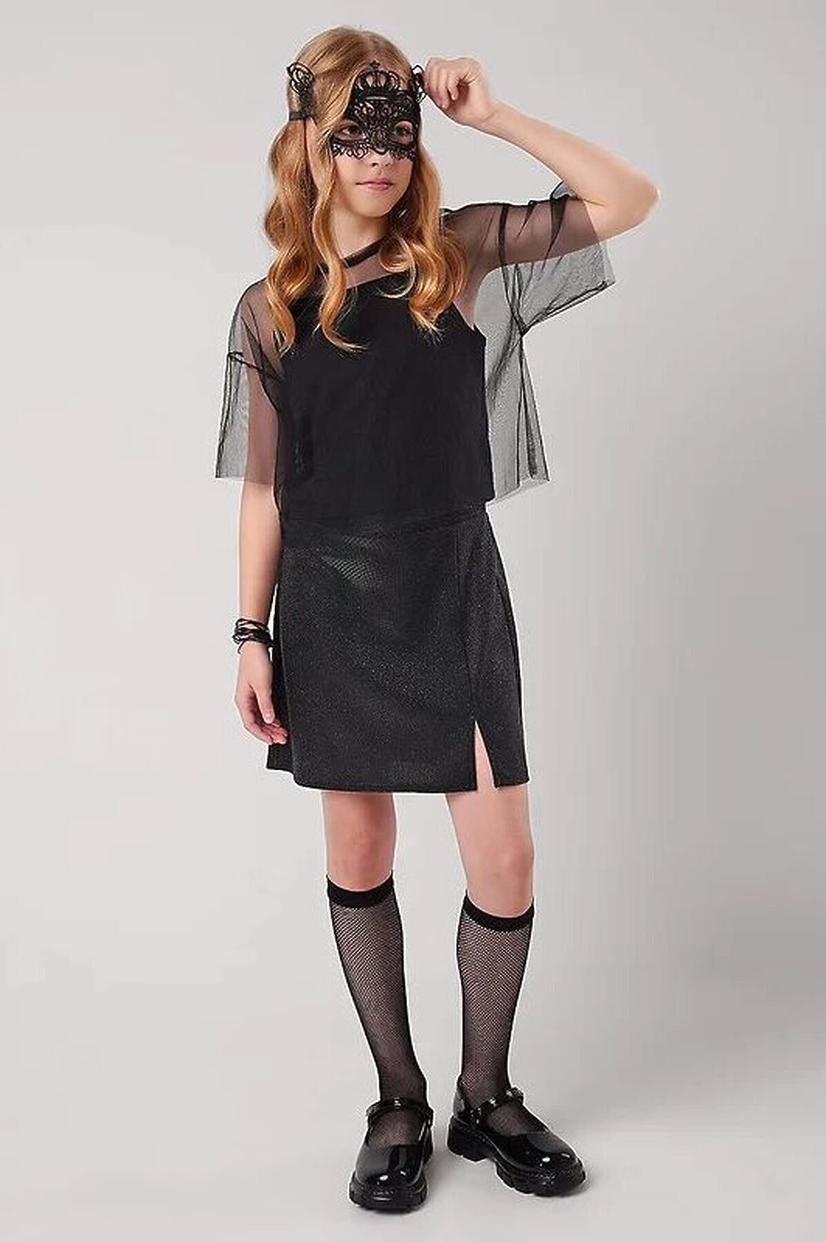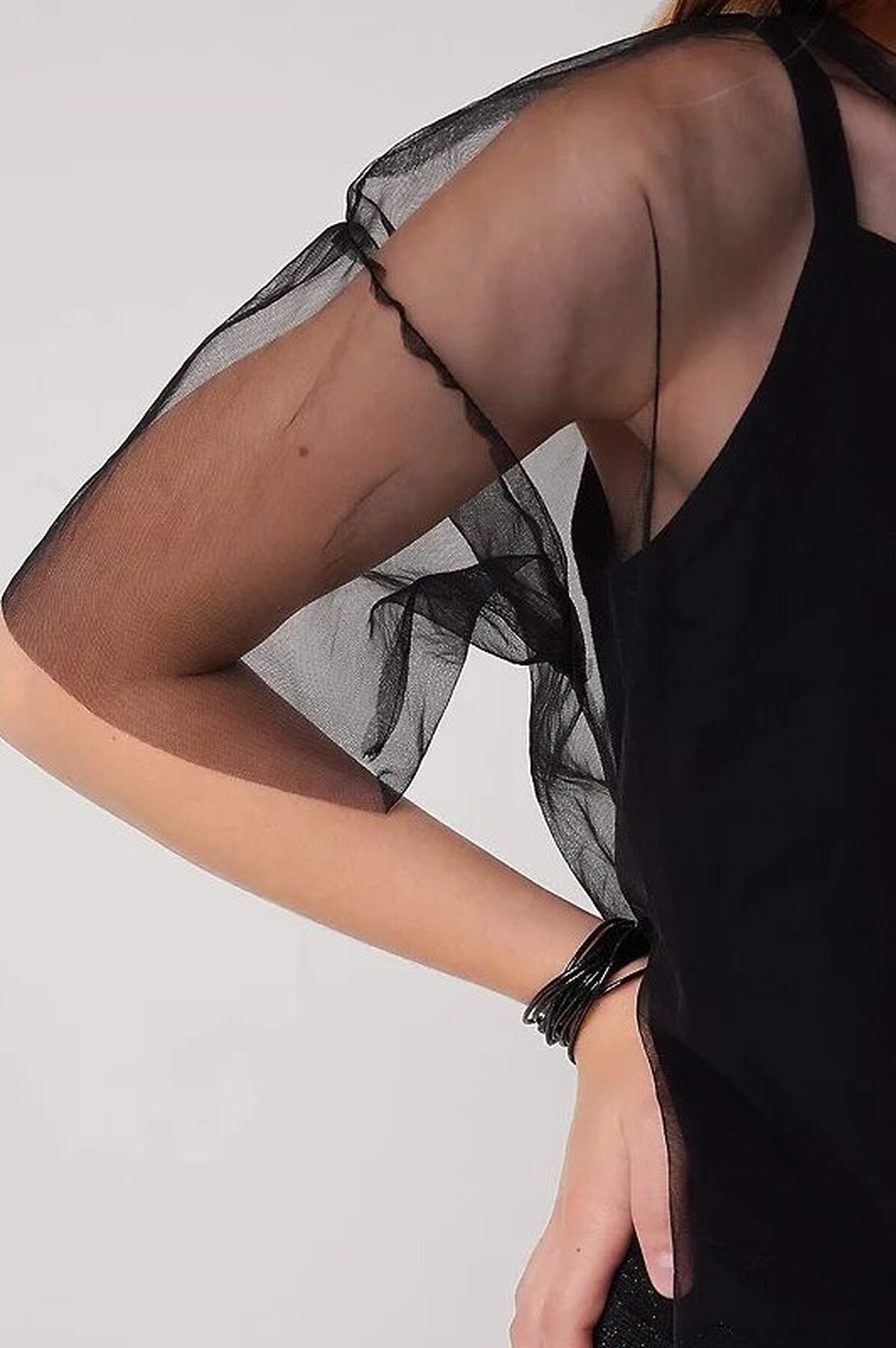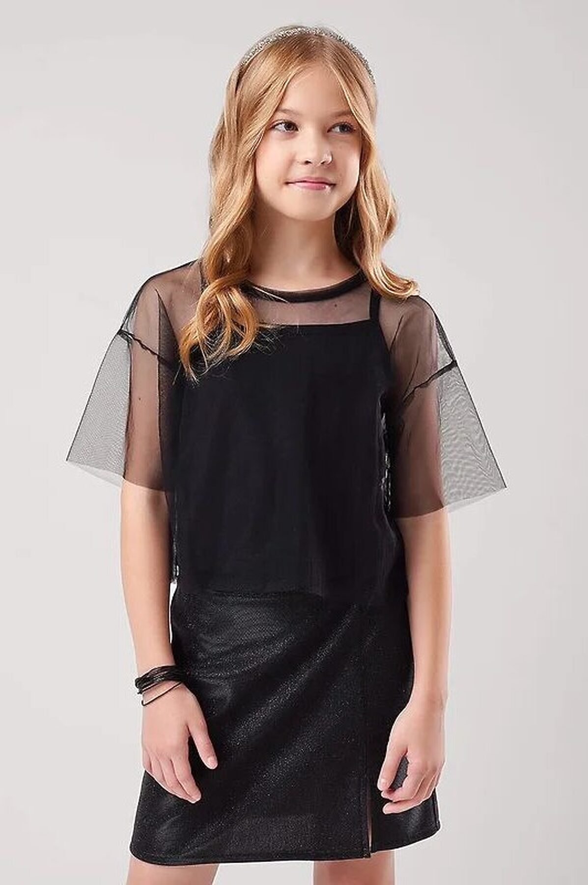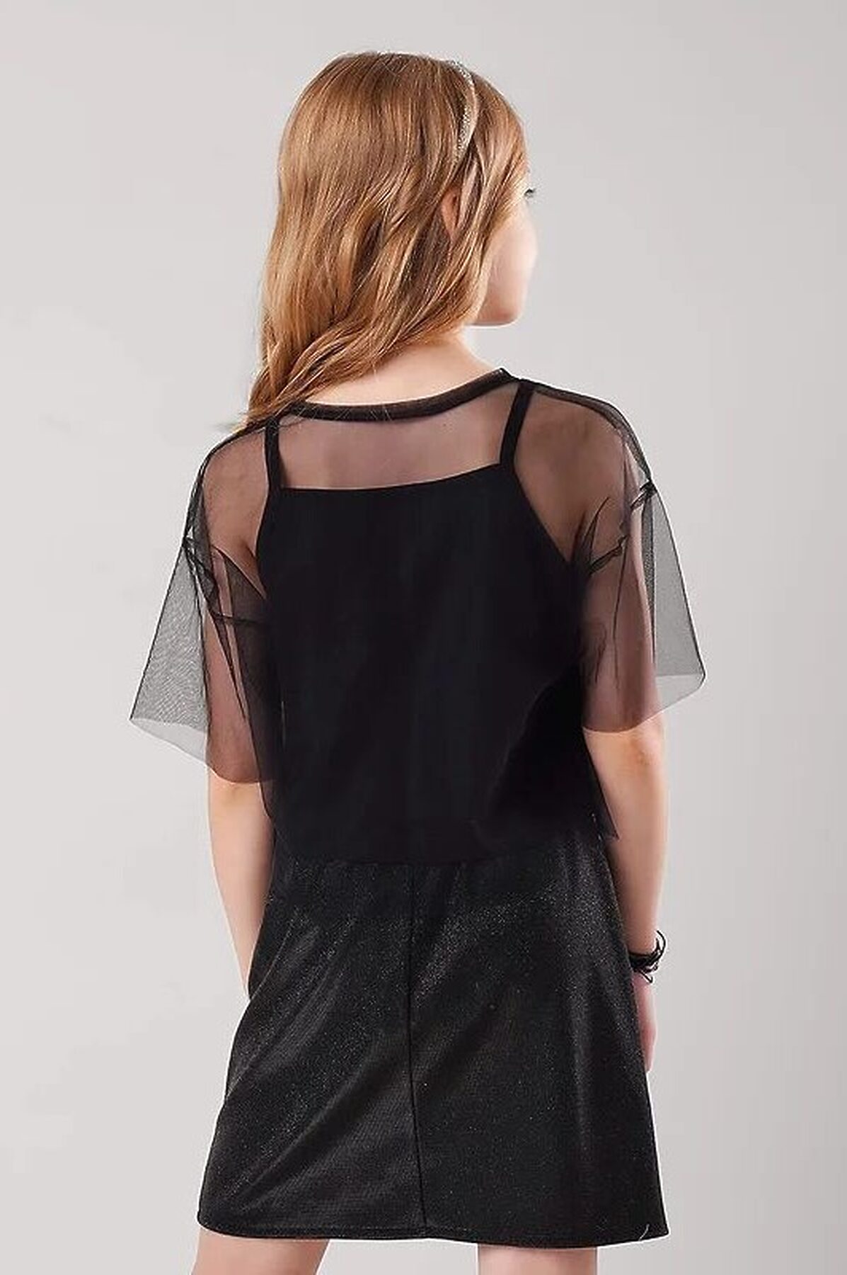 Двухслойная футболка для девочки. Рукава и верхний слой выполнены из сетки, нижний слой - из хлопкового трикотажа с эластаном. Свободная посадка. Стильная модель для праздника.