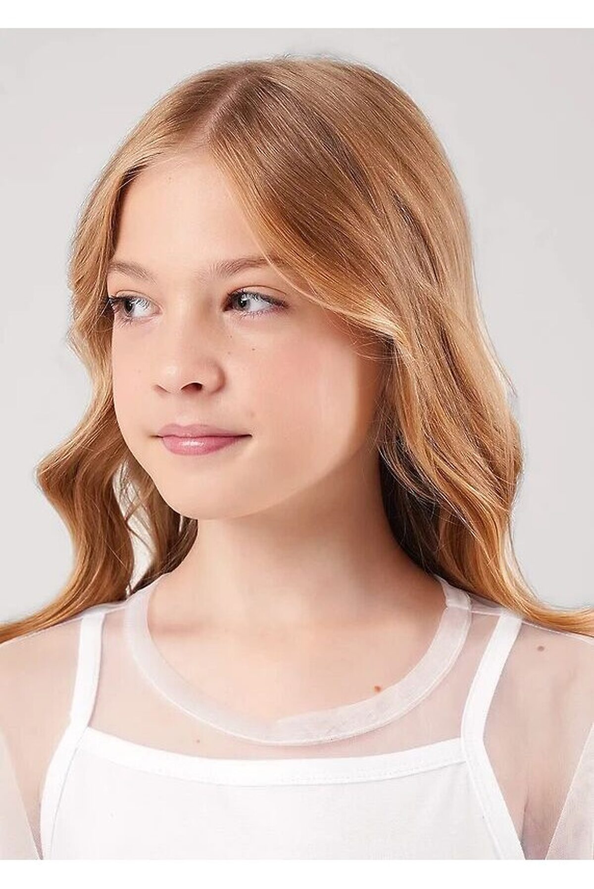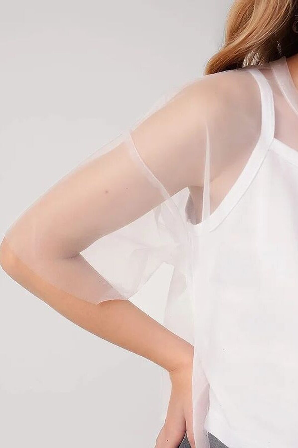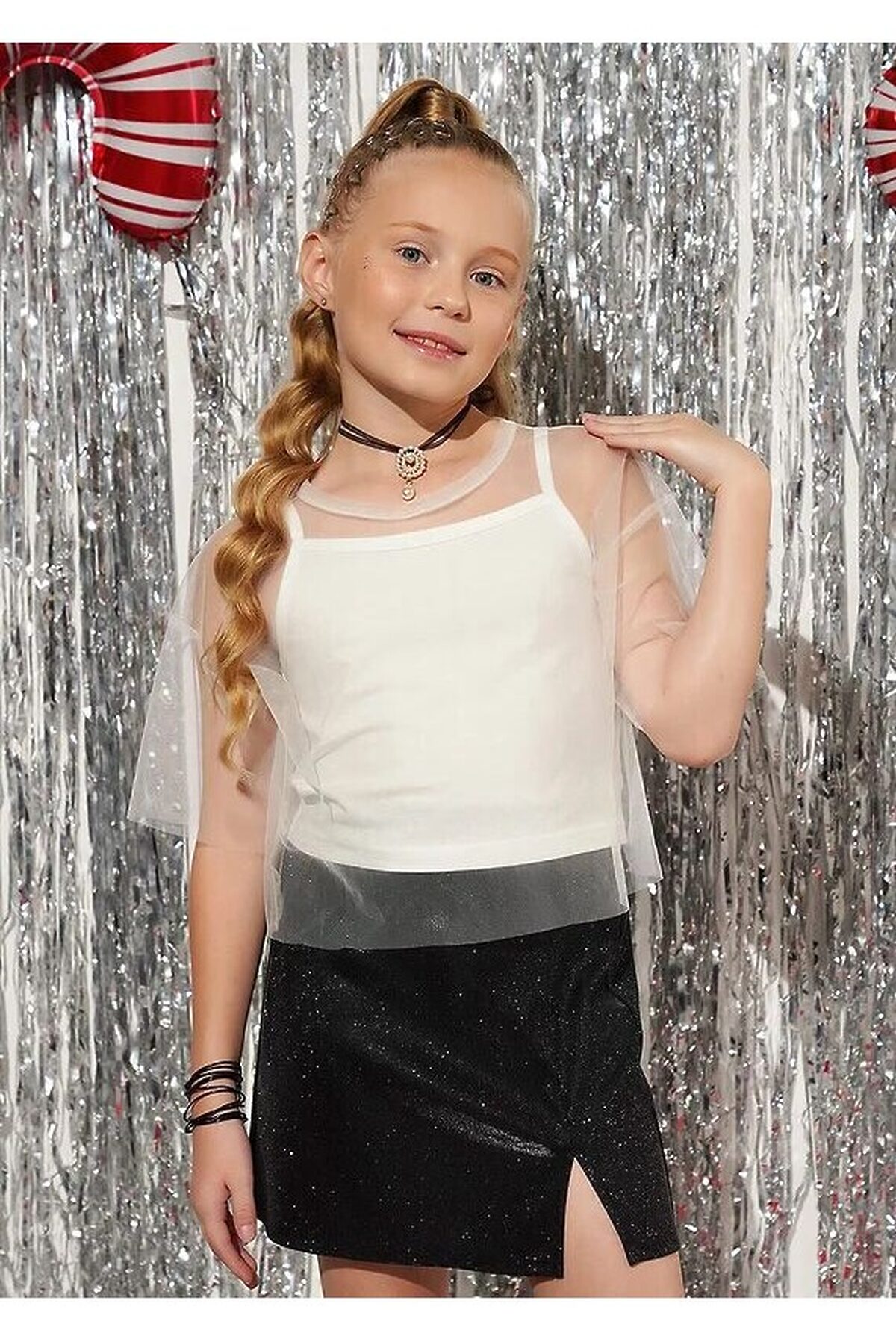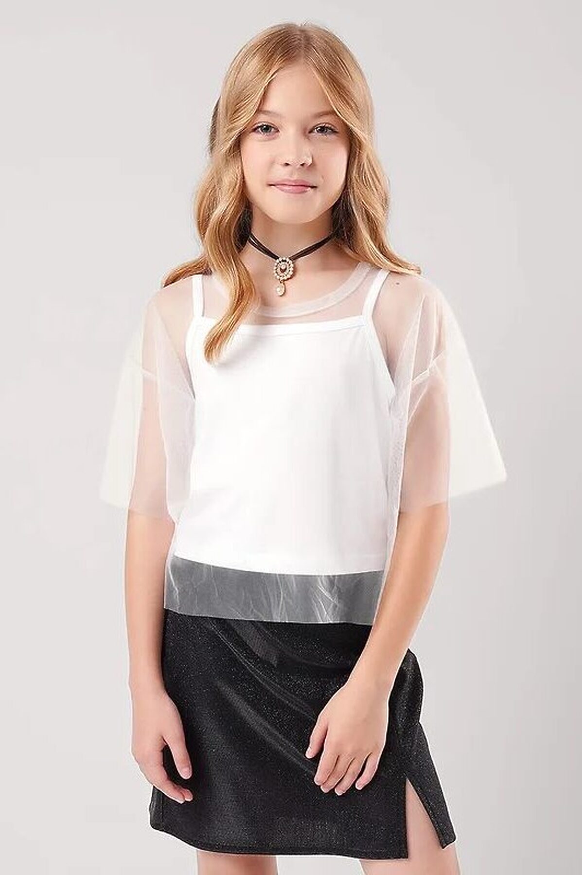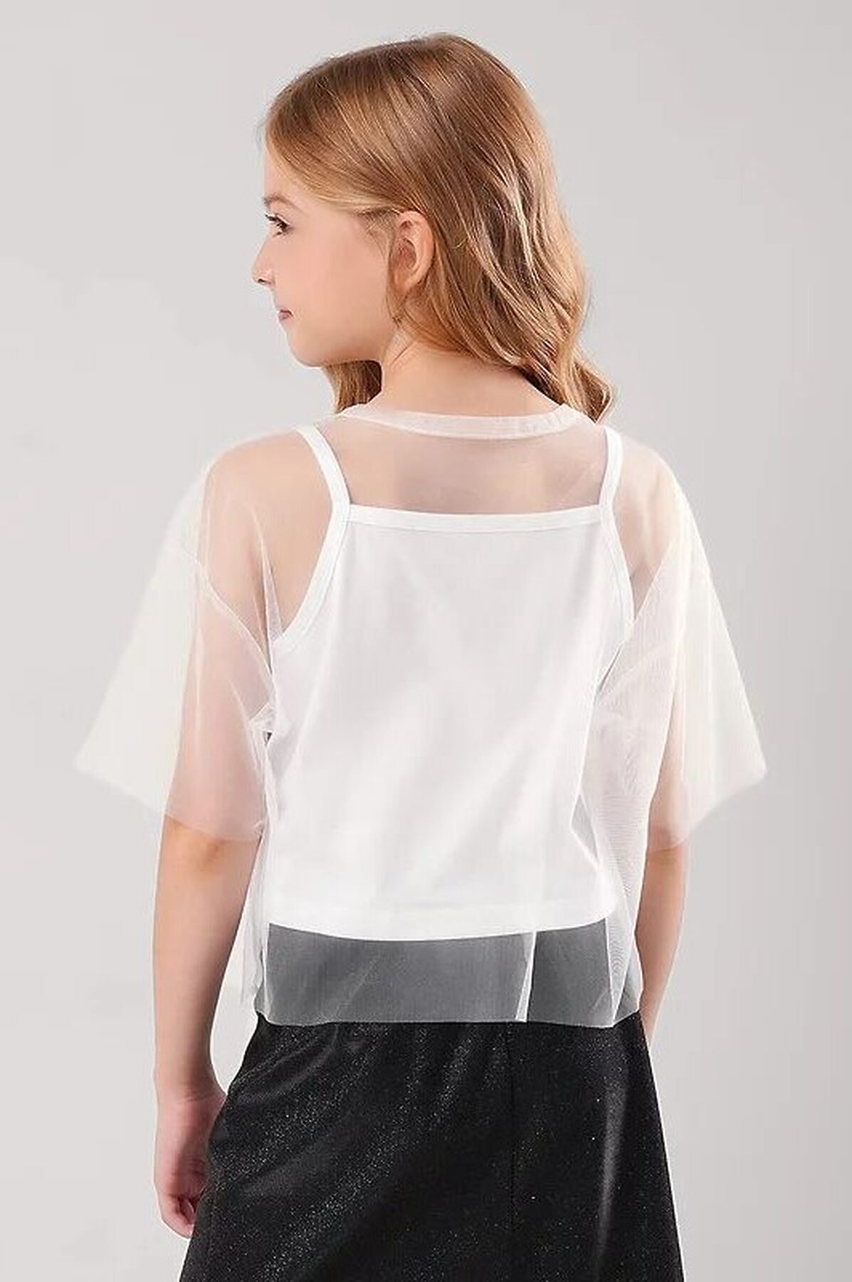 Двухслойная футболка для девочки. Рукава и верхний слой выполнены из сетки, нижний слой - из хлопкового трикотажа с эластаном. Свободная посадка. Стильная модель для праздника.