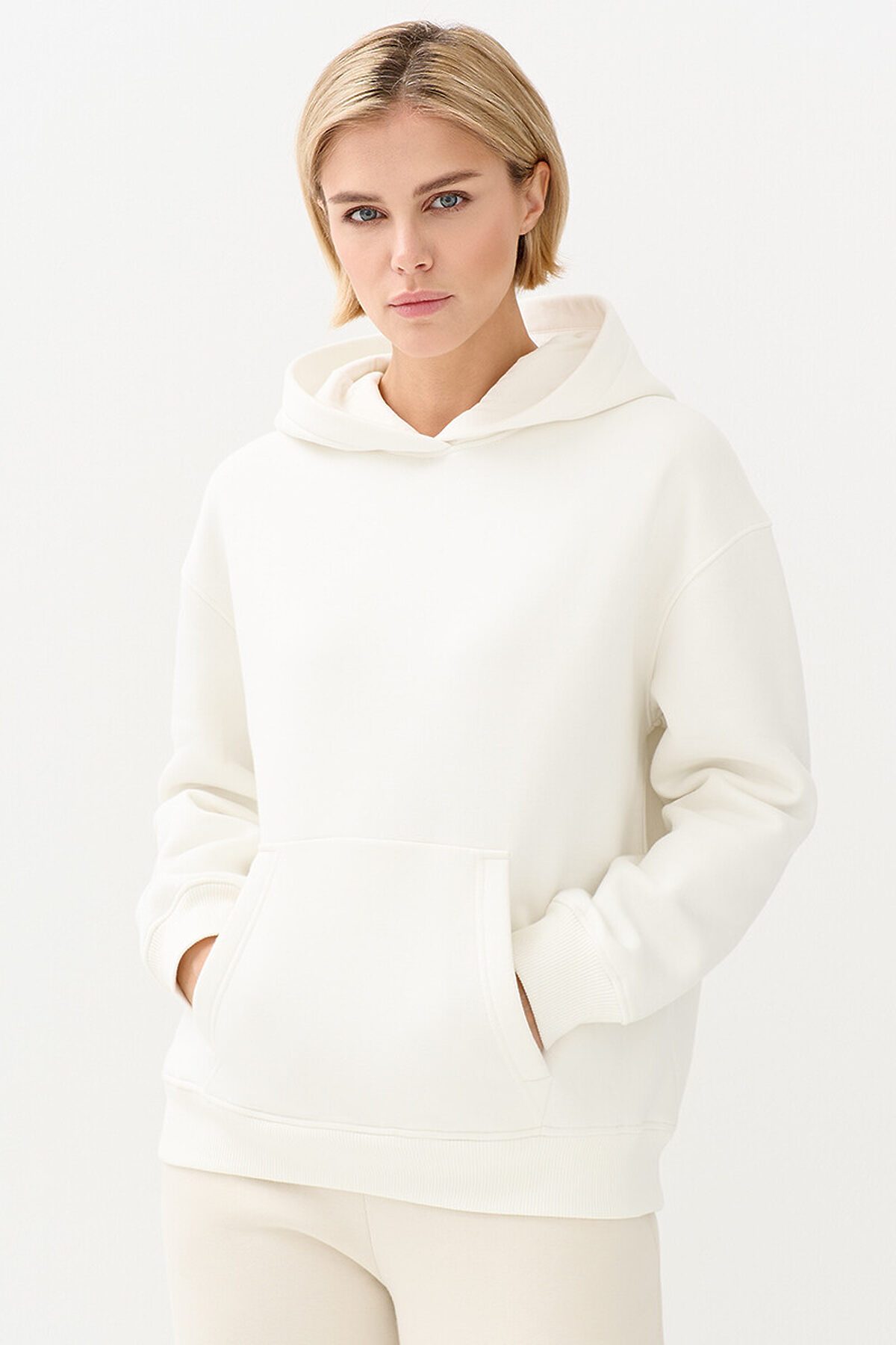 Женское утеплённое худи свободного кроя из мягкого футера с начёсом, со спущенным плечом, длинными рукавами, капюшоном и карманом-«кенгуру» спереди. Манжеты и низ, оформленные рибаной в лаконичный рубчик, добавляют изделию текстурности и делают силуэт более графичным. Трикотажный материал на основе высококачественного хлопка отлично пропускает воздух, приятно ощущается на теле и подходит даже для чувствительной кожи. Добавление полиэстера создает теплосберегающий эффект, а деликатная обработка швов обеспечивает дополнительный комфорт. Стильное и тёплое решение на каждый день: расслабленный силуэт и тактильная мягкость создают атмосферу уюта, а минималистичный дизайн становится универсальной основой для самых разных образов — от спортивных до городских.