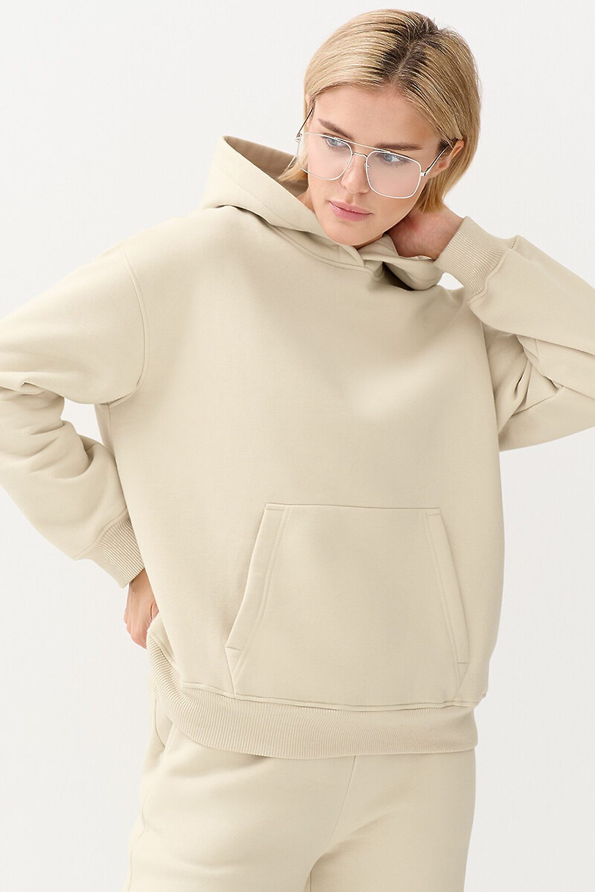 Женское утеплённое худи свободного кроя из мягкого футера с начёсом, со спущенным плечом, длинными рукавами, капюшоном и карманом-«кенгуру» спереди. Манжеты и низ, оформленные рибаной в лаконичный рубчик, добавляют изделию текстурности и делают силуэт более графичным. Трикотажный материал на основе высококачественного хлопка отлично пропускает воздух, приятно ощущается на теле и подходит даже для чувствительной кожи. Добавление полиэстера создает теплосберегающий эффект, а деликатная обработка швов обеспечивает дополнительный комфорт. Стильное и тёплое решение на каждый день: расслабленный силуэт и тактильная мягкость создают атмосферу уюта, а минималистичный дизайн становится универсальной основой для самых разных образов — от спортивных до городских.