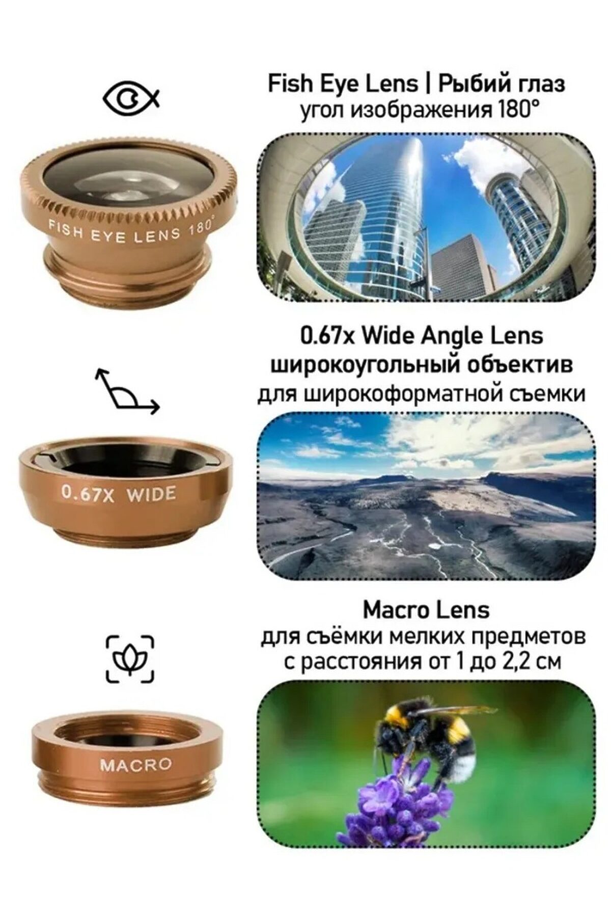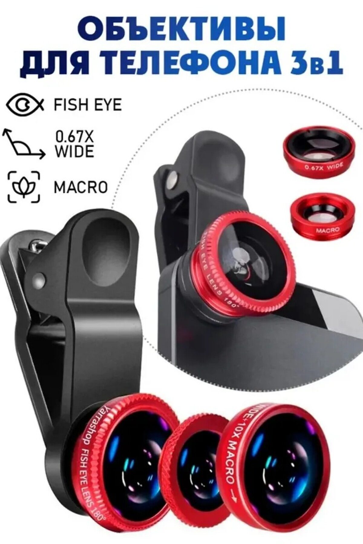 Набор объективов для телефона 3 в 1 на прищепке, цвет ободка объективов ри. Линзы подходят для телефонов и планшетов.В наборе три объектива, 2 защитные крышки, универсальный зажим к телефону в виде прищепки, мешочек для хранения. Объективы к зажиму крепятся с помощью резьбы.Предназначение объективов. Первая линза Wide Angle Lens это широкоугольный объектив, предназначена для широкоформатной съемки с телефона, имеет поле зрения в 140 градусов (0.67Х). Вторая линза Fish Eye объектив Рыбий глаз, угол изображения которого близок к 180 градусам в зависимости от модели телефона. Третья линза это макро объектив, позволяет снимать мелкие предметы, предназначен для макросъемки с расстояния от 1,5 до 2,2 см, позволяет использовать телефон в качестве лупы. Внимание. Широкоформатный объектив используется только совместно с макрообъективом, при откручивании верхней широкоугольной линзы объектив превращается в 10х макрообъектив. Цвет ободка объективов приходит случайным образом.
