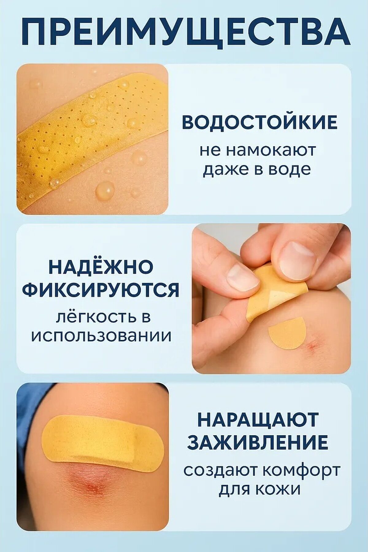 Медицинский пластырь обязательный элемент каждой домашней аптечки. Этот универсальный набор из 100 гипоаллергенных пластырей включает 4 вида, обеспечивая защиту от порезов, ссадин, мозолей и других мелких повреждений кожи. Пластыри изготовлены из мягкого, дышащего материала, который бережно прилегает к коже, не вызывает раздражения и обеспечивает комфорт даже при длительном ношении. Клейкий слой надёжно фиксирует пластырь, предотвращая его смещение и защищая рану от попадания пыли, грязи и бактерий. Благодаря разнообразным формам и размерам, вы легко подберёте подходящий вариант под любой тип ранения будь то палец, колено или другая часть тела.