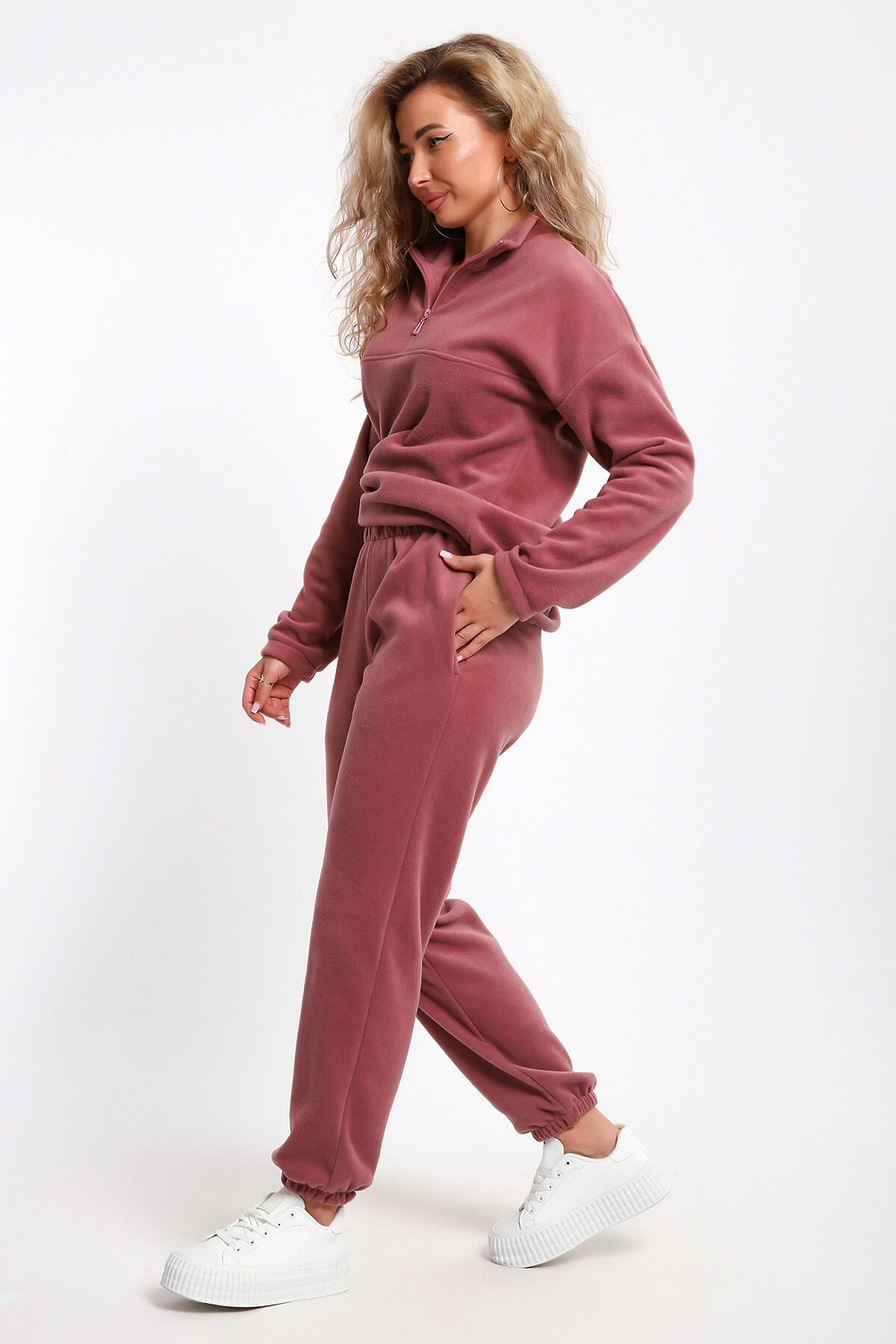 Костюм женский флисовый состоит из толстовки и брюк. Толстовка с кокеткой, на молнии, с воротником-стойкой, рукав спущенный внизу на резинке. Брюки с карманами, внизу на резинке. Костюм мягкий, теплый, удобный, идеально подойдет для прогулок и отдыха в прохладное время года. Молния может отличаться по цвету.