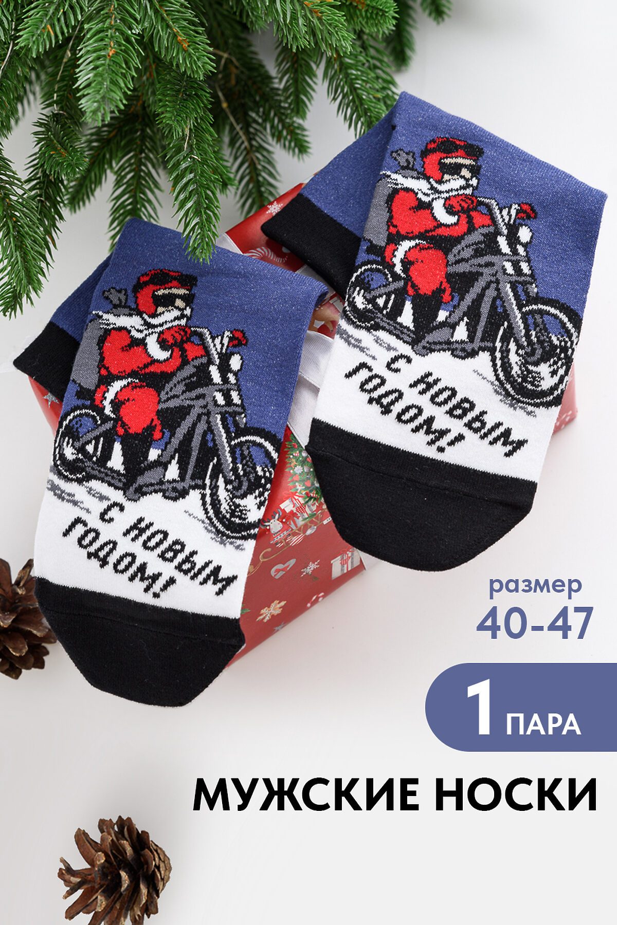 Оригинальные мужские новогодние носки. В комплекте 1 пара. На основной части носка изображение Санта Клауса и надпись С новый годом.