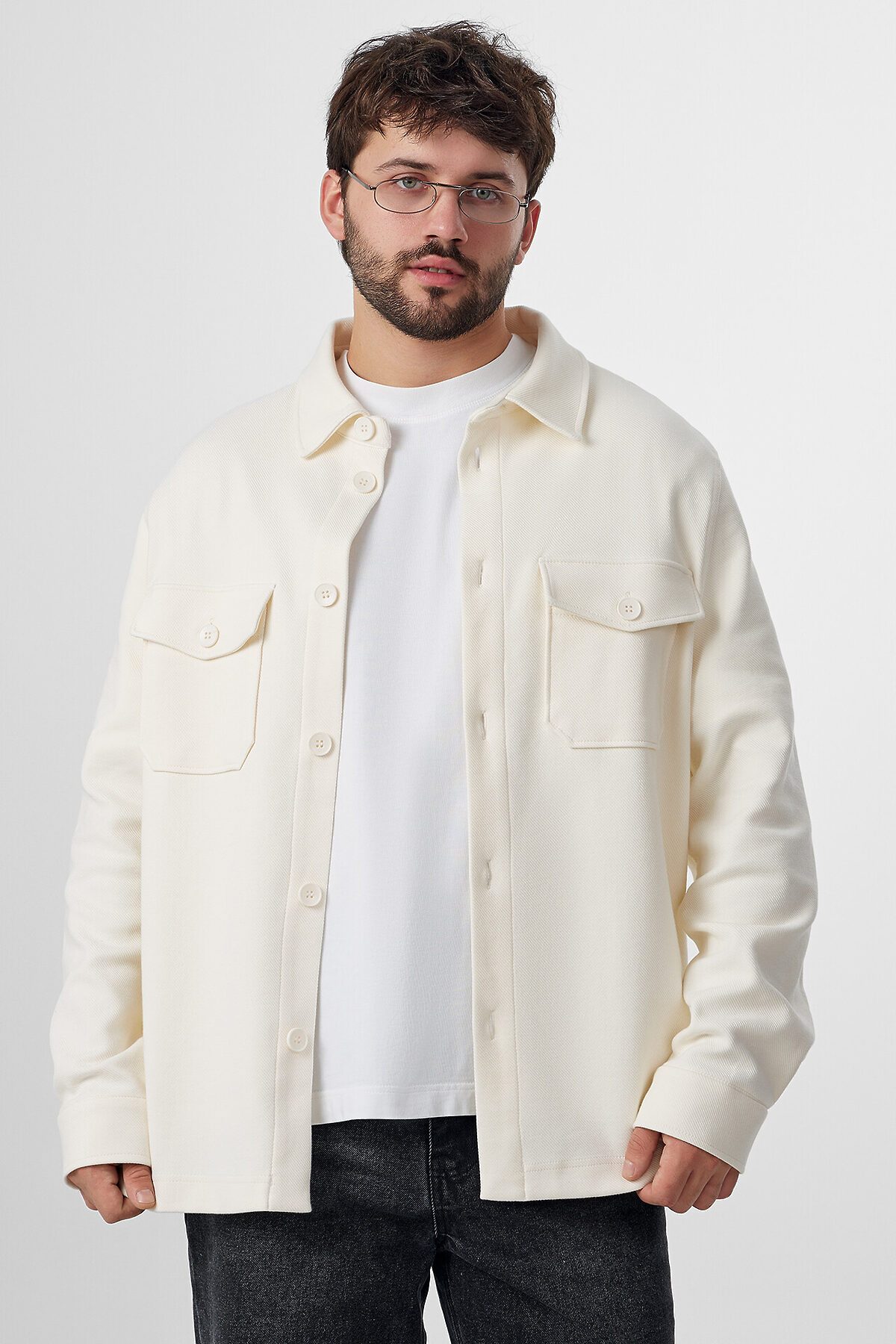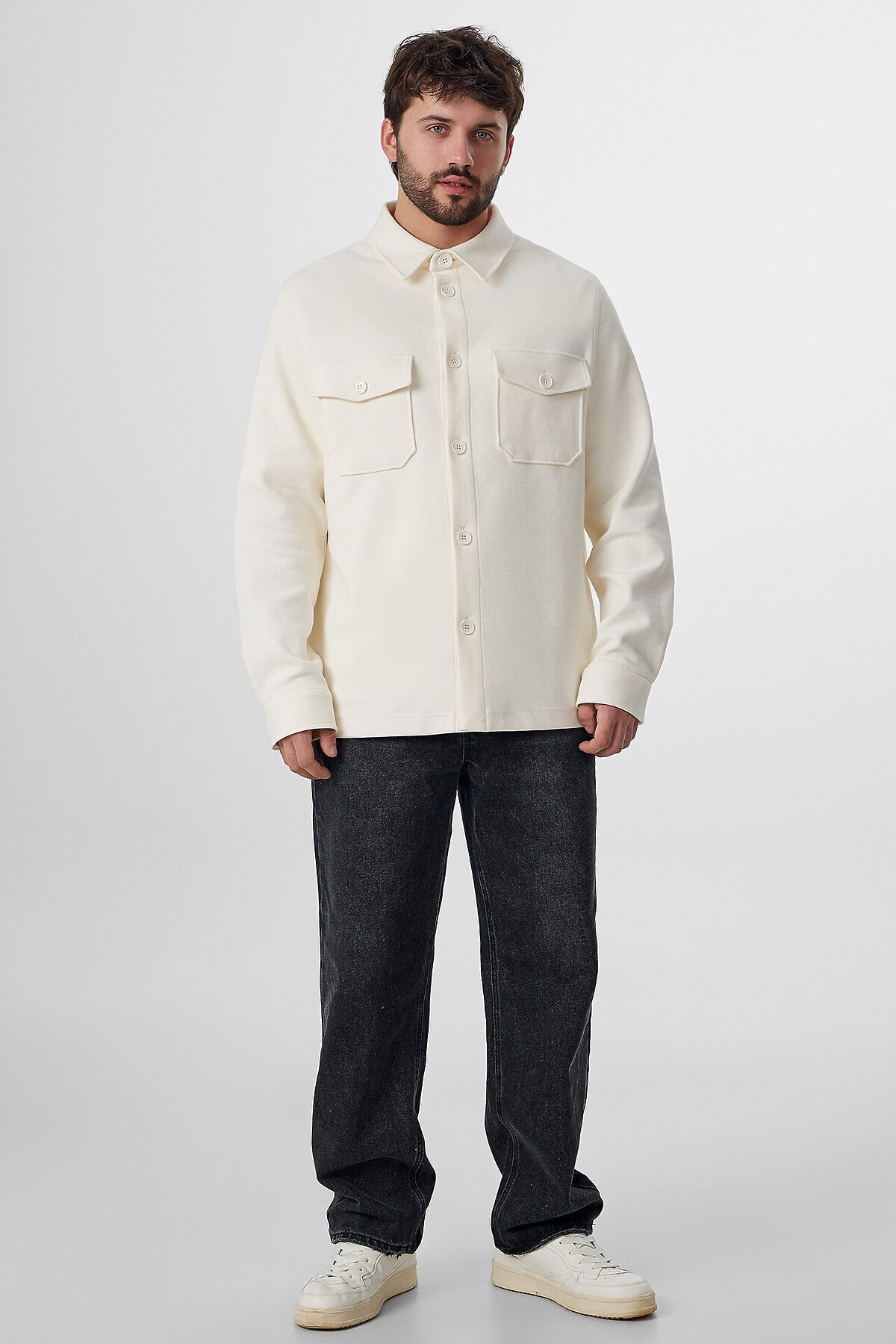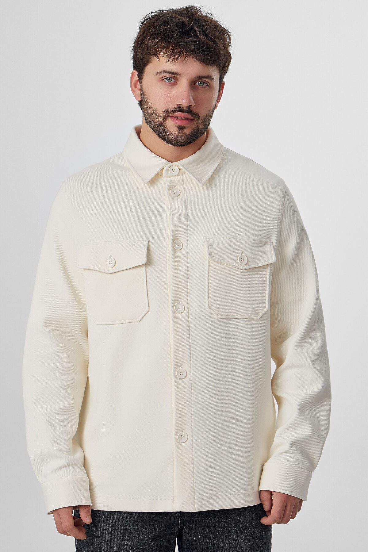 Жакет мужской из трикотажного полотна интерлок (диагональ). Жакет свободного прямого силуэта. Вырез горловины круглый с рубашечным воротником. Центральная застежка на пуговицы (d=20 мм). На деталях переда накладные карманы с клапанами, с застежкой на пуговицы. Линия плеча слегка спущена. Рукава втачные длинные. Манжеты отрезные с застежкой на пуговицу.Отделочные строчки по окату рукава, плечевым швам. Нижний срез жакета обработан швом вподгибку.