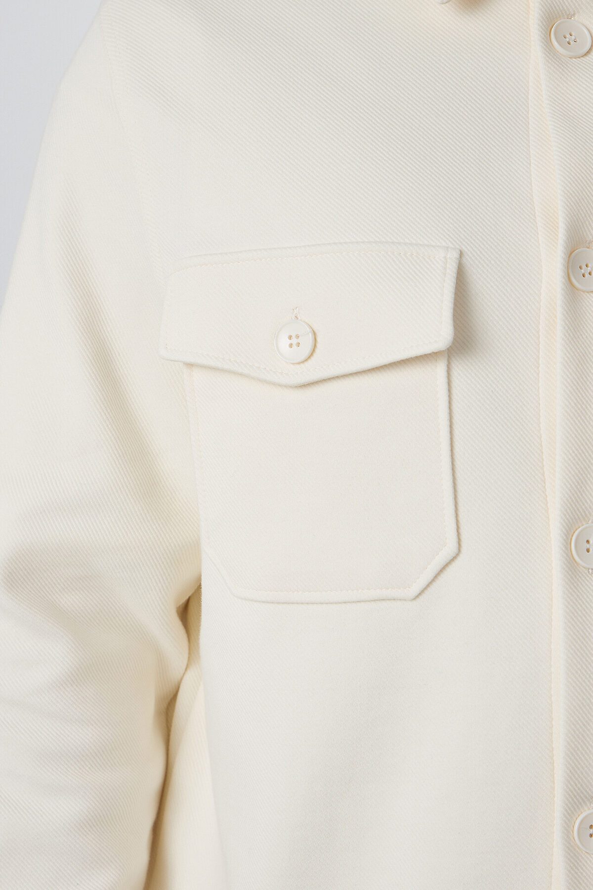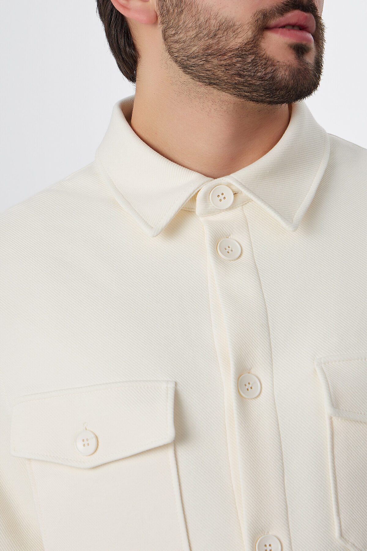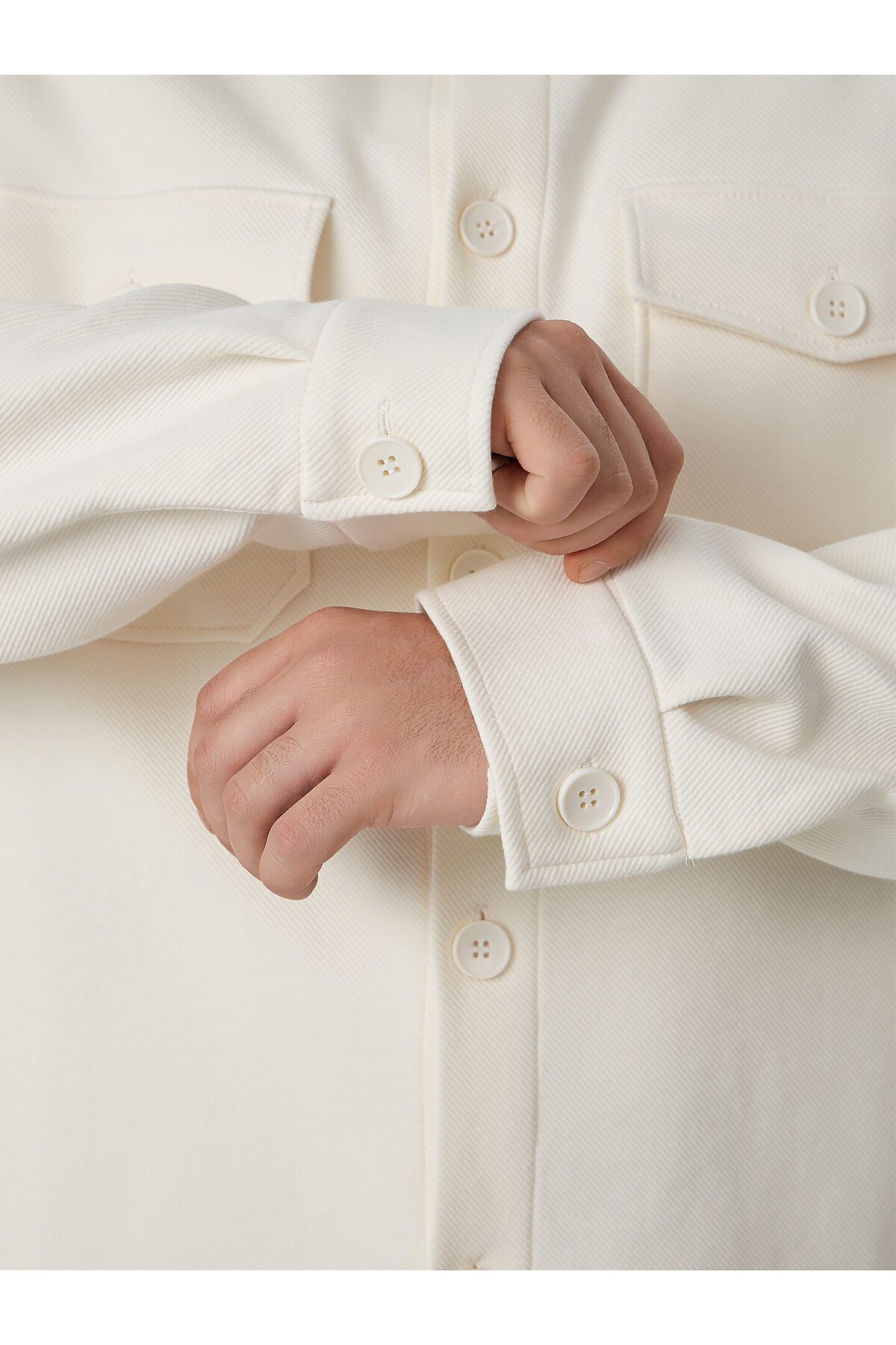 Жакет мужской из трикотажного полотна интерлок (диагональ). Жакет свободного прямого силуэта. Вырез горловины круглый с рубашечным воротником. Центральная застежка на пуговицы (d=20 мм). На деталях переда накладные карманы с клапанами, с застежкой на пуговицы. Линия плеча слегка спущена. Рукава втачные длинные. Манжеты отрезные с застежкой на пуговицу.Отделочные строчки по окату рукава, плечевым швам. Нижний срез жакета обработан швом вподгибку.