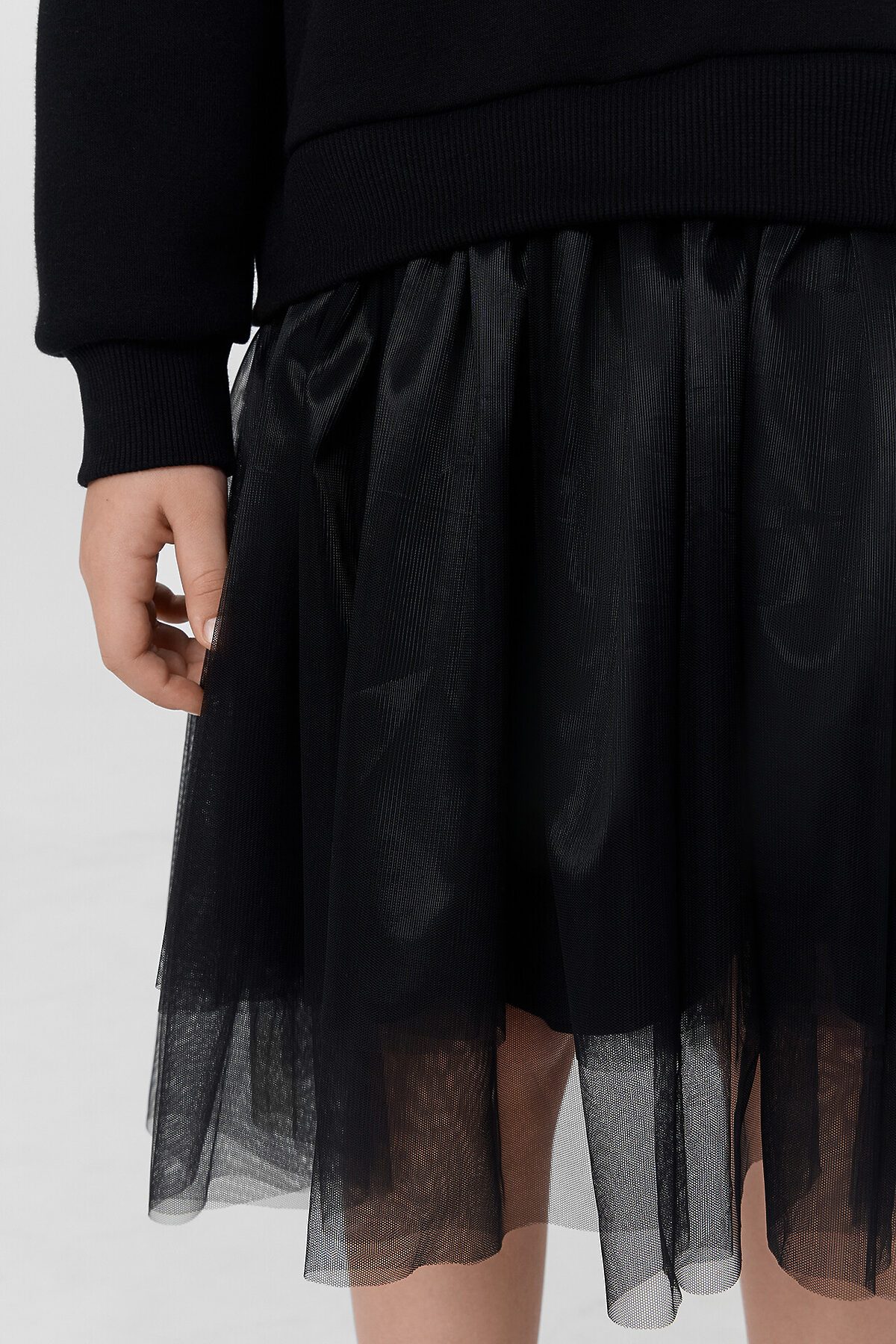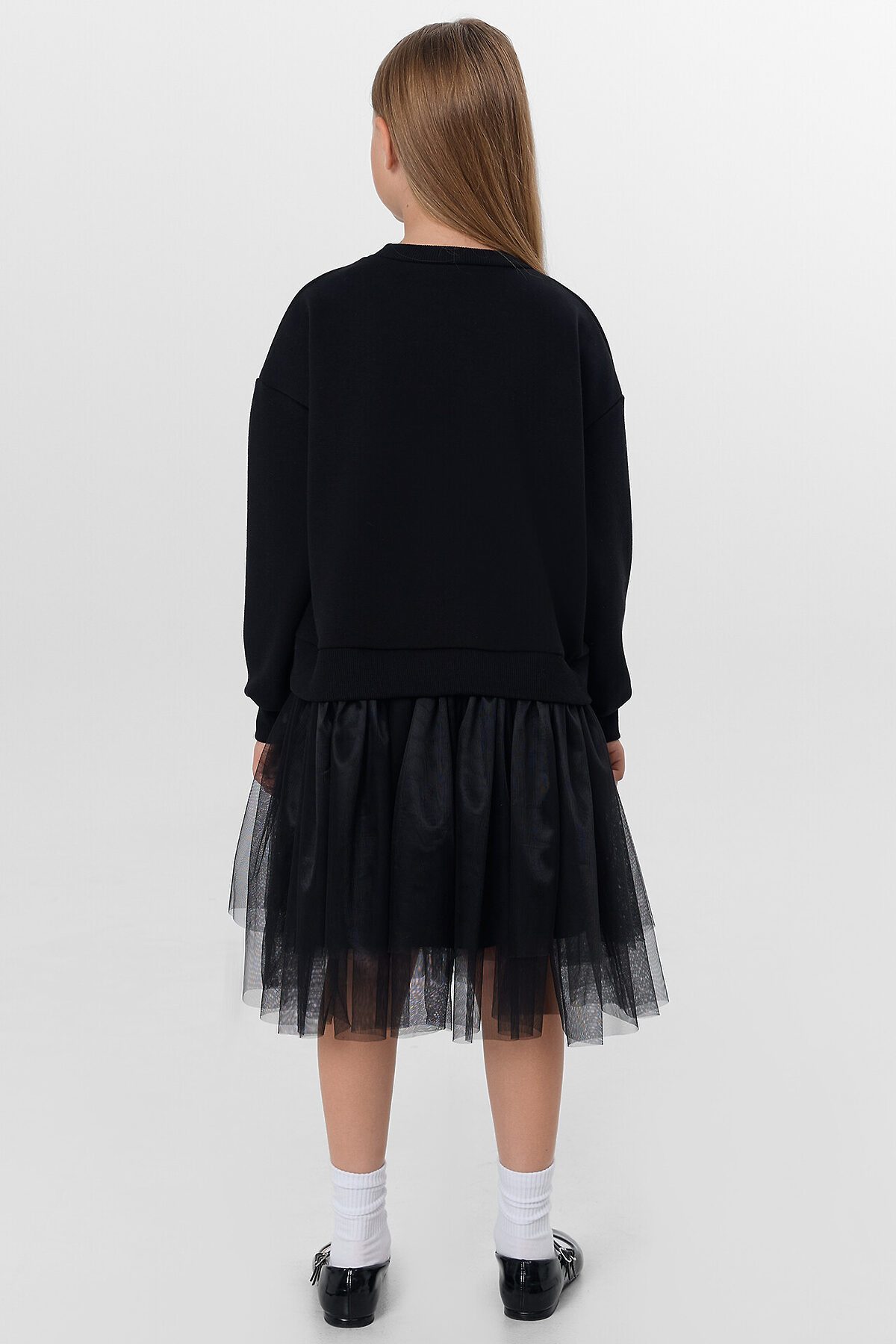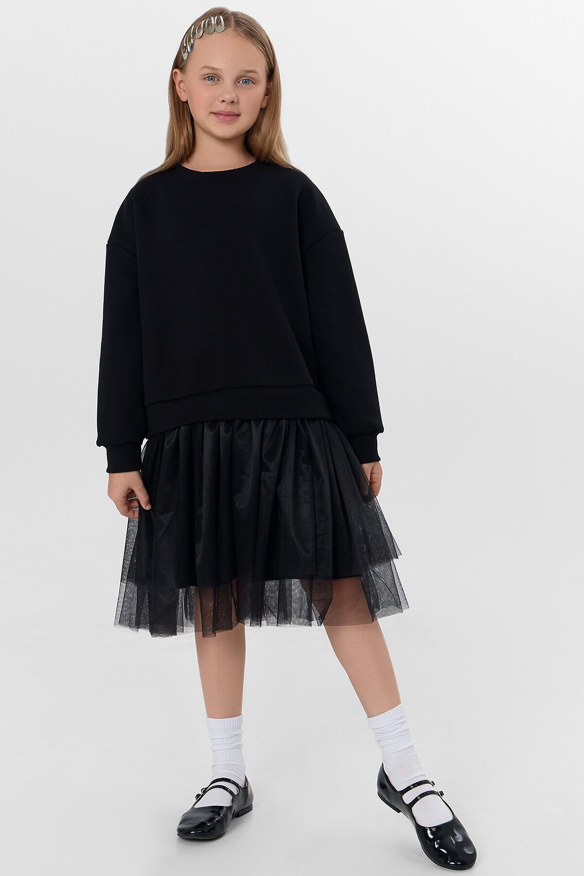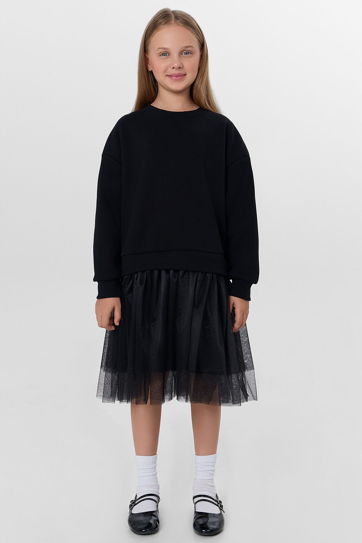 Платье для девочек свободного силуэта. Рукава втачные длинные, с отрезными манжетами из рибаны. Плечо слегка спущено. Горловина округлый формы с обтачкой из рибаны. Низ изделия обработан рибаной .