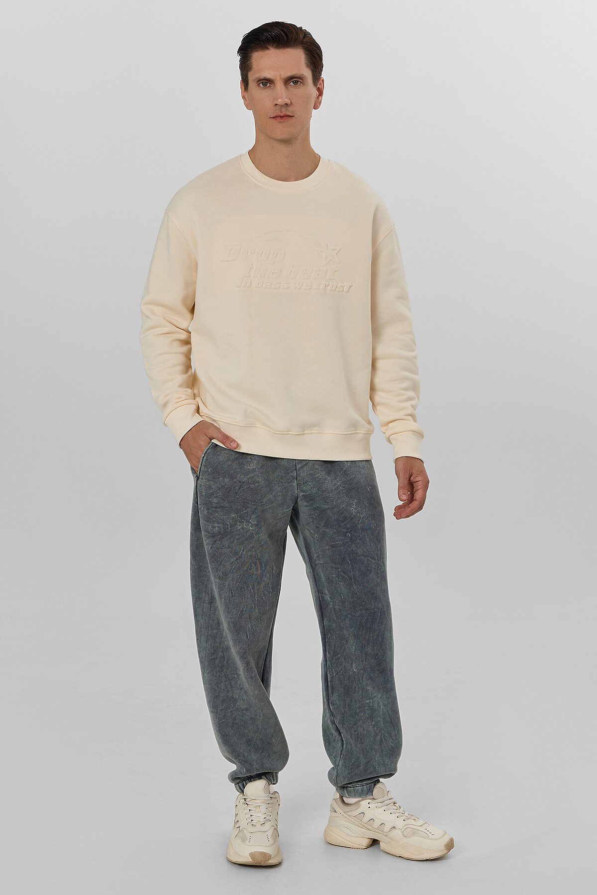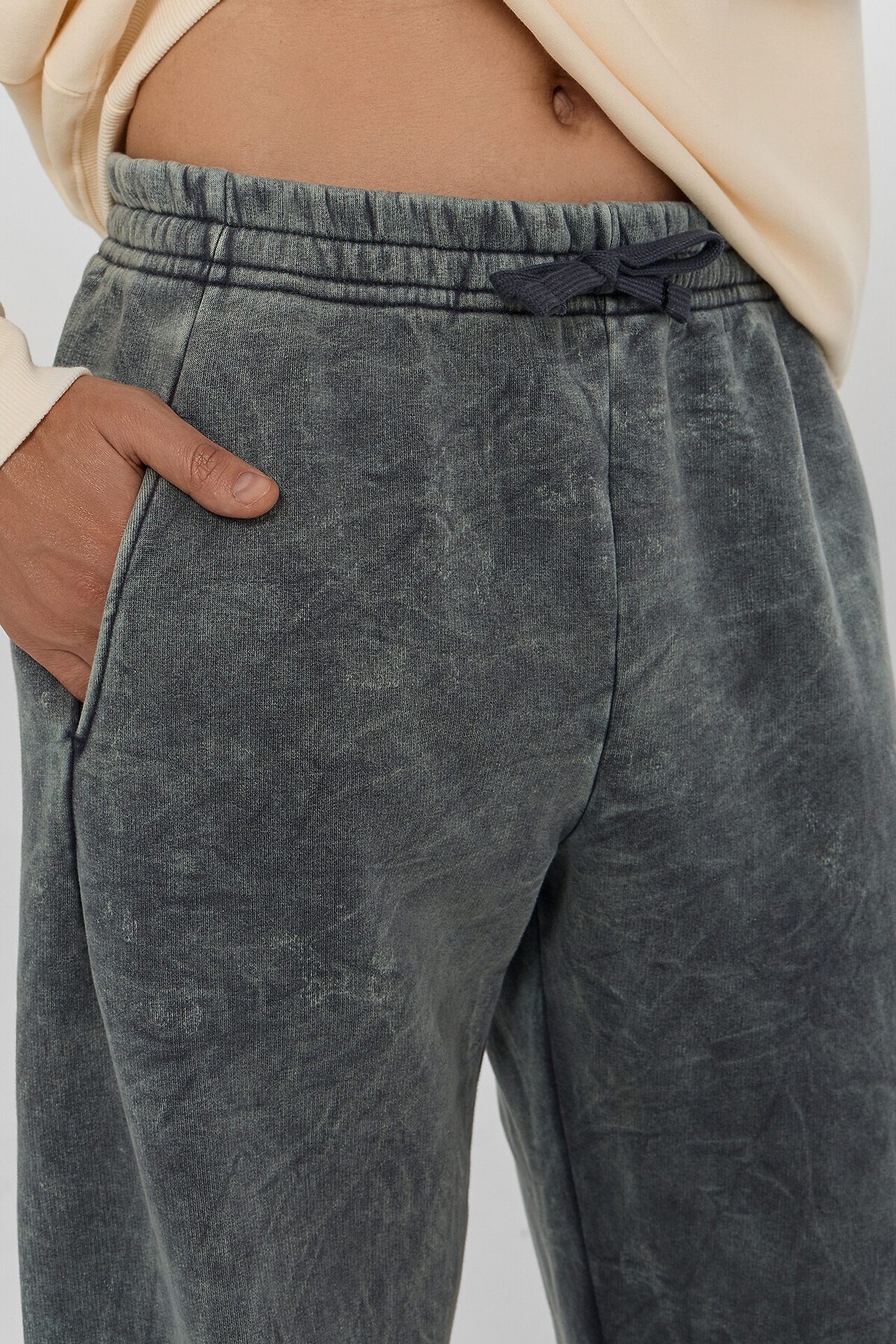 Джоггеры мужские изготовлены из полотна трикотажного футер 3-х нитка (без подчёса). Джоггеры свободные, посадка средняя. Джоггеры без бокового шва. Пояс цельнокроёный с эластичной тесьмой внутри. По переду пробиты петли и втянут шнур с застроченными концами (10РХC-1 10мм). На деталях переда карман в вытачке. Мешковина кармана из основного полотна. Нижние срезы обработаны швом вподгибку с эластичной тесьмой внутри.