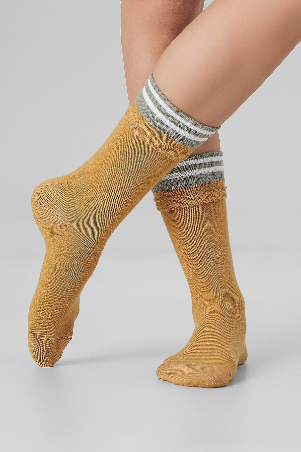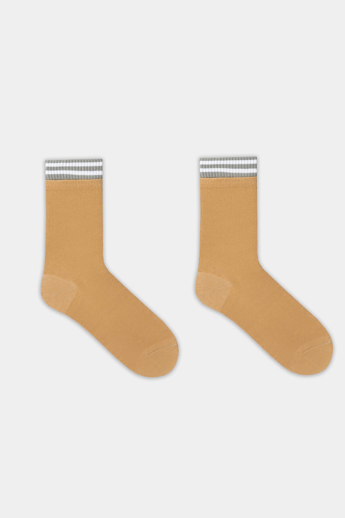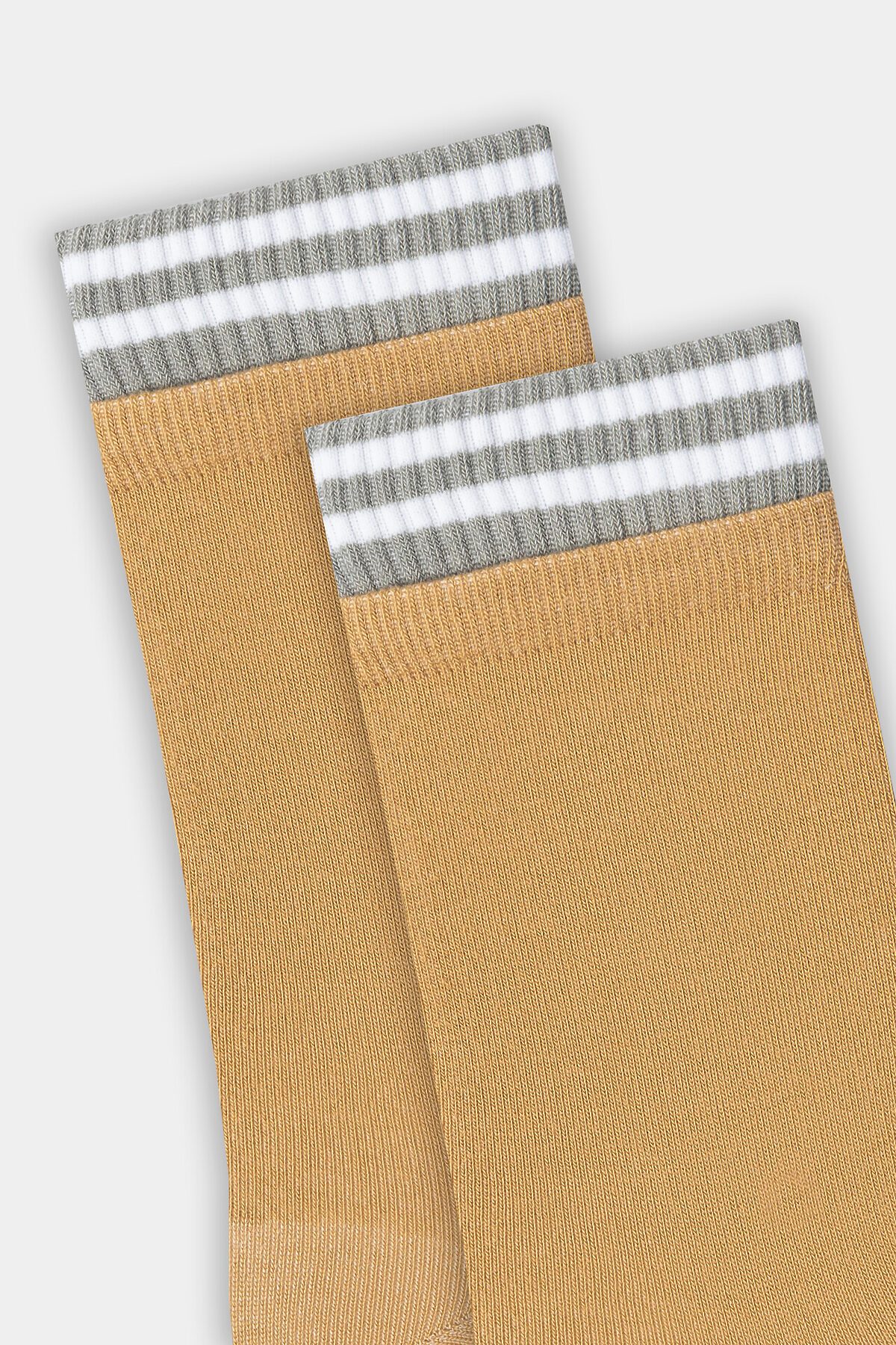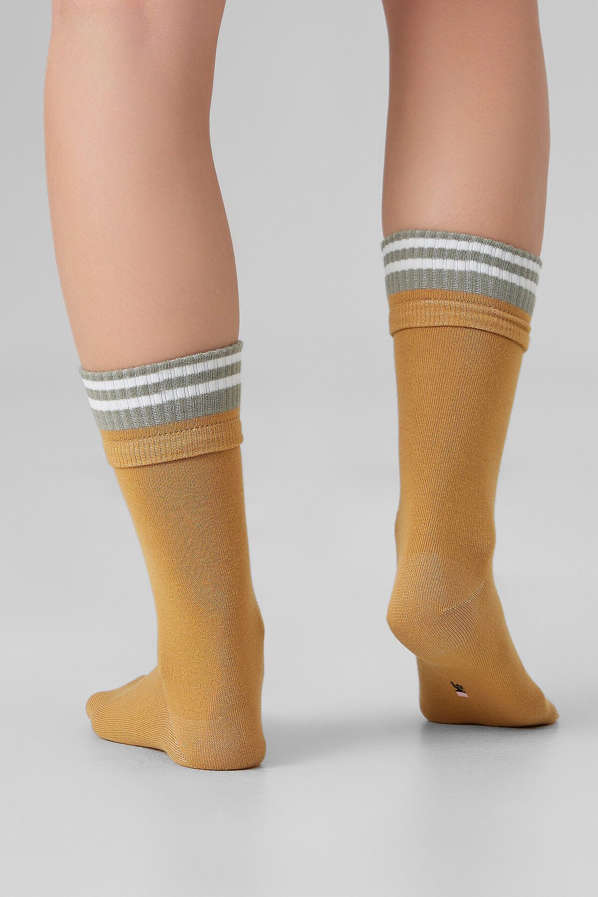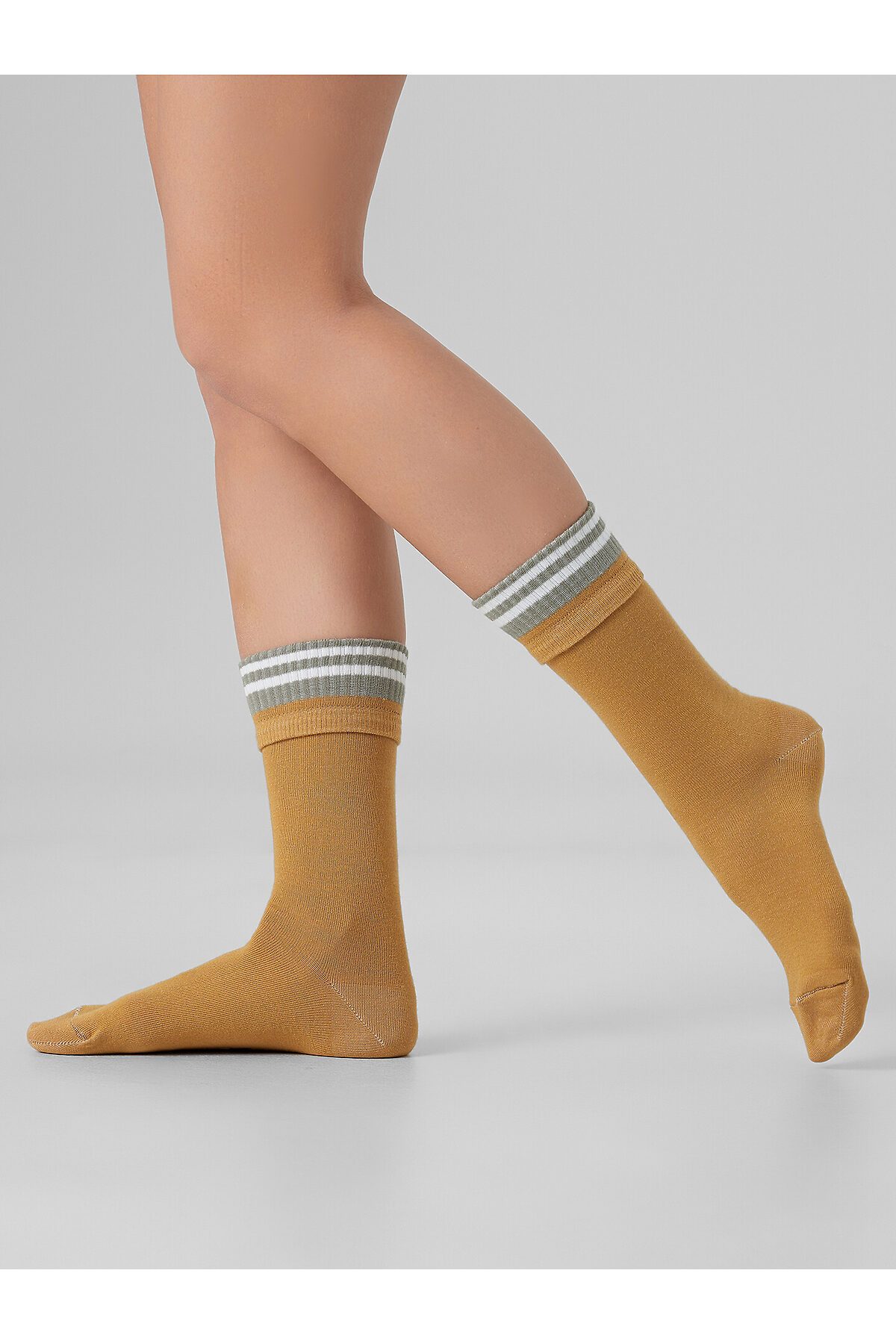 Женские носки высокие с многослойным бортом — это стильный аксессуар, который сочетает в себе лаконичный дизайн и повседневный комфорт. Модель украшена рисунком в виде полосок и многослойным бортом, что добавляет образу динамичности и современности.