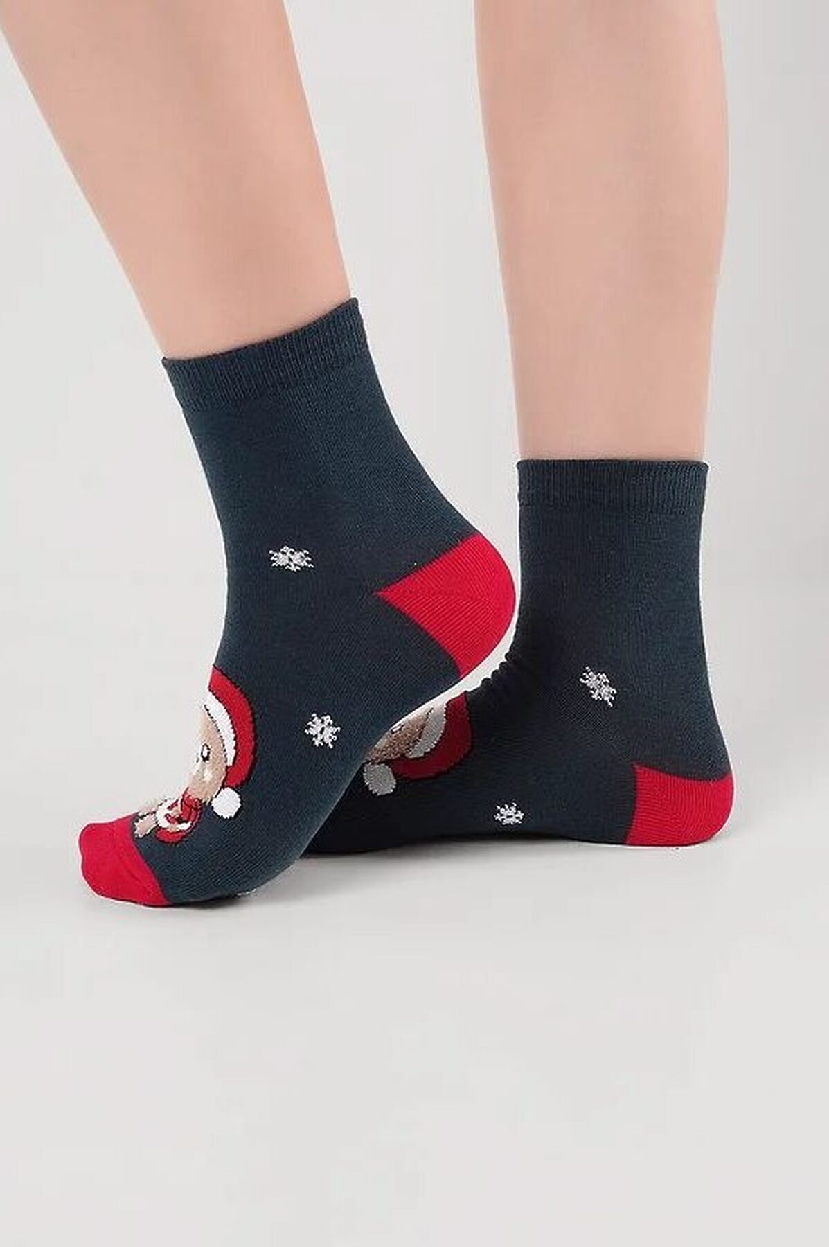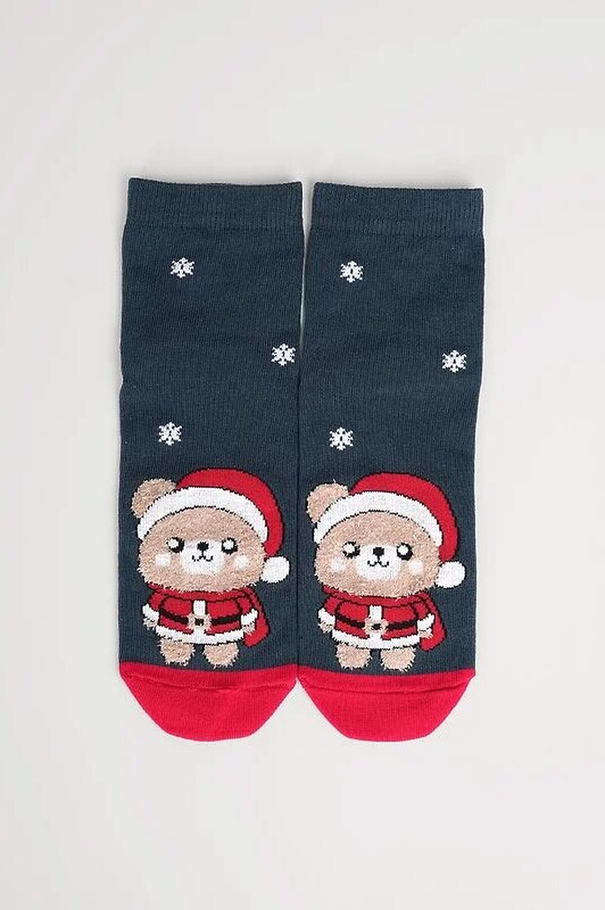 Носки детские с выделенным мысо и пяткой, с рисунком медведя в новогоднем костюме, тело медведя выполнено из пряжи травка