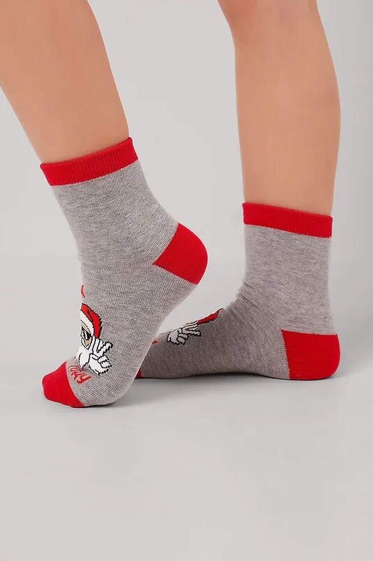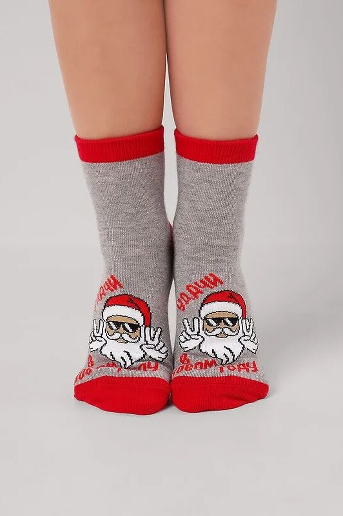 Детские носки с выделенным мыском, пяткой и бортом, с рисунком лицо деда мороза и надписью удачи в новом году
