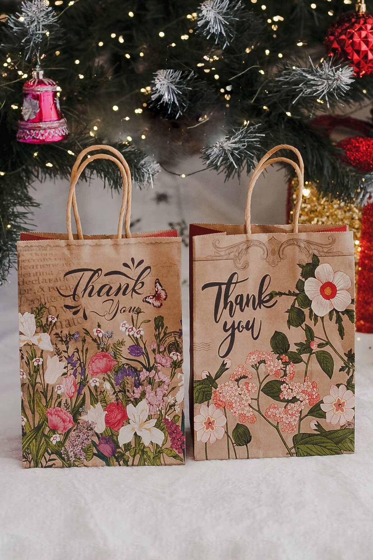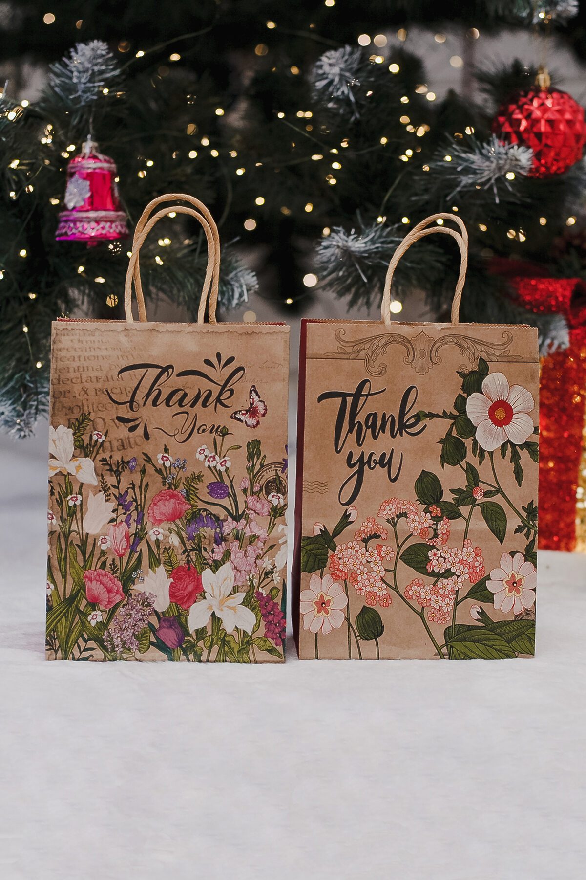 Набор из 2шт крафт-пакетов размером 21158 см стильная и практичная упаковка для праздничных подарков. Пакеты выполнены из плотной крафт-бумаги и аккуратными бумажными ручками, украшены цветочным принтом и надписью Спасибо, что делает их готовыми к использованию для подарка. Каждый пакет выдерживает небольшие наборы и сувениры (например, косметику, сладости, свечи, аксессуары), прекрасно смотрится с бумажной стружкой или крафт-этикеткой и отлично подходит для корпоративных подарков, подарочных наборов, праздников и ярмарок. Экологичный материал биоразлагаем и пригоден для вторичной переработки, хранить пакеты лучше в сухом помещении, избегая длительной влажности.