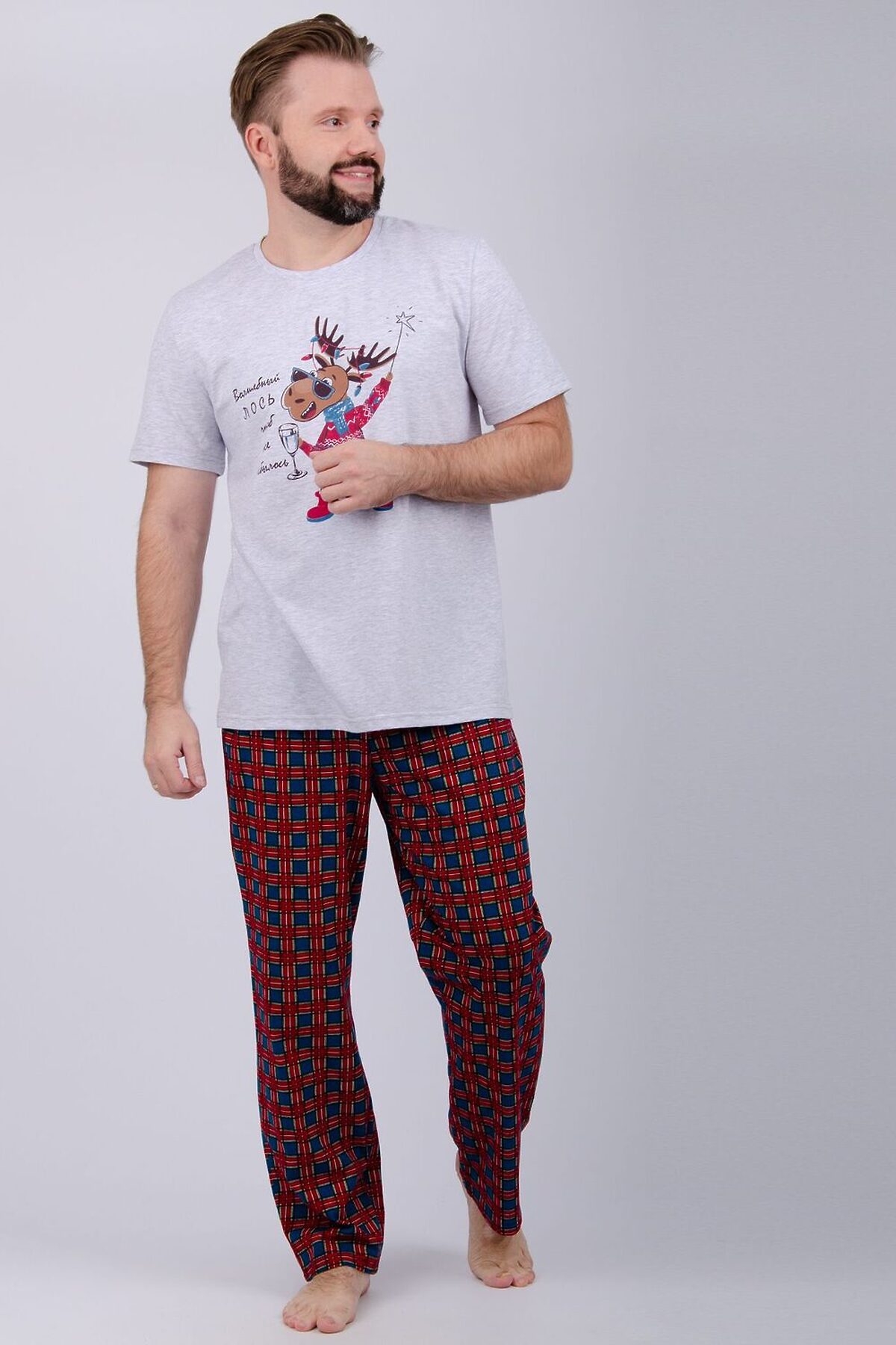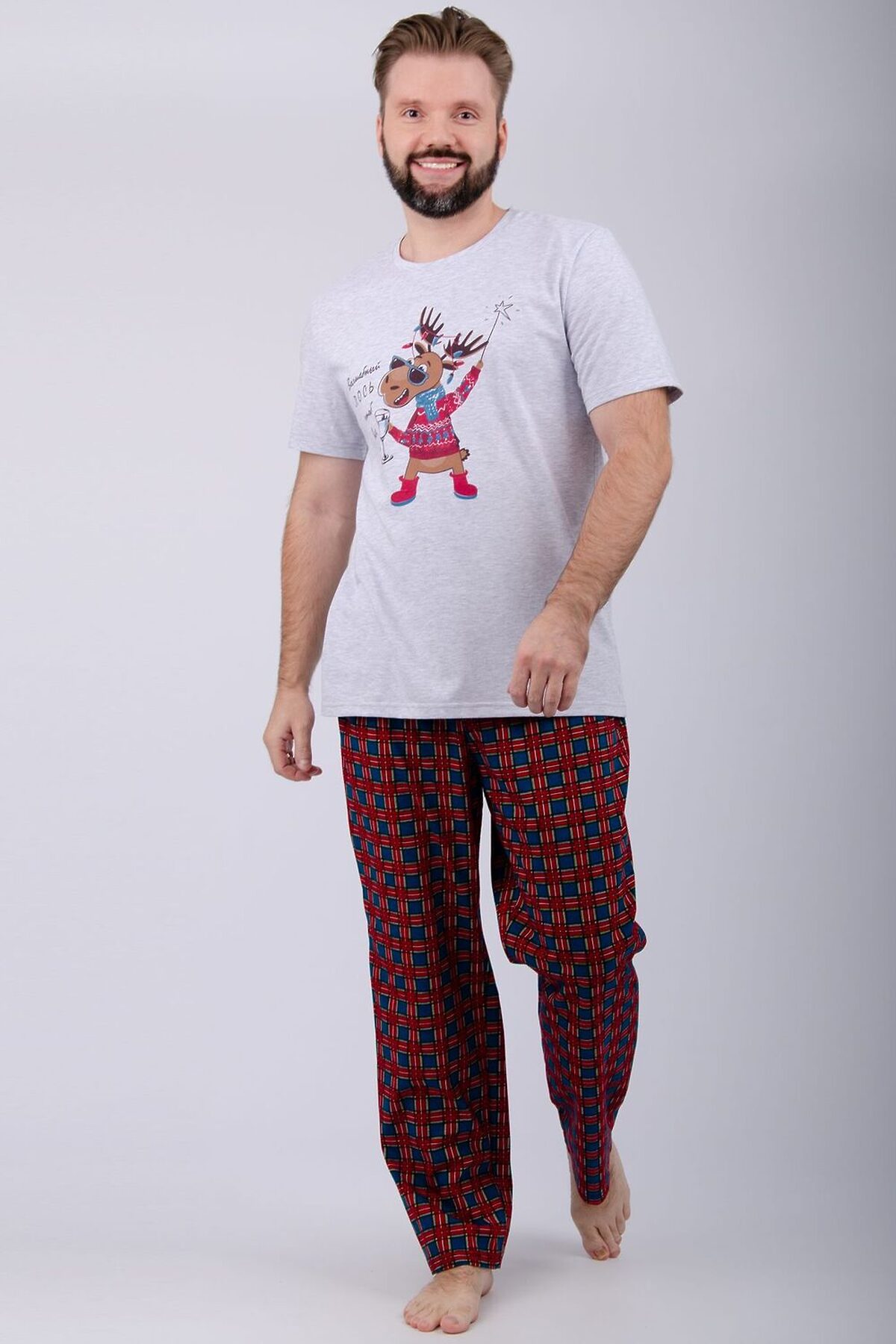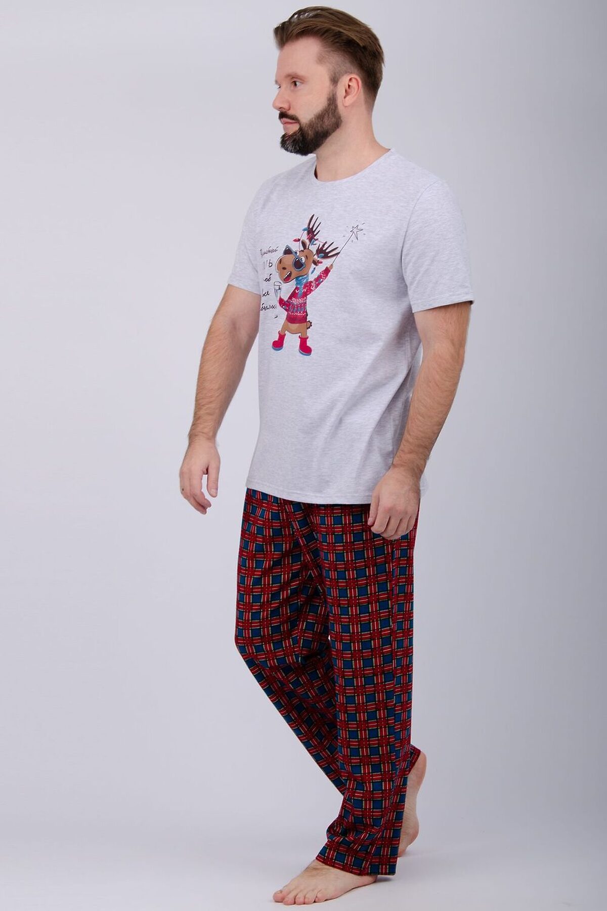 Пижама мужская: футболка прямого кроя с короткими рукавами с принтом на полочке, брюки прямые, с карманами в боковых швах.