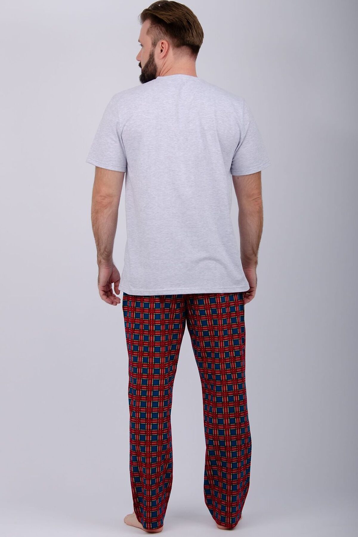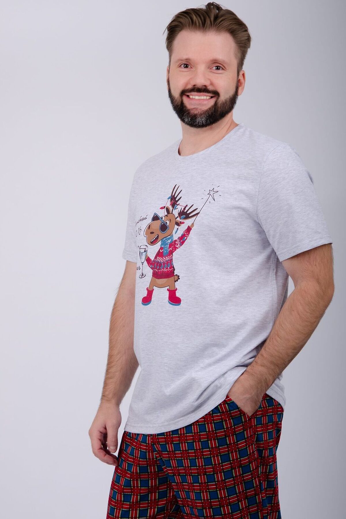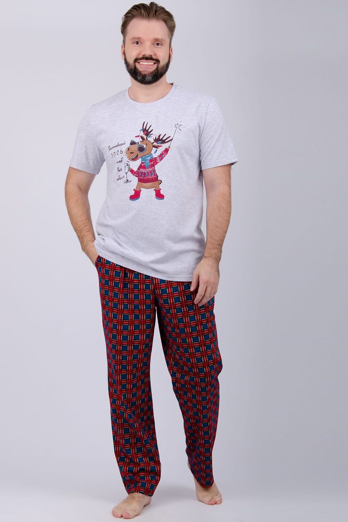 Пижама мужская: футболка прямого кроя с короткими рукавами с принтом на полочке, брюки прямые, с карманами в боковых швах.