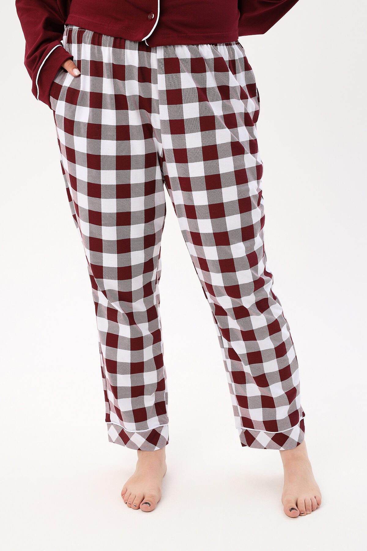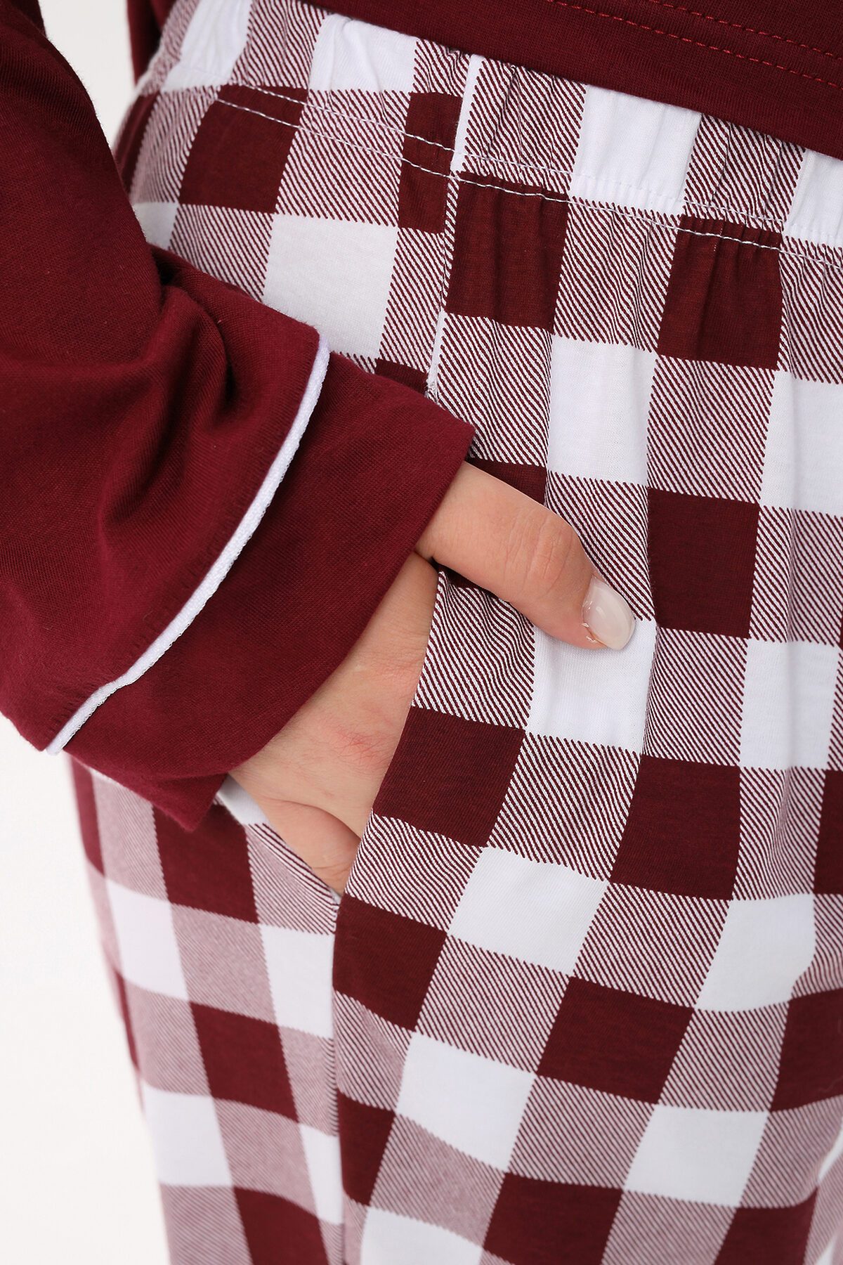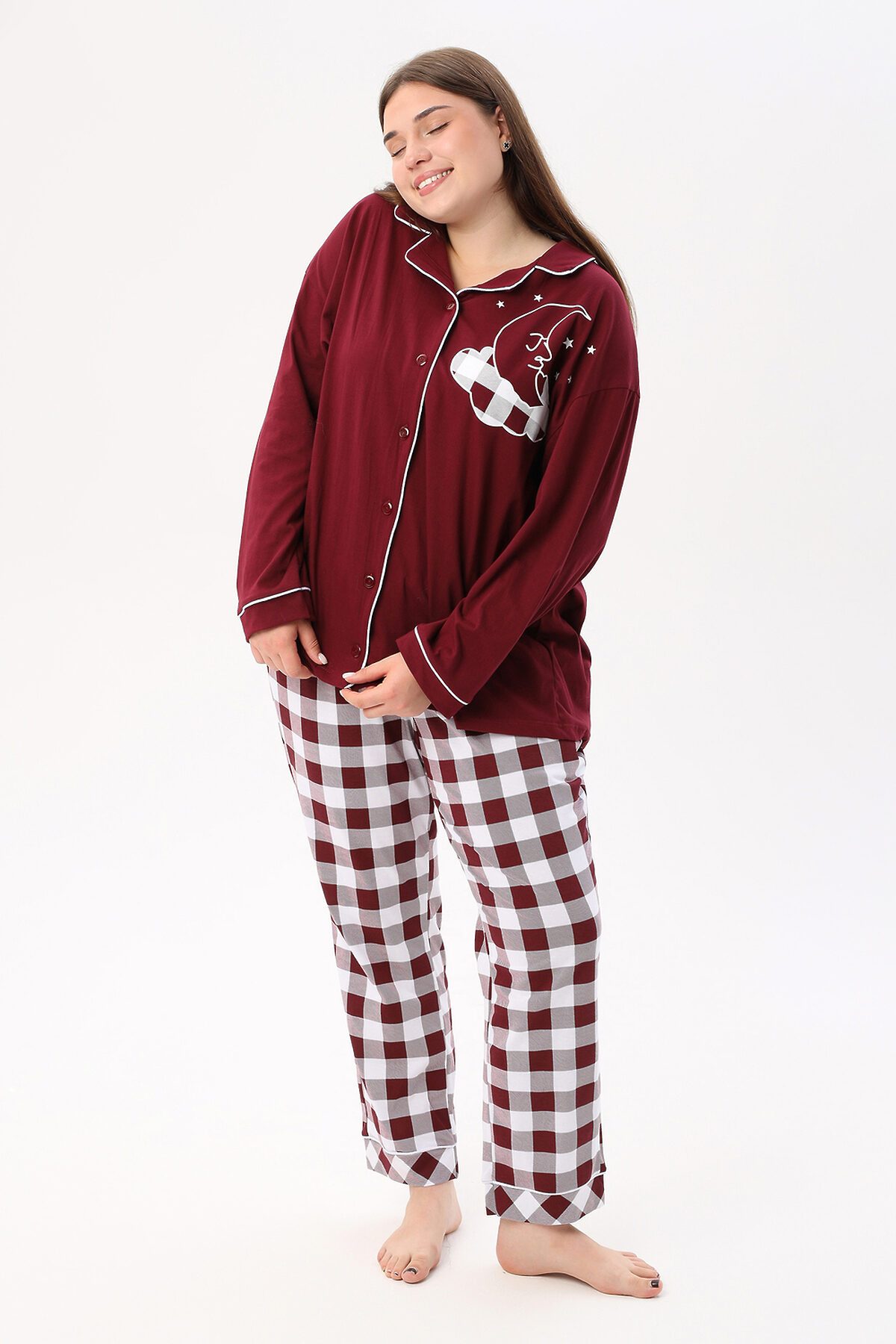 Набор пижамы В Размере из коллекции 2026 станет идеальным выбором для комфортного отдыха дома в прохладные осенние вечера. Этот утепленный комплект, выполненный из 100% хлопка, подарит вам ощущение нежности и тепла. Мягкая рубашка с длинным рукавом и прямые штанишки на резинке с удобными карманами в шве создают стильный и уютный образ. Рисунок в виде бордовой сетки придает пижаме особый шарм, а свободный крой обеспечивает максимальный комфорт для женщин plus size. Легкий трикотажный материал приятен к телу и не сковывает движений. Этот набор станет прекрасным подарком на Рождество или для тех, кто ценит комфорт и уют. Благодаря натуральным материалам и продуманному крою, пижама В Размере станет вашим любимым спутником в холодные осенние ночи.