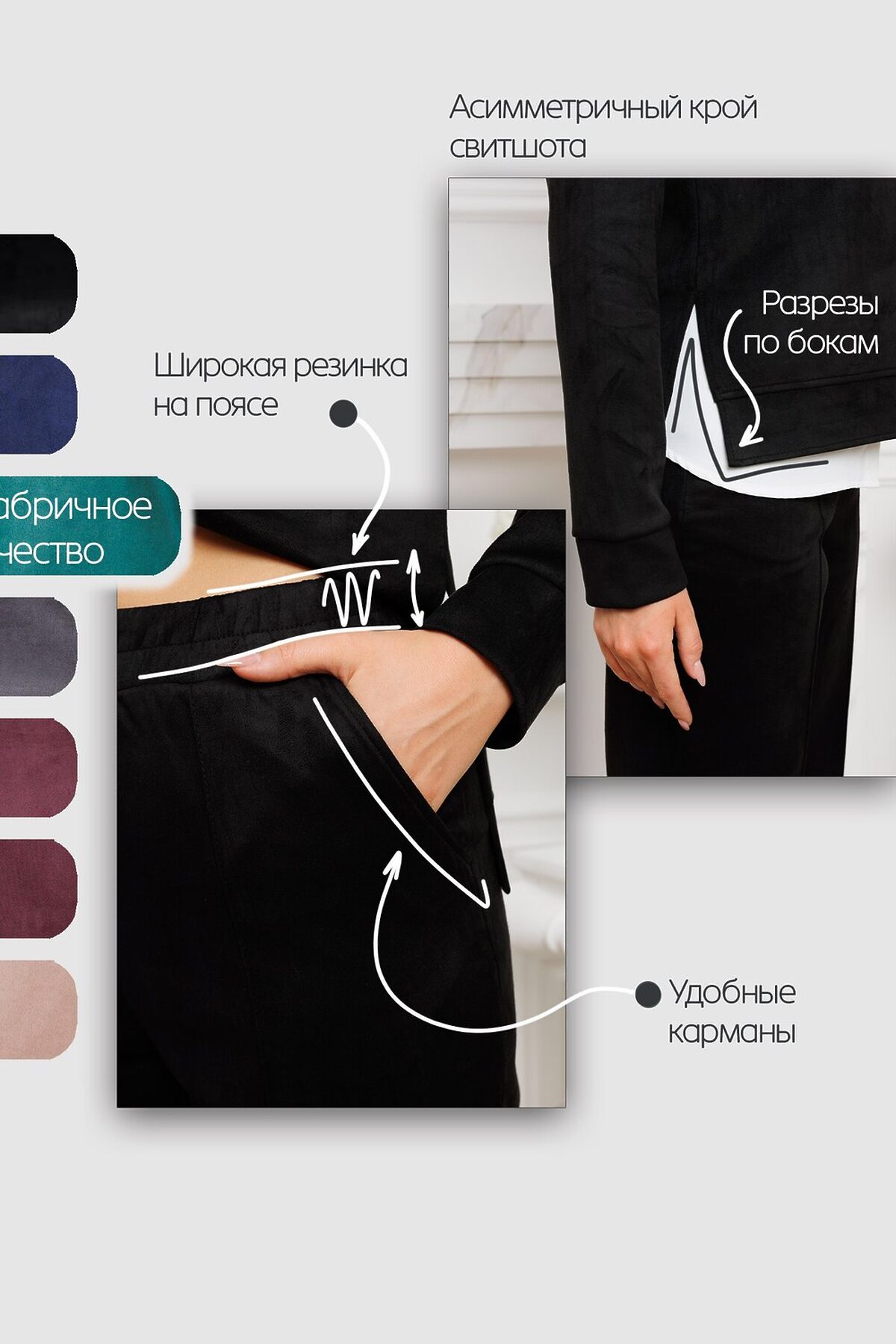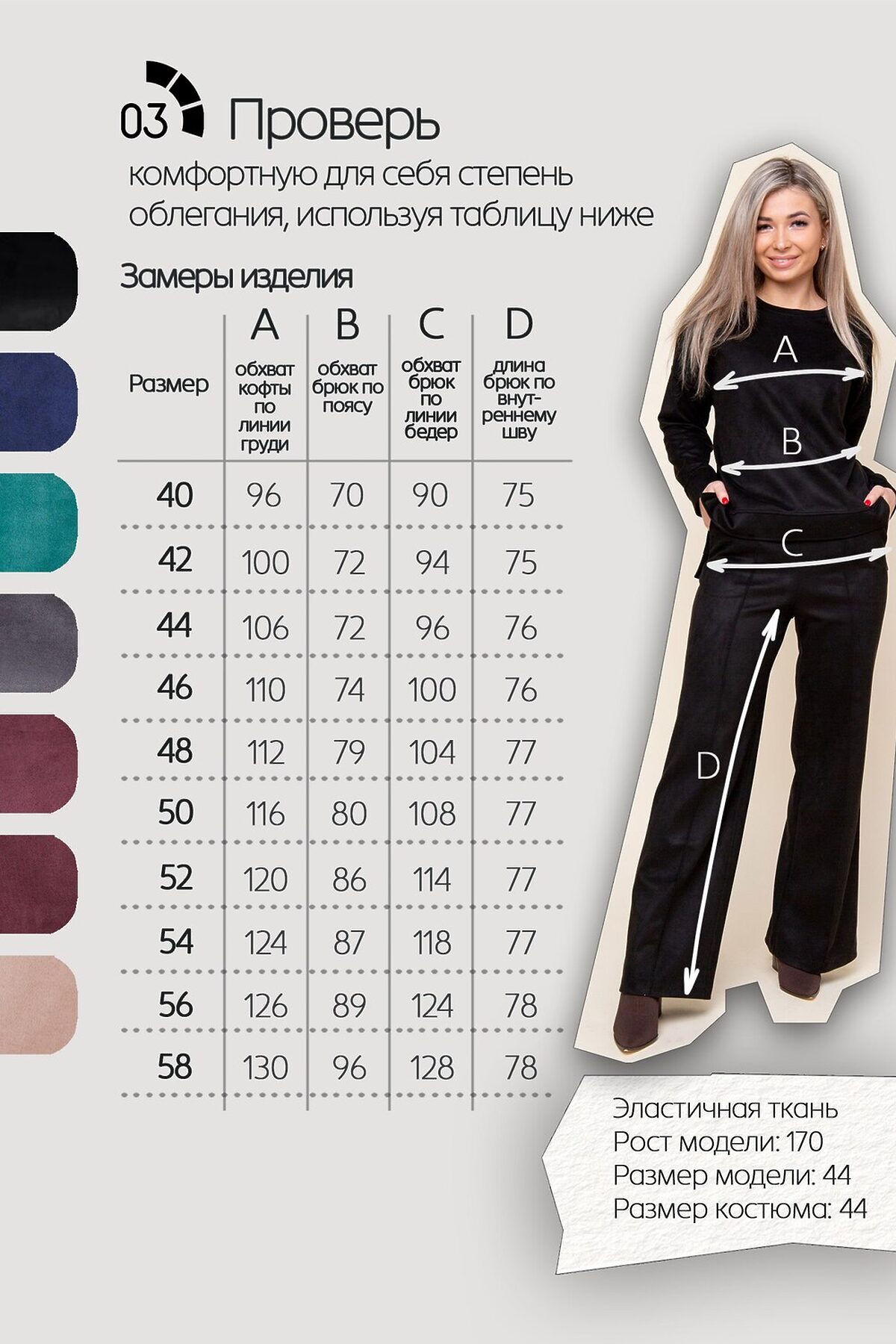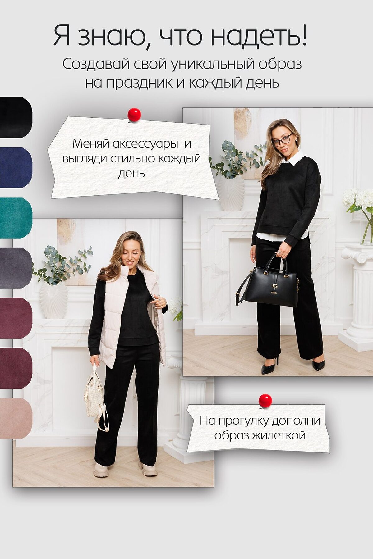 Женский брючный замшевый костюм от российского производителя бренда женской одежды. Невероятно мягкий, удобный теплый комплект из замшевого материала приятного к телу в составе лонгслива и свободных брюк палаццо. Свитшот с длинным рукавом, округлым вырезом горловины. Разрезы по боковым швам кофты и асимметричный крой верха с удлиненной спинкой. Прямые брюки с широкой резинкой на поясе, карманами с отрезным бочком и эффектными отстроченными стрелками по фасаду изделия стойнят силуэт. Необычное дизайнерское решение позволило совместить элегантную классику и эффектный стиль. Базовый вариант подойдет для повседневного ношения в офис или на деловую встречу. На любом мероприятии Вы будете чувствовать себя нарядно и комфортно. Стильный классический костюм подойдет для любого вечера или праздника. Универсальность модели позволит носить его, как в теплые весенний и летний сезоны, так и в холодное время года осень зима. Комплект подойдет для женщин невысокого роста, а также для высоких девушек. Такая двойка гармонично впишется в спортивный или домашний стиль. Трендовый дизайн с элементами олд мани создает шикарный и современный вид. Модель выполнена из легкой, но теплой ткани, что делает ее идеальной для прохладной погоды. Свободные брюки палаццо обеспечивают удобство движения, а джемпер сохраняет тепло. Каждый элемент костюма может носиться отдельно в сочетании с другими элементами гардероба, создавая модные образы. Трендовый костюм позволит подчеркнуть стройность Вашей фигуры. Модель доступна в больших размерах плюс сайз - 50, 52 и 54, будет шикарно смотреться в любом возрасте, подойдет для полных девушек и беременных женщин. Перед использованием рекомендуется предварительная стирка отдельно от других вещей.