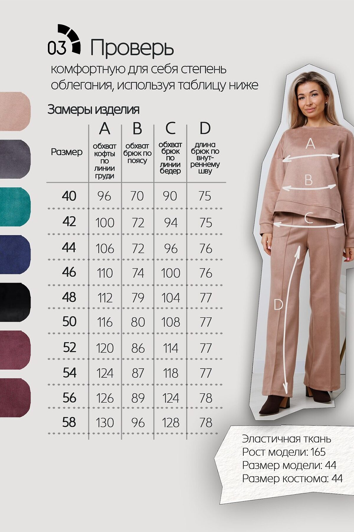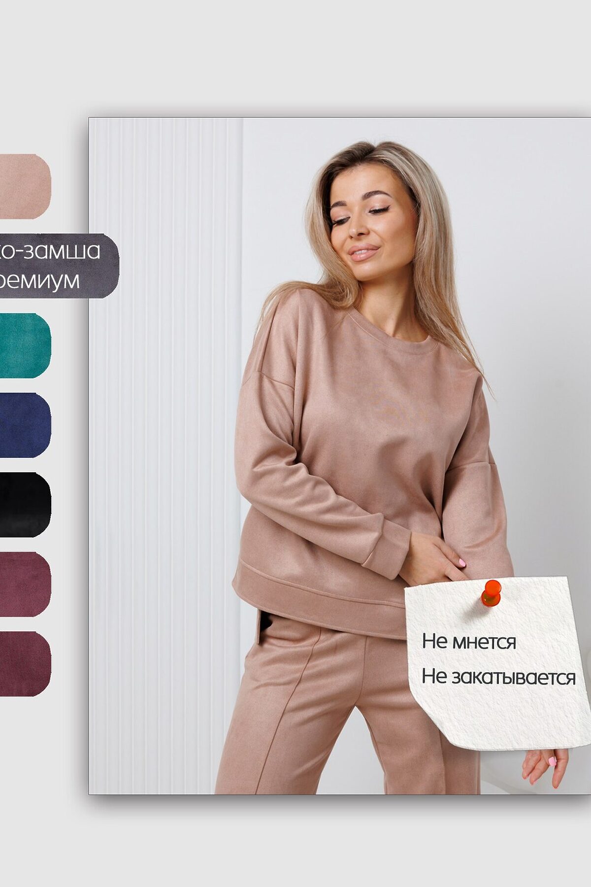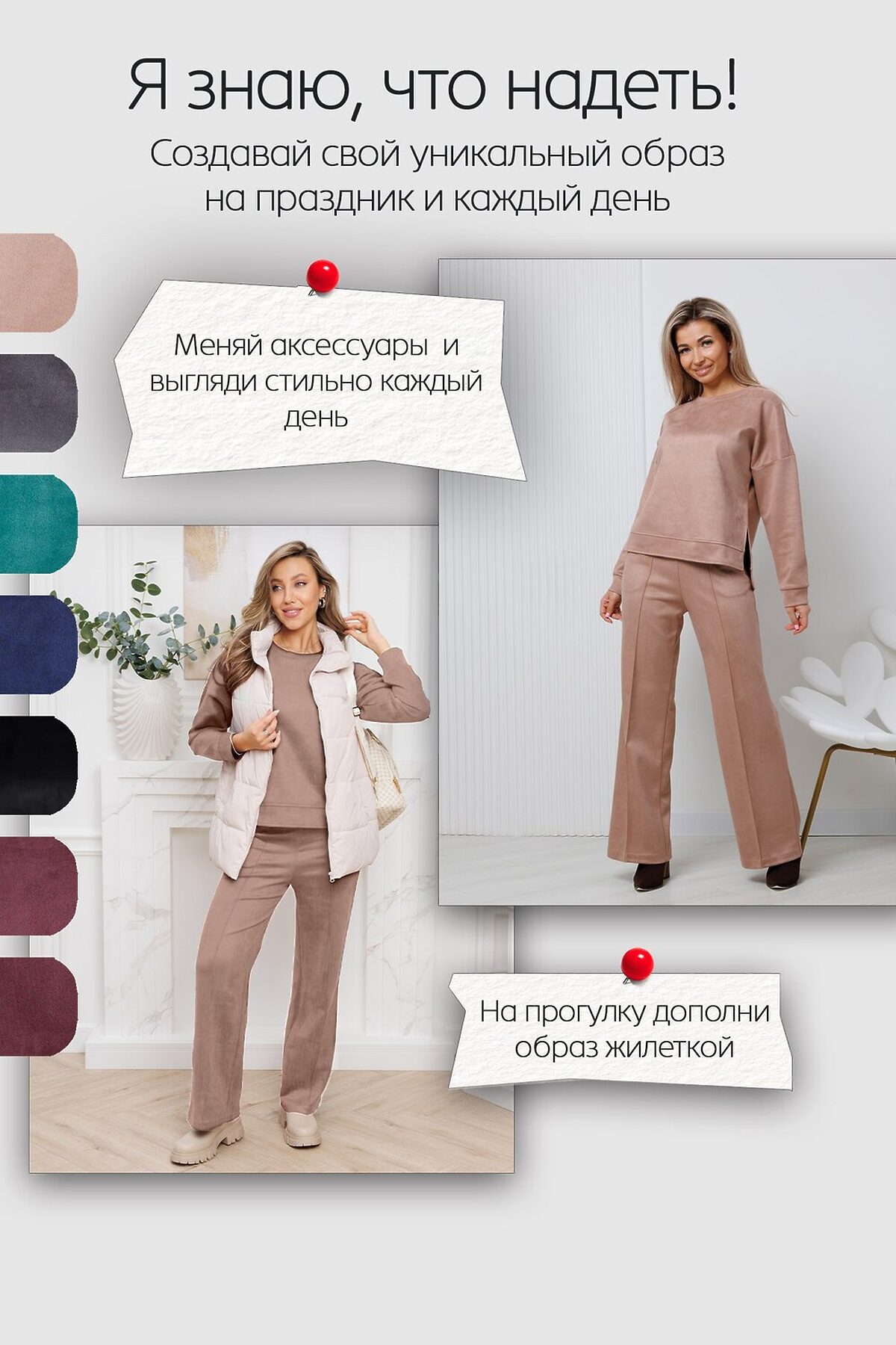 Женский брючный замшевый костюм от российского производителя бренда женской одежды. Невероятно мягкий, удобный теплый комплект из замшевого материала приятного к телу в составе лонгслива и свободных брюк палаццо. Свитшот с длинным рукавом, округлым вырезом горловины. Разрезы по боковым швам кофты и асимметричный крой верха с удлиненной спинкой. Прямые брюки с широкой резинкой на поясе, карманами с отрезным бочком и эффектными отстроченными стрелками по фасаду изделия стойнят силуэт. Необычное дизайнерское решение позволило совместить элегантную классику и эффектный стиль. Базовый вариант подойдет для повседневного ношения в офис или на деловую встречу. На любом мероприятии Вы будете чувствовать себя нарядно и комфортно. Стильный классический костюм подойдет для любого вечера или праздника. Универсальность модели позволит носить его, как в теплые весенний и летний сезоны, так и в холодное время года осень зима. Комплект подойдет для женщин невысокого роста, а также для высоких девушек. Такая двойка гармонично впишется в спортивный или домашний стиль. Трендовый дизайн с элементами олд мани создает шикарный и современный вид. Модель выполнена из легкой, но теплой ткани, что делает ее идеальной для прохладной погоды. Свободные брюки палаццо обеспечивают удобство движения, а джемпер сохраняет тепло. Каждый элемент костюма может носиться отдельно в сочетании с другими элементами гардероба, создавая модные образы. Трендовый костюм позволит подчеркнуть стройность Вашей фигуры. Модель доступна в больших размерах плюс сайз - 50, 52 и 54, будет шикарно смотреться в любом возрасте, подойдет для полных девушек и беременных женщин. Перед использованием рекомендуется предварительная стирка отдельно от других вещей.