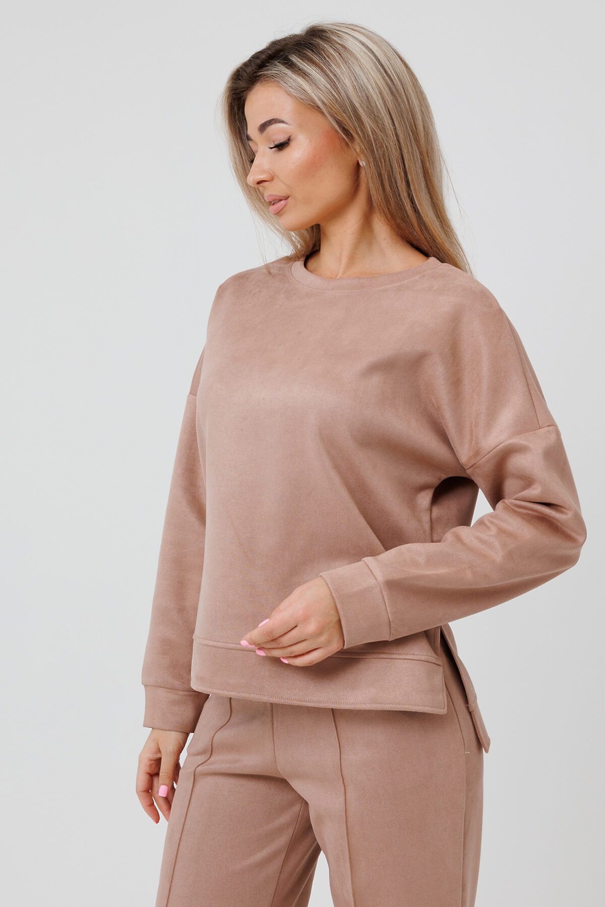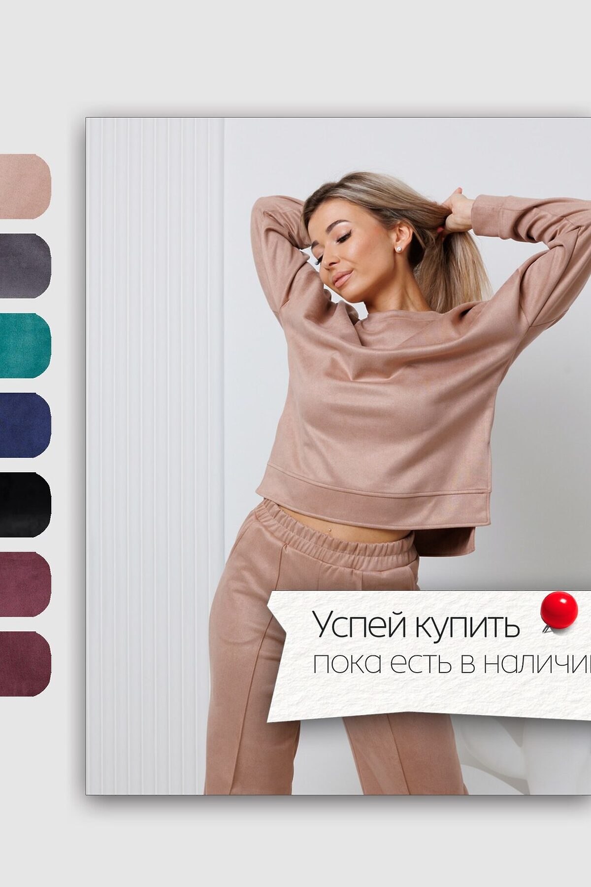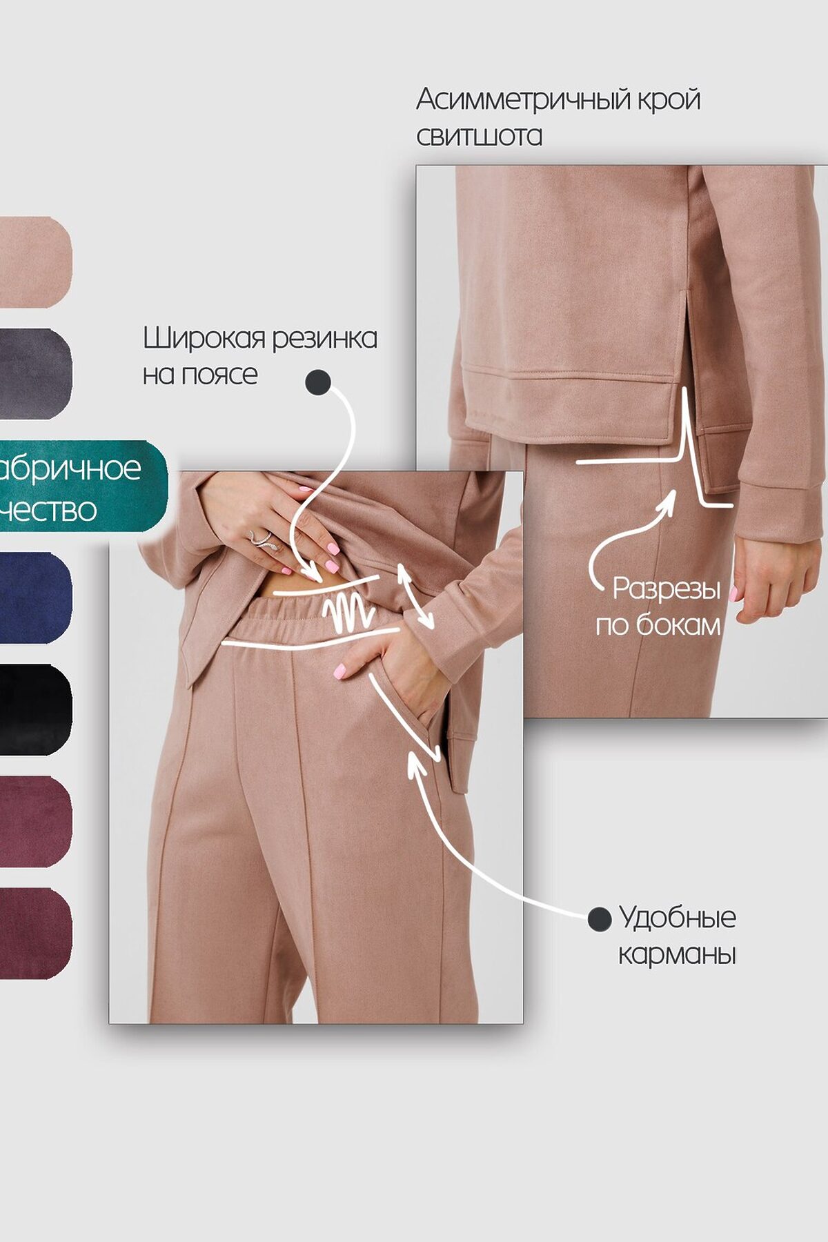 Женский брючный замшевый костюм от российского производителя бренда женской одежды. Невероятно мягкий, удобный теплый комплект из замшевого материала приятного к телу в составе лонгслива и свободных брюк палаццо. Свитшот с длинным рукавом, округлым вырезом горловины. Разрезы по боковым швам кофты и асимметричный крой верха с удлиненной спинкой. Прямые брюки с широкой резинкой на поясе, карманами с отрезным бочком и эффектными отстроченными стрелками по фасаду изделия стойнят силуэт. Необычное дизайнерское решение позволило совместить элегантную классику и эффектный стиль. Базовый вариант подойдет для повседневного ношения в офис или на деловую встречу. На любом мероприятии Вы будете чувствовать себя нарядно и комфортно. Стильный классический костюм подойдет для любого вечера или праздника. Универсальность модели позволит носить его, как в теплые весенний и летний сезоны, так и в холодное время года осень зима. Комплект подойдет для женщин невысокого роста, а также для высоких девушек. Такая двойка гармонично впишется в спортивный или домашний стиль. Трендовый дизайн с элементами олд мани создает шикарный и современный вид. Модель выполнена из легкой, но теплой ткани, что делает ее идеальной для прохладной погоды. Свободные брюки палаццо обеспечивают удобство движения, а джемпер сохраняет тепло. Каждый элемент костюма может носиться отдельно в сочетании с другими элементами гардероба, создавая модные образы. Трендовый костюм позволит подчеркнуть стройность Вашей фигуры. Модель доступна в больших размерах плюс сайз - 50, 52 и 54, будет шикарно смотреться в любом возрасте, подойдет для полных девушек и беременных женщин. Перед использованием рекомендуется предварительная стирка отдельно от других вещей.